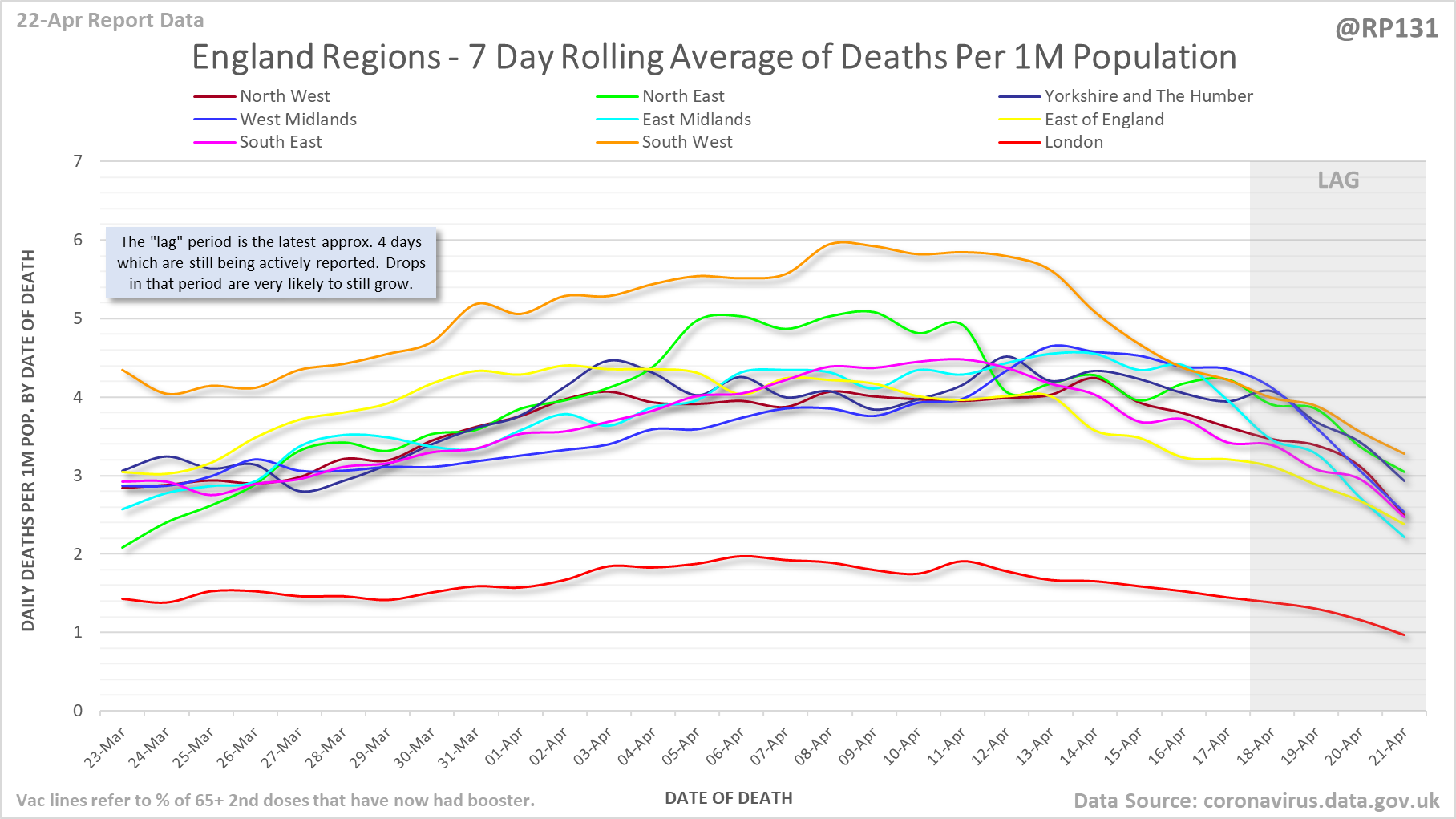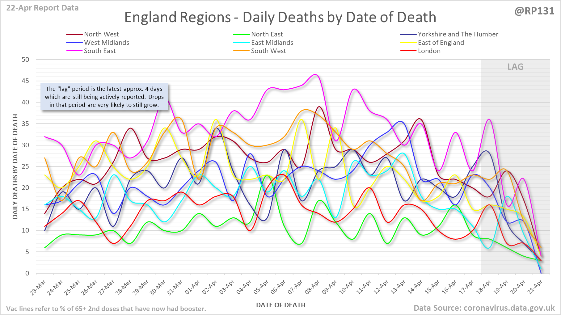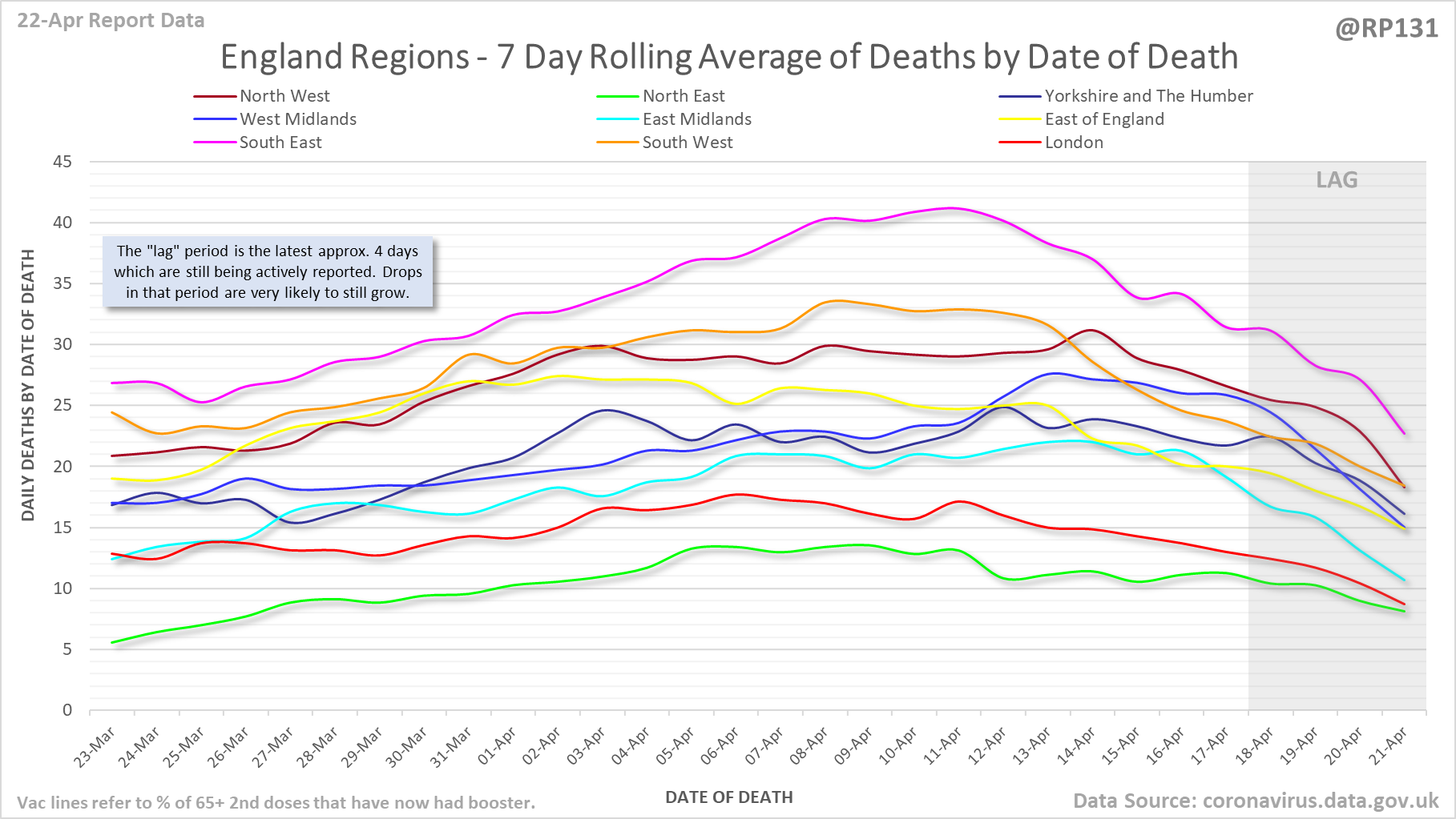 [5/24] Date of Death chart for England regions drawn with 7 day rolling averages.