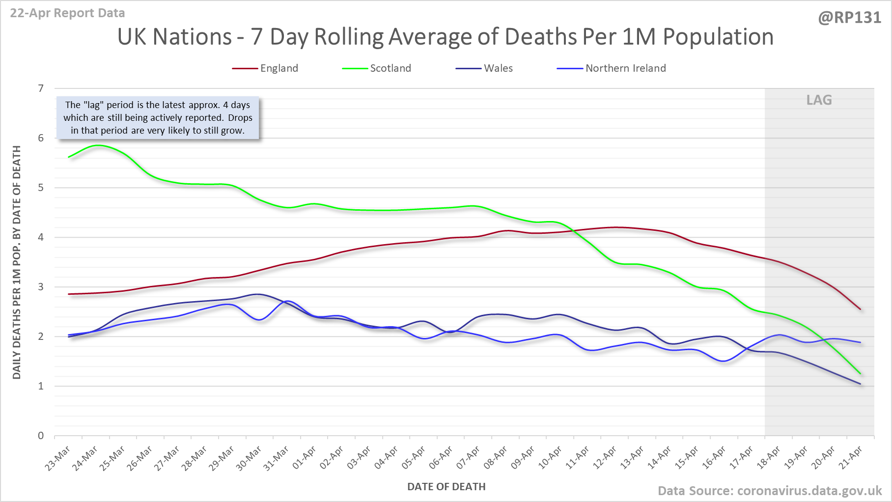 [7/24] Date of death chart for UK nations drawn with 7 day rolling averages of deaths per 1M population.