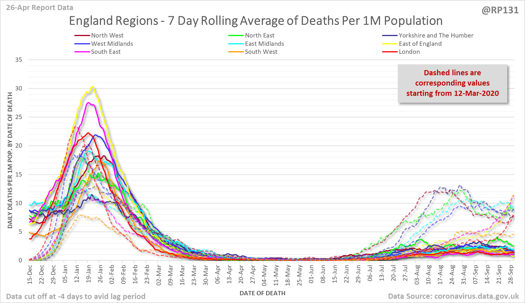 [10/24] England region date of death chart with curves from first wave roughly overlaid.