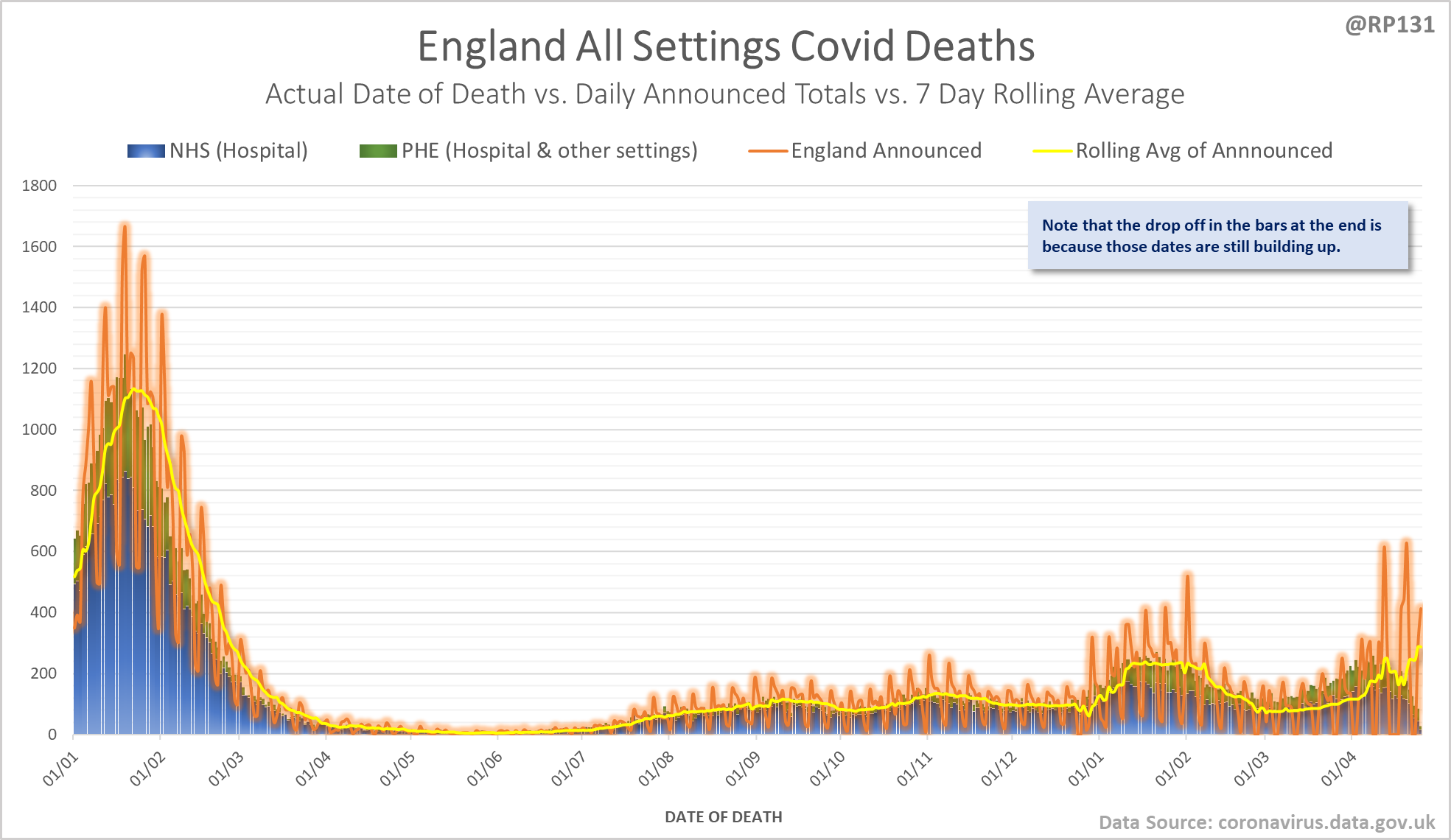 [11/24] England date-of-death vs. announcement chart. Note that the numbers drop at the end as data is still being actively reported for those dates.