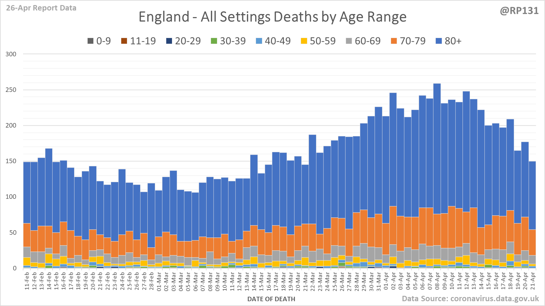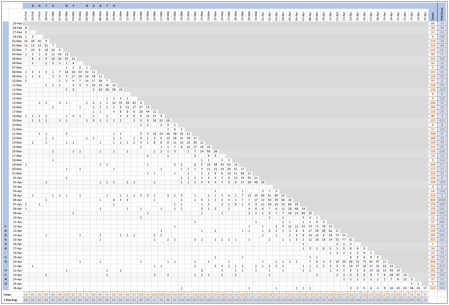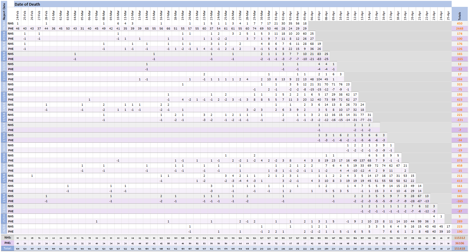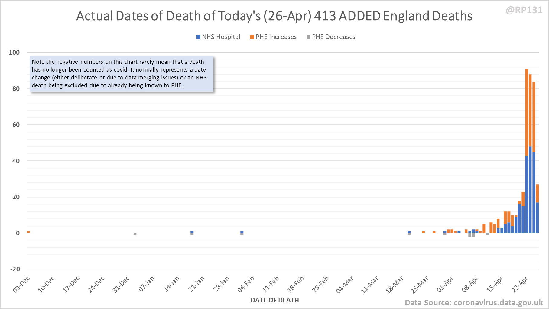[13/24] Pivot for 26-Apr to show breakdown of both 223 NHS and 190 (net) PHE deaths by date of death. The negatives are a combination of date of death corrections and accounting for NHS deaths that were already known to PHE. Small version for twitter first: