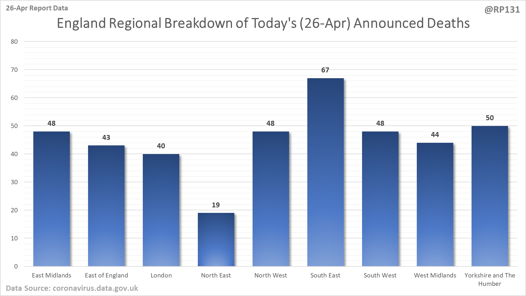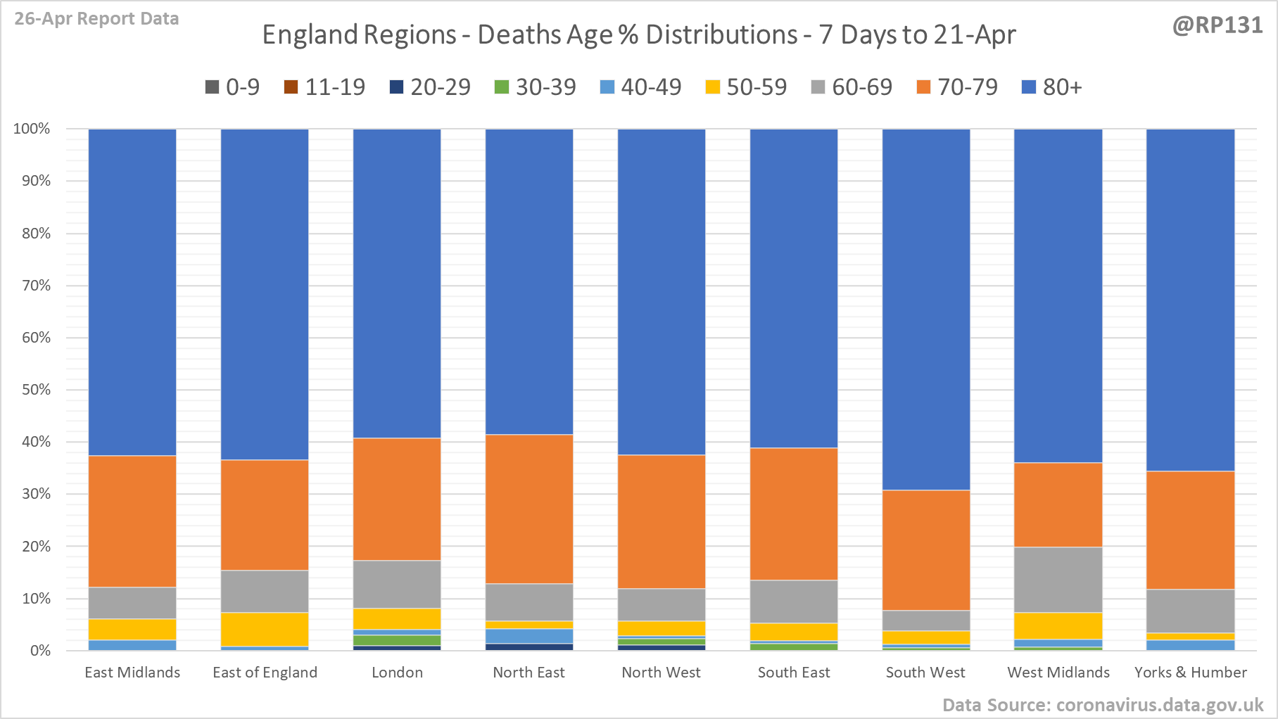 [21/24] Breakdown of today's newly reported England deaths by region. Note that this data (407) doesn't always quite add up to the total England number they announce (413) possibly due to data merging issues. However I still think it's useful to see the general distribution.