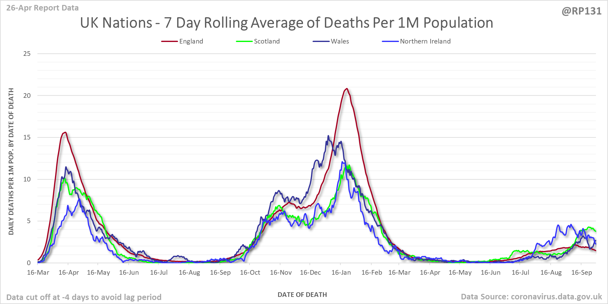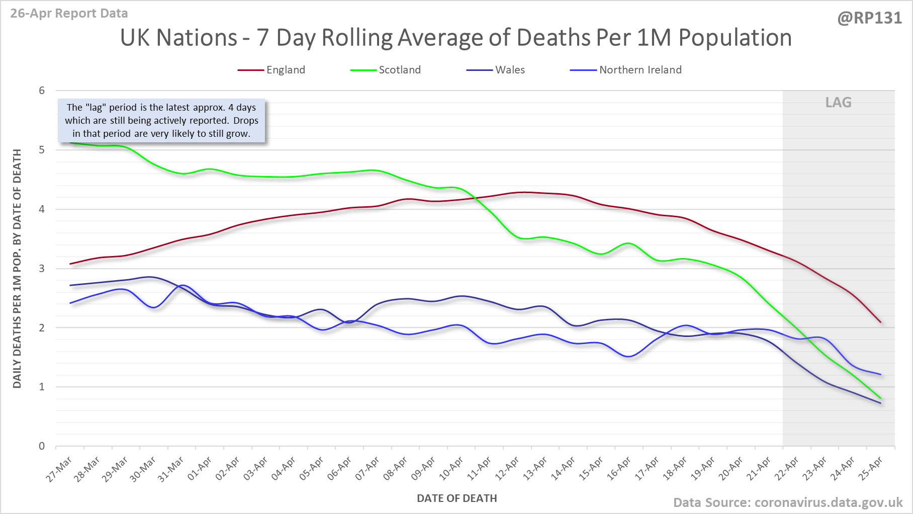 [7/24] Date of death chart for UK nations drawn with 7 day rolling averages of deaths per 1M population.