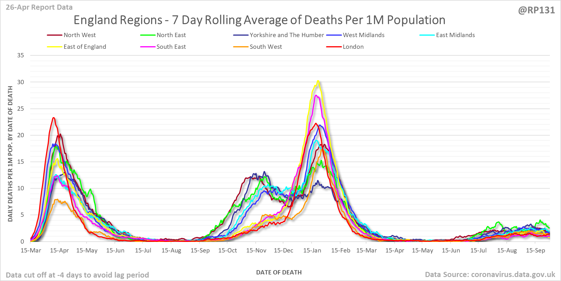 [6/24] Date of death chart for England regions drawn with 7 day rolling averages of deaths per 1M population.