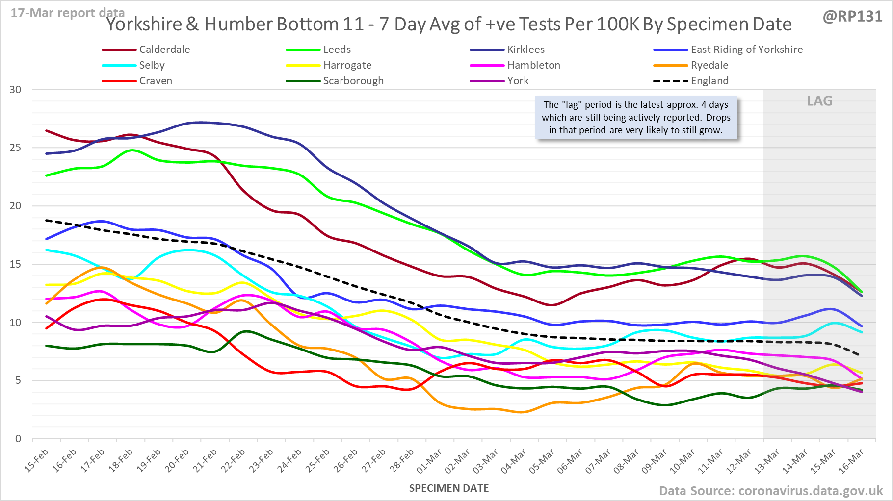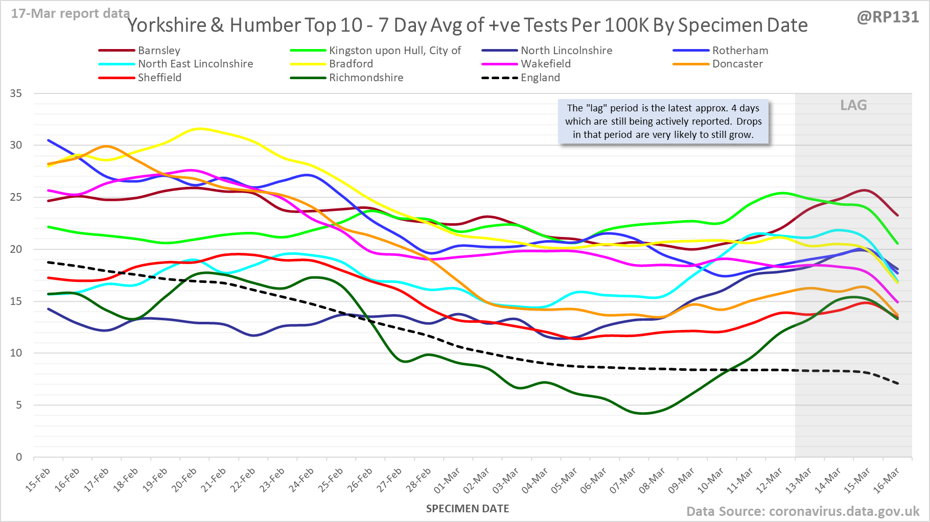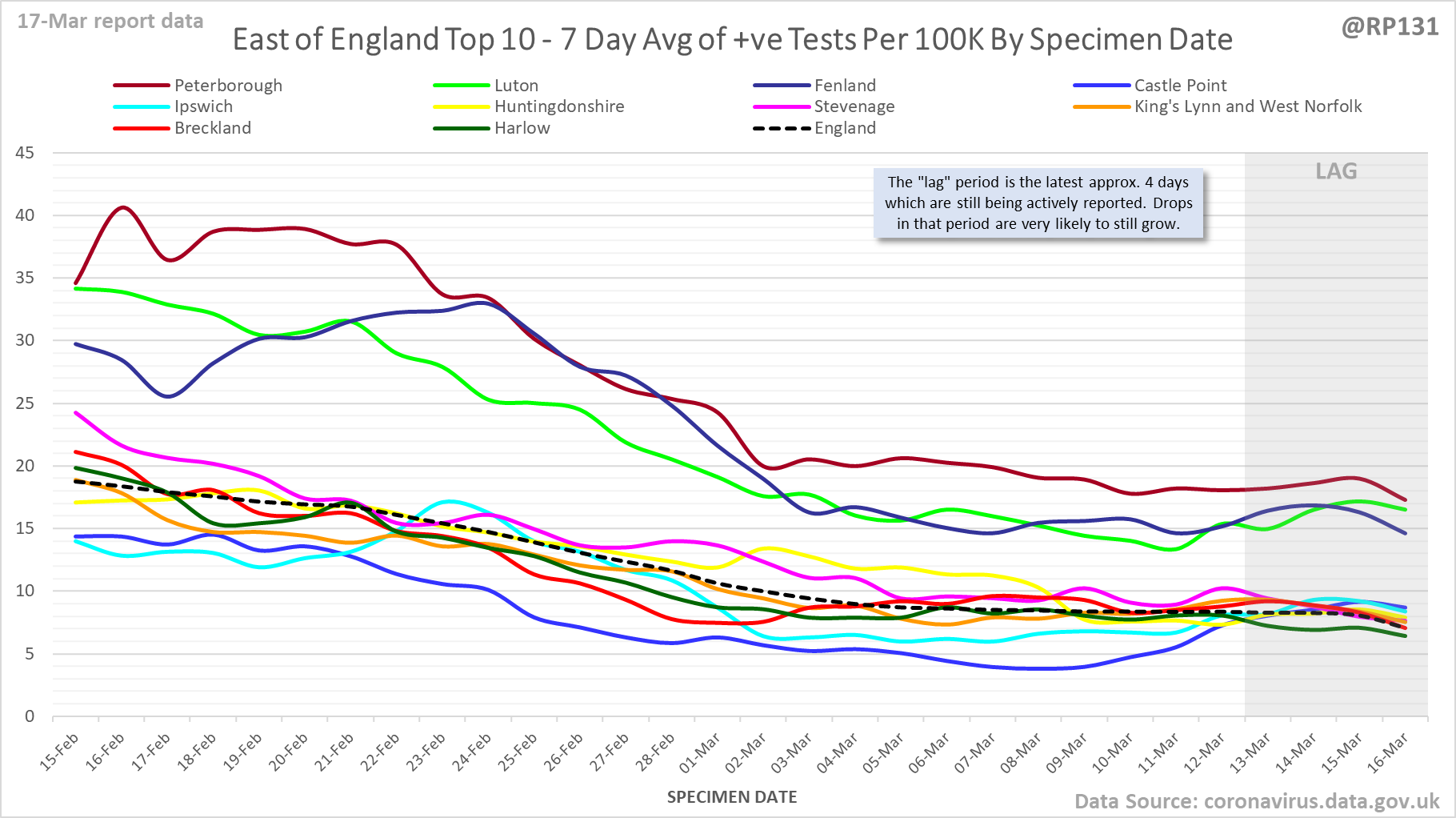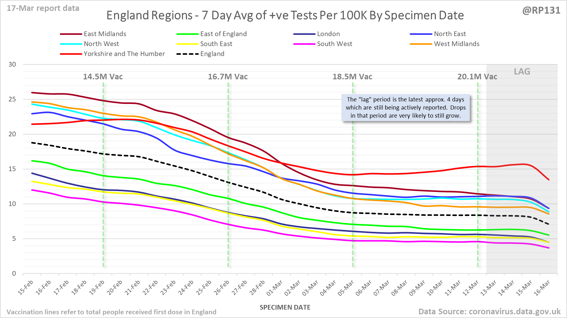 [1/22] #covid19uk - Detailed positive tests thread. The majority of this thread is a set of views of rolling 7 day average positives per 100K by specimen date. Starting with England regions: