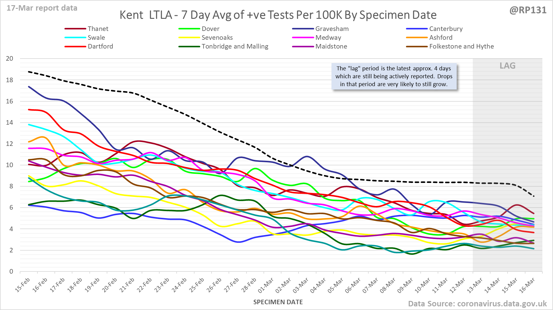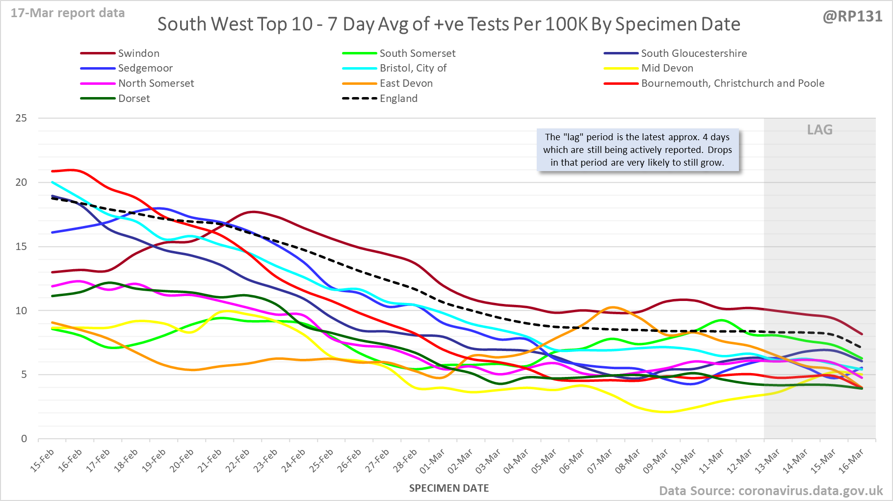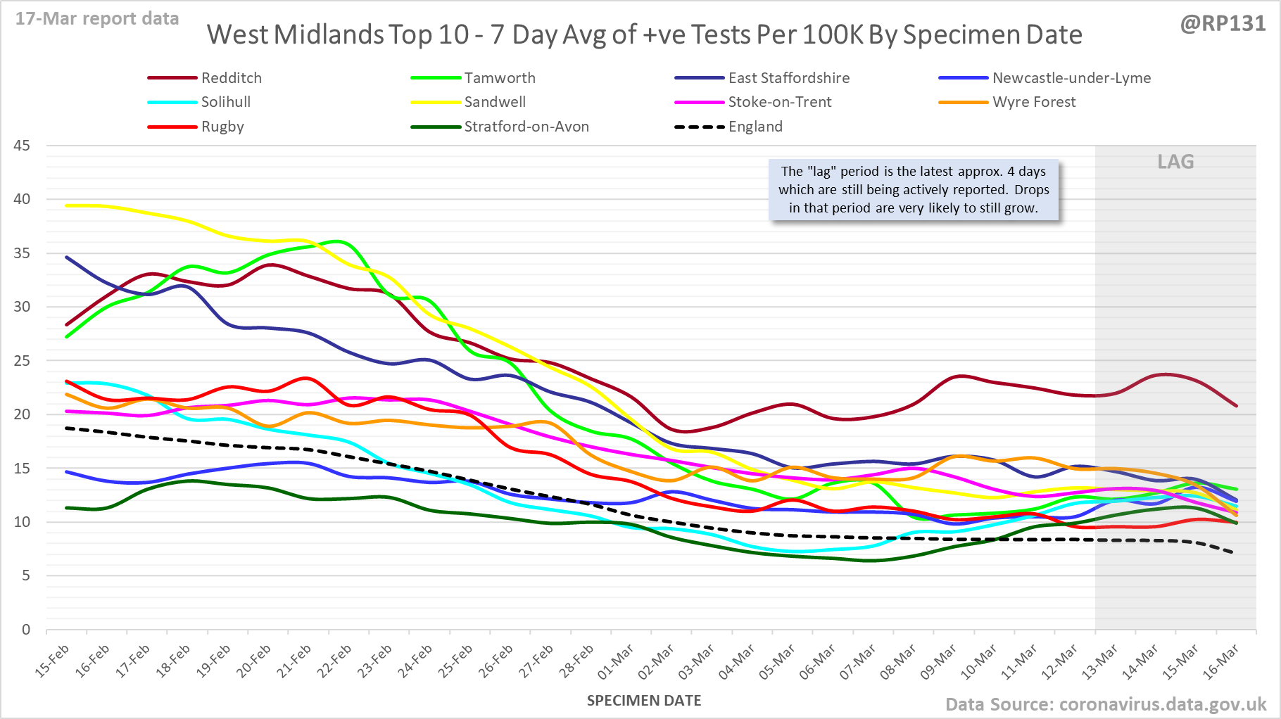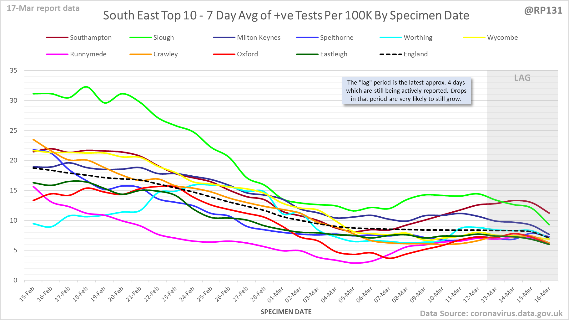 [1/22] #covid19uk - Detailed positive tests thread. The majority of this thread is a set of views of rolling 7 day average positives per 100K by specimen date. Starting with England regions: