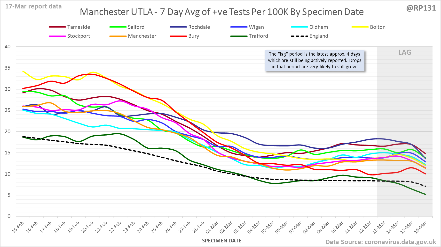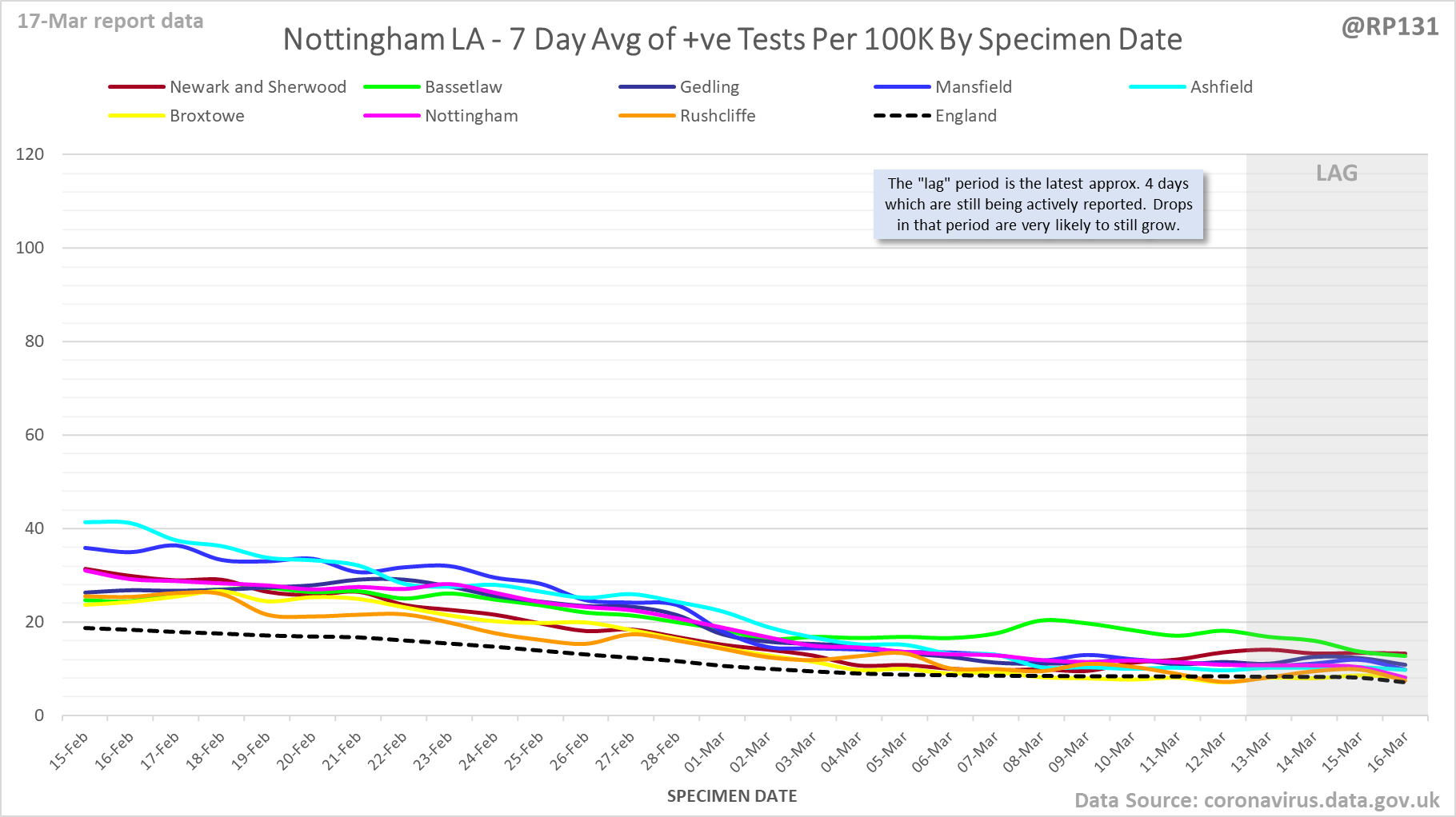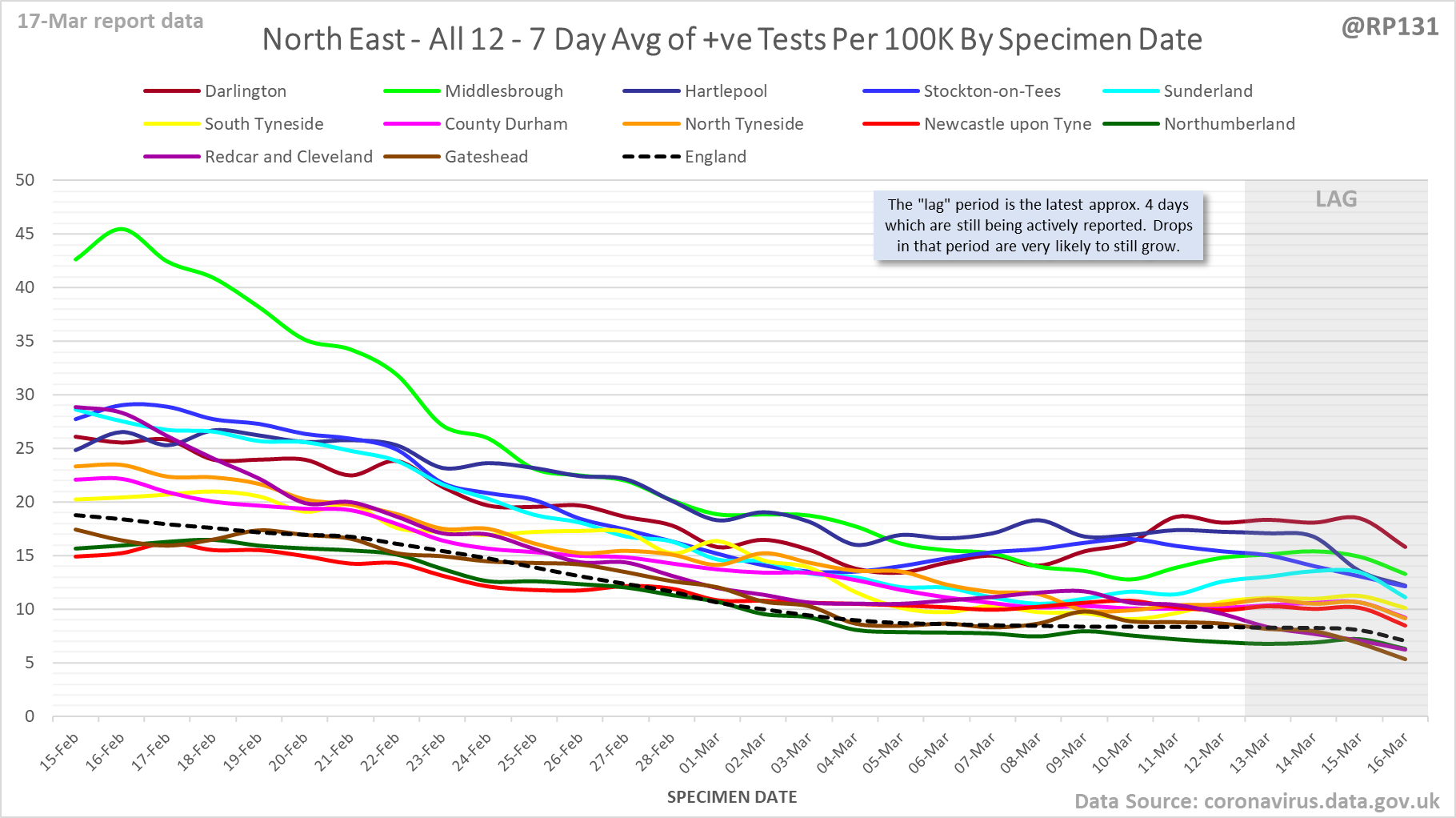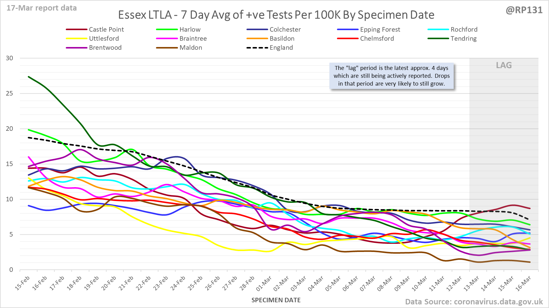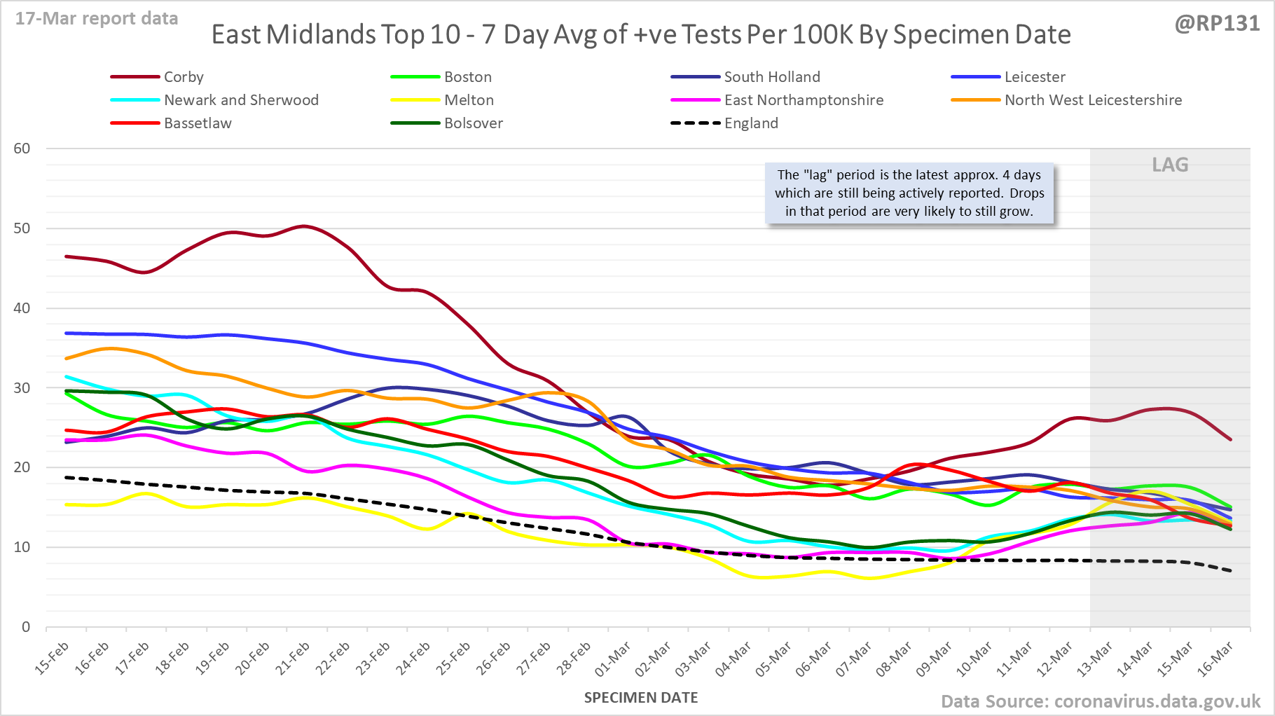 [1/22] #covid19uk - Detailed positive tests thread. The majority of this thread is a set of views of rolling 7 day average positives per 100K by specimen date. Starting with England regions: