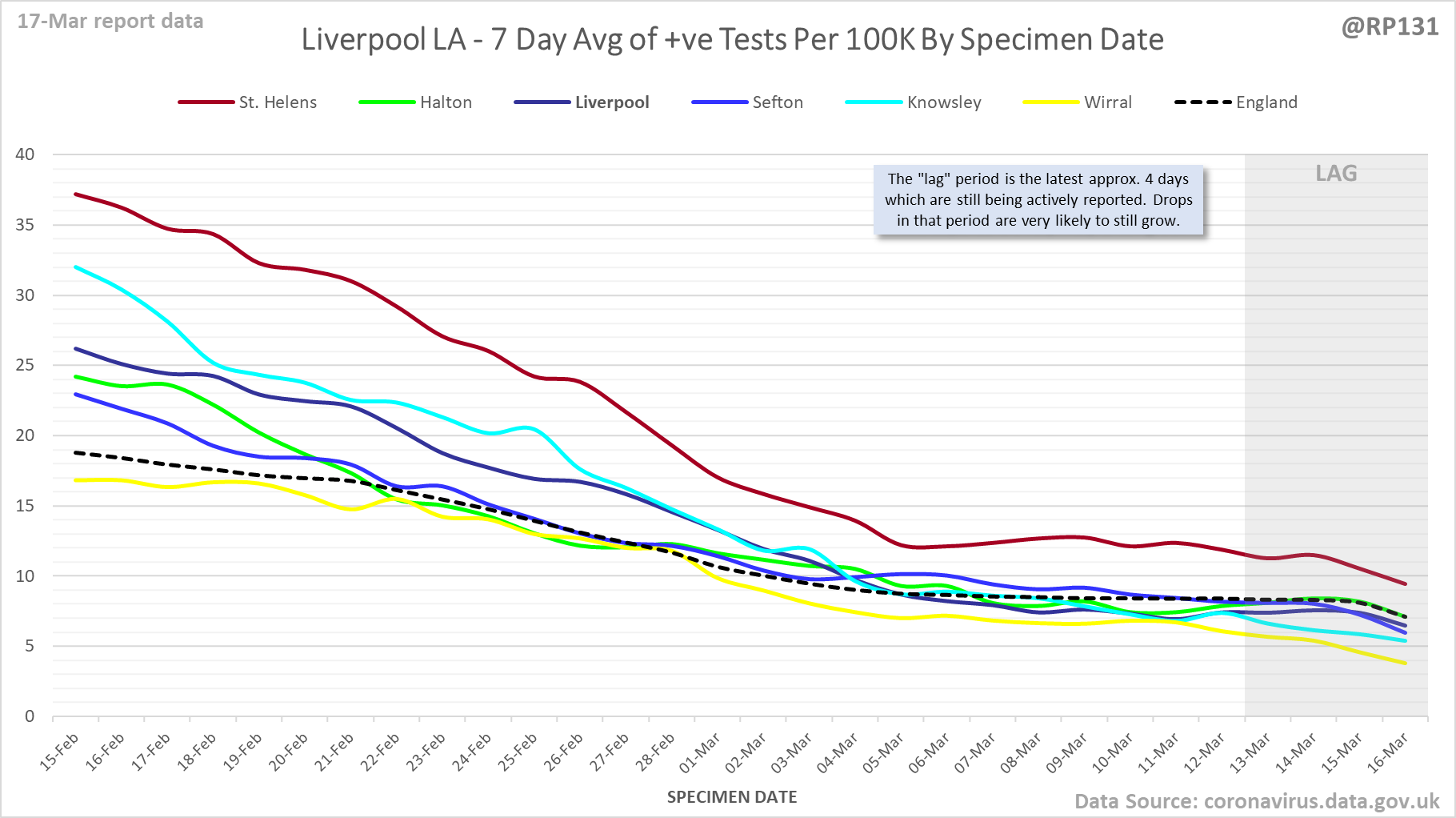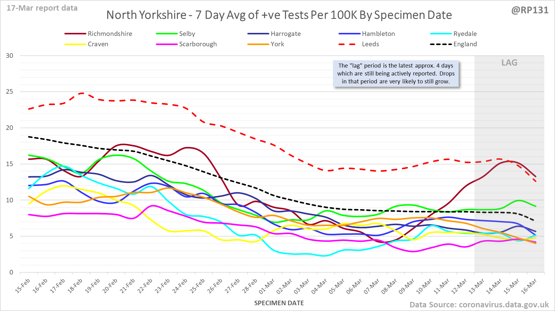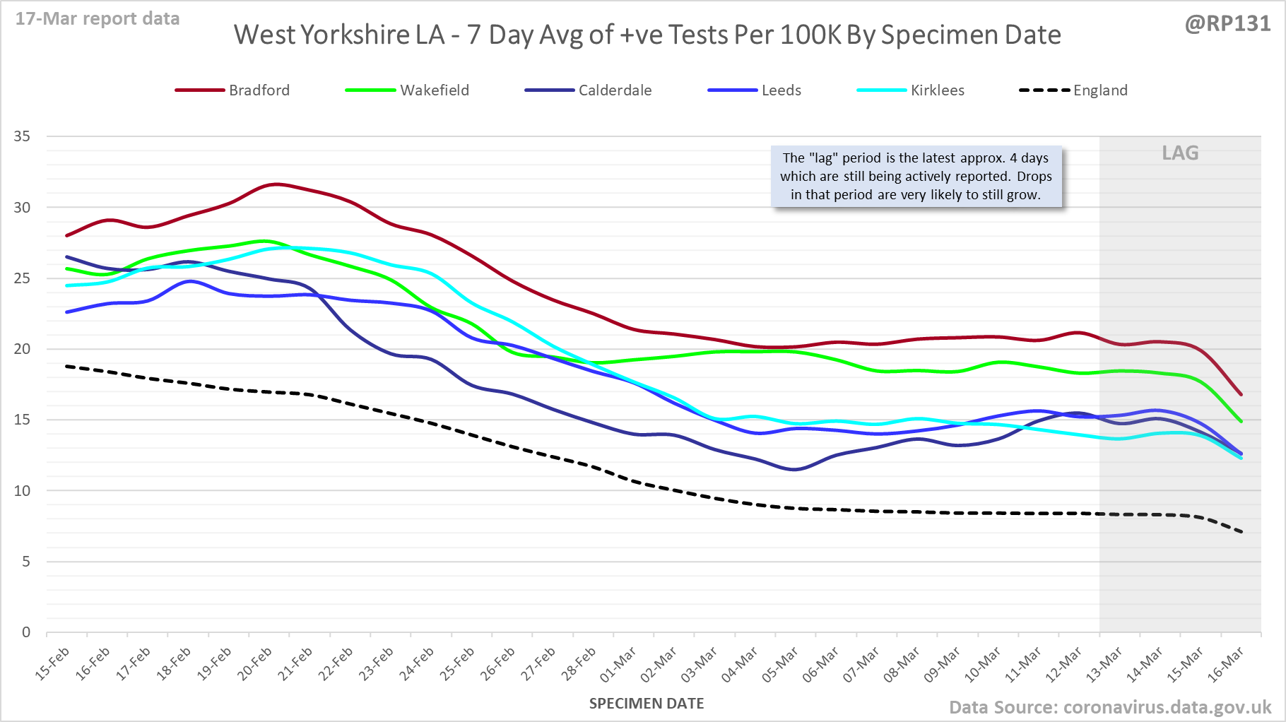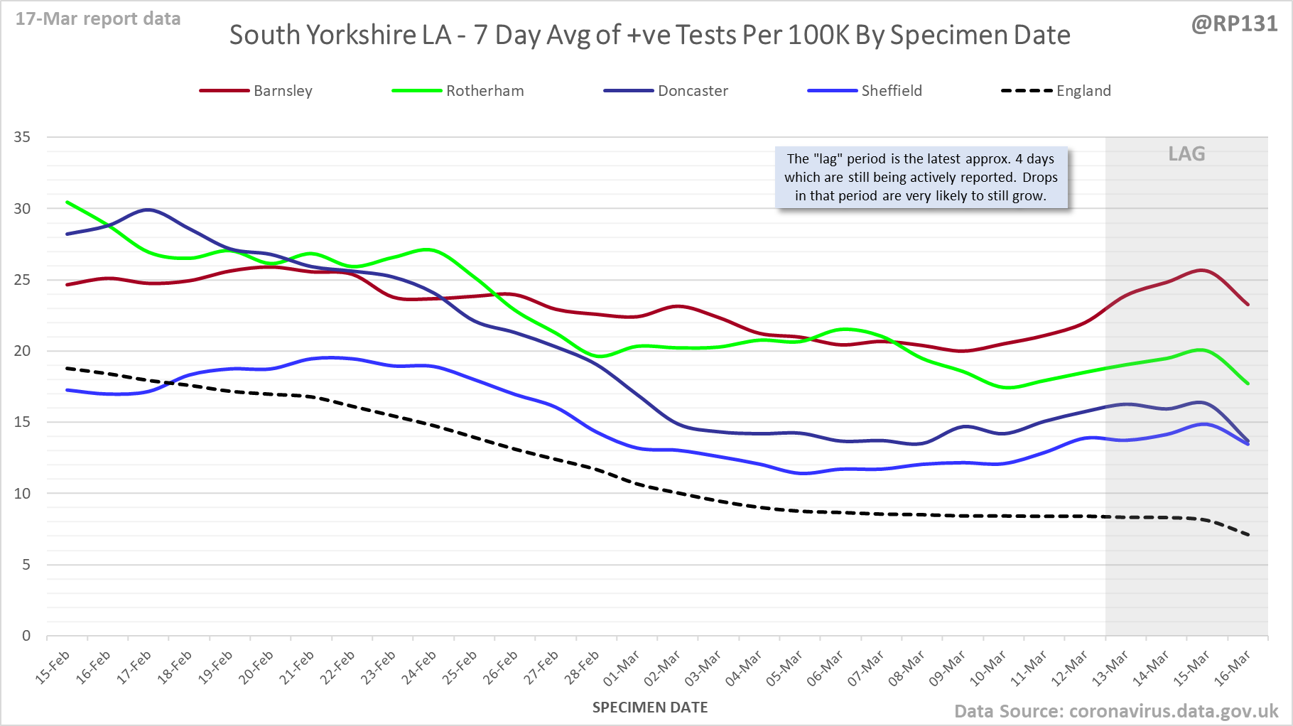 [1/22] #covid19uk - Detailed positive tests thread. The majority of this thread is a set of views of rolling 7 day average positives per 100K by specimen date. Starting with England regions: