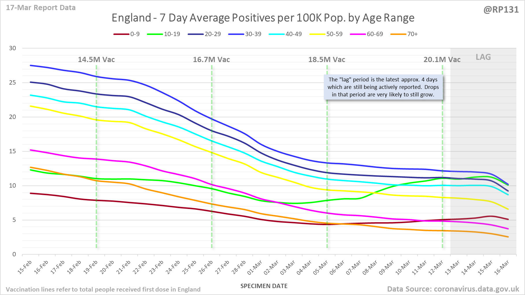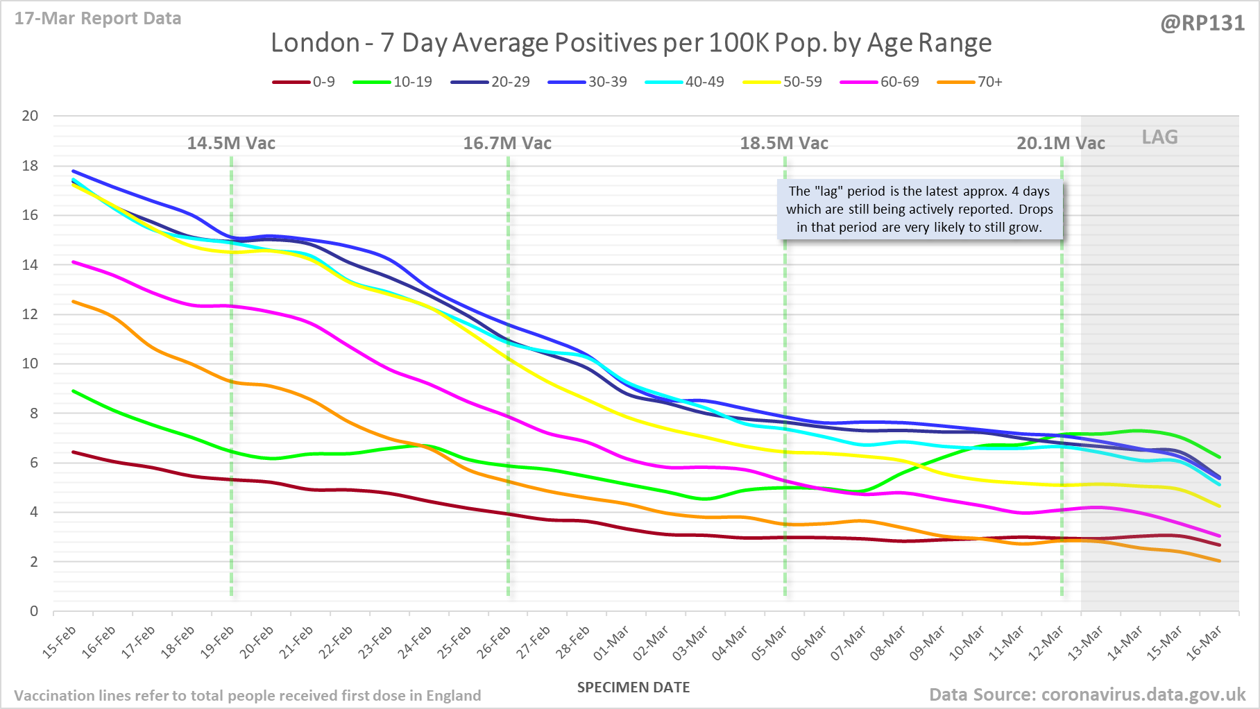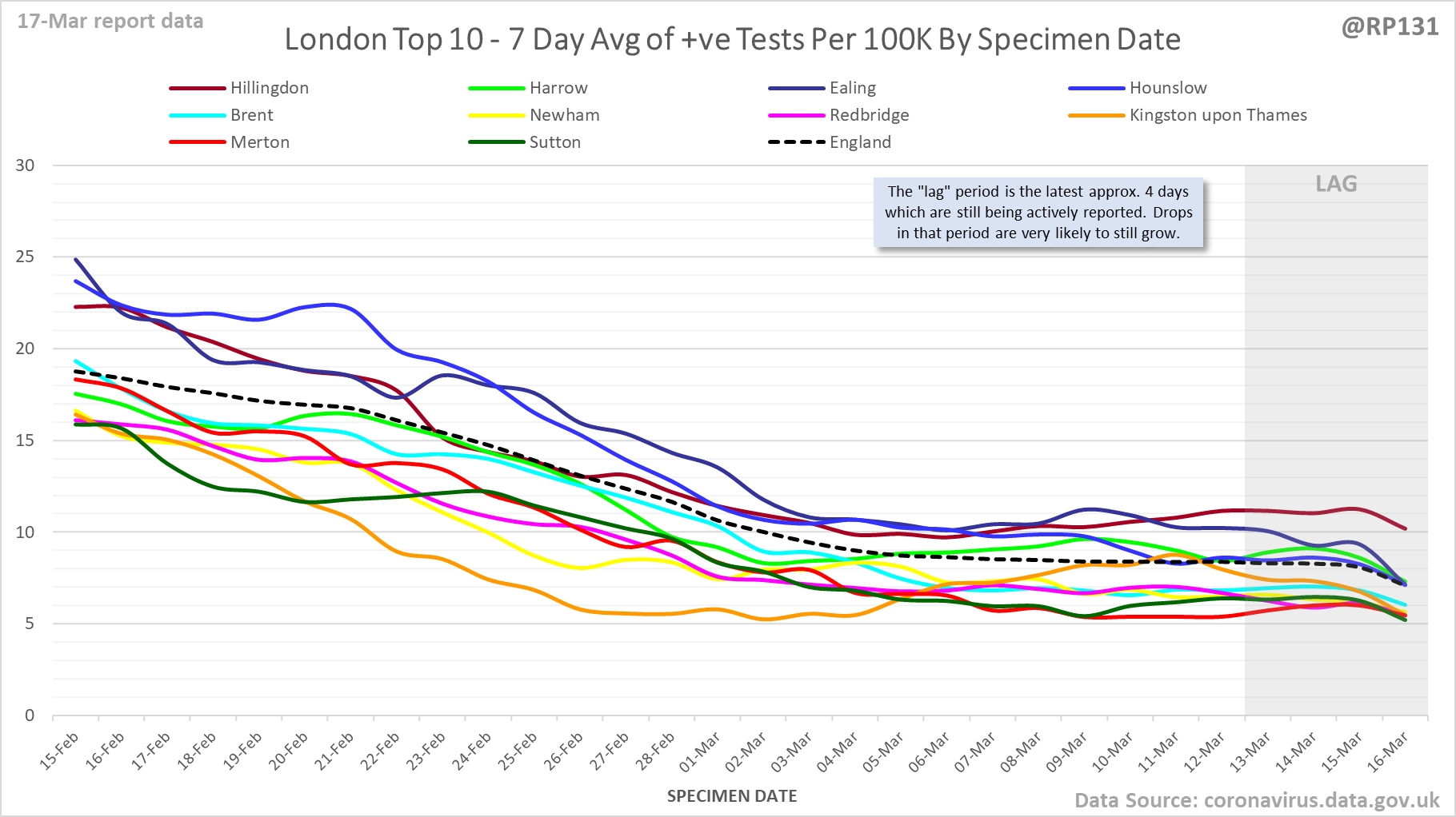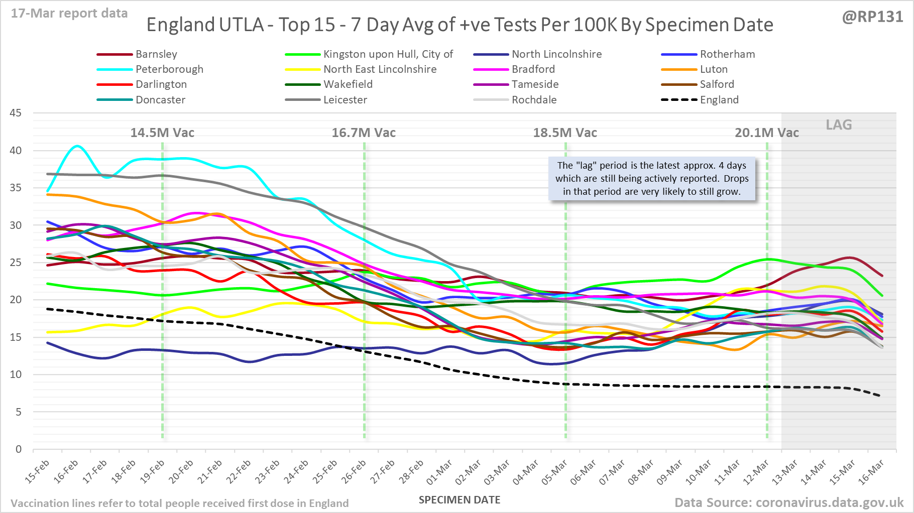 [1/22] #covid19uk - Detailed positive tests thread. The majority of this thread is a set of views of rolling 7 day average positives per 100K by specimen date. Starting with England regions: