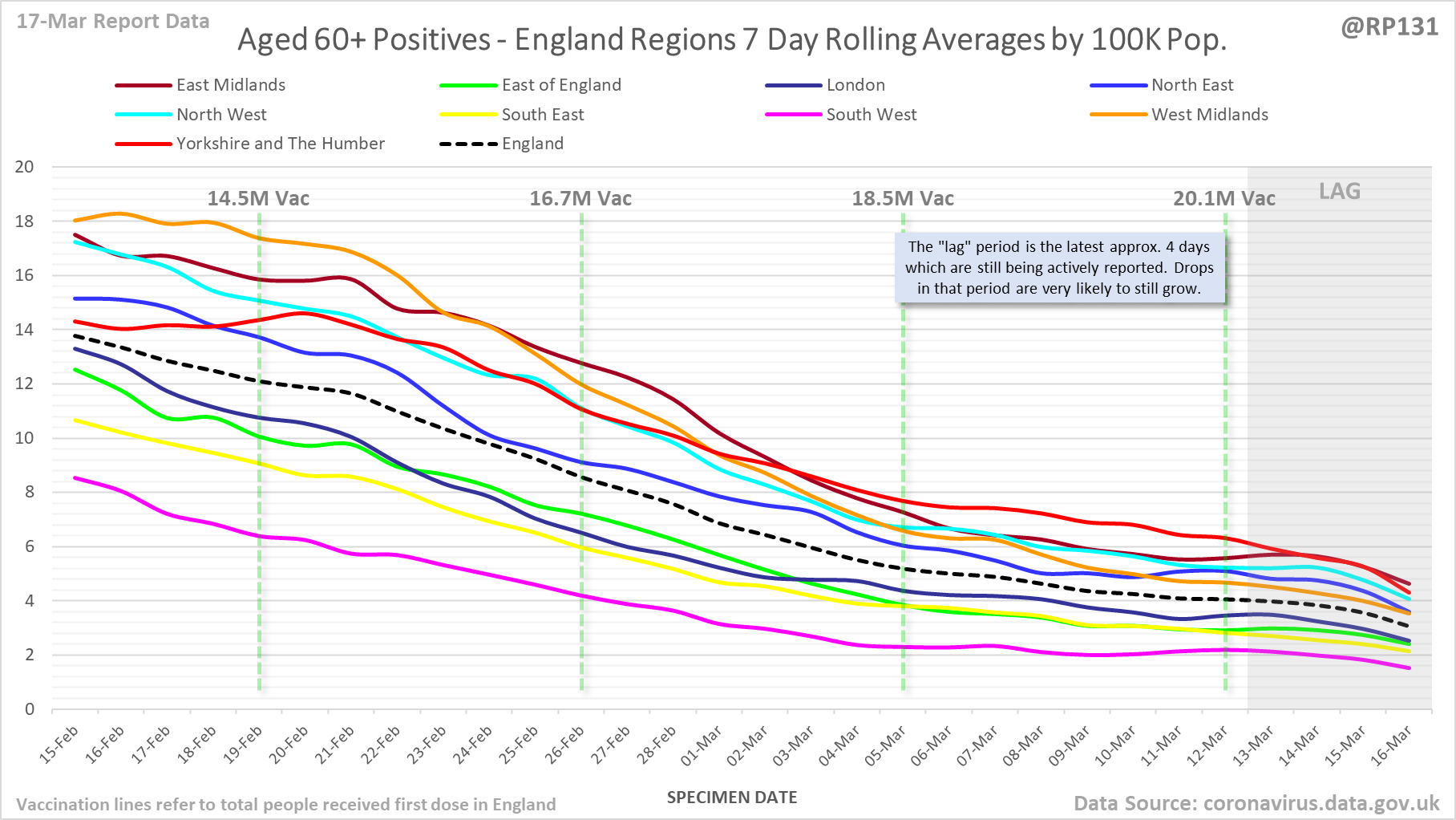 [20/22] England regional rolling average positives (per 100K population) in the 60+ age range: