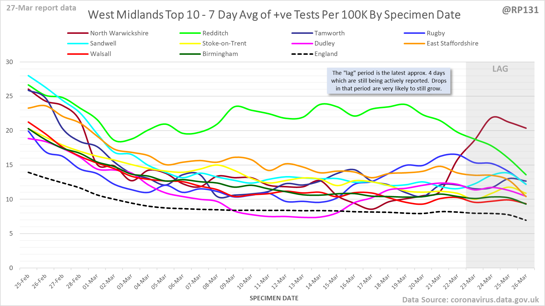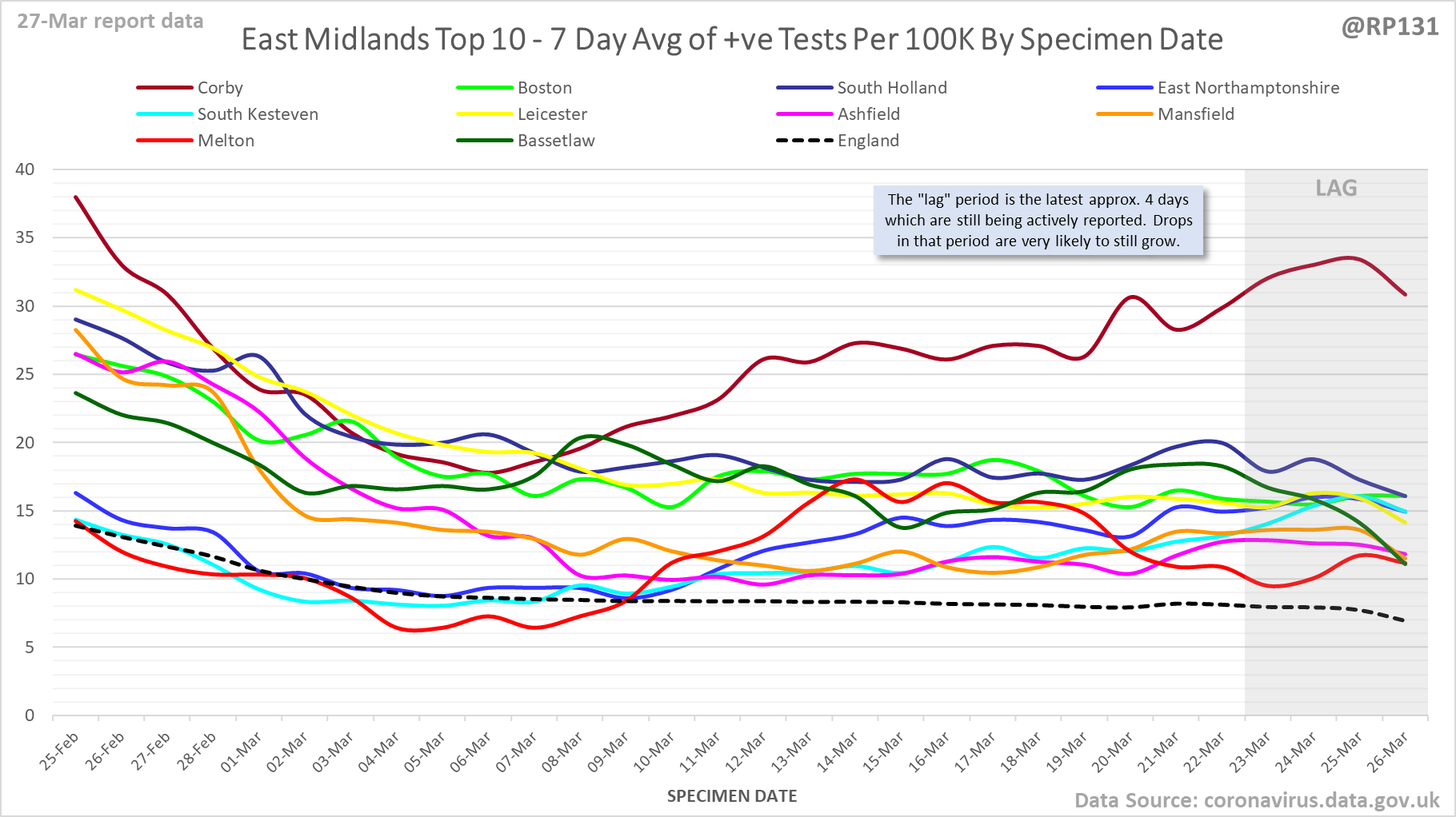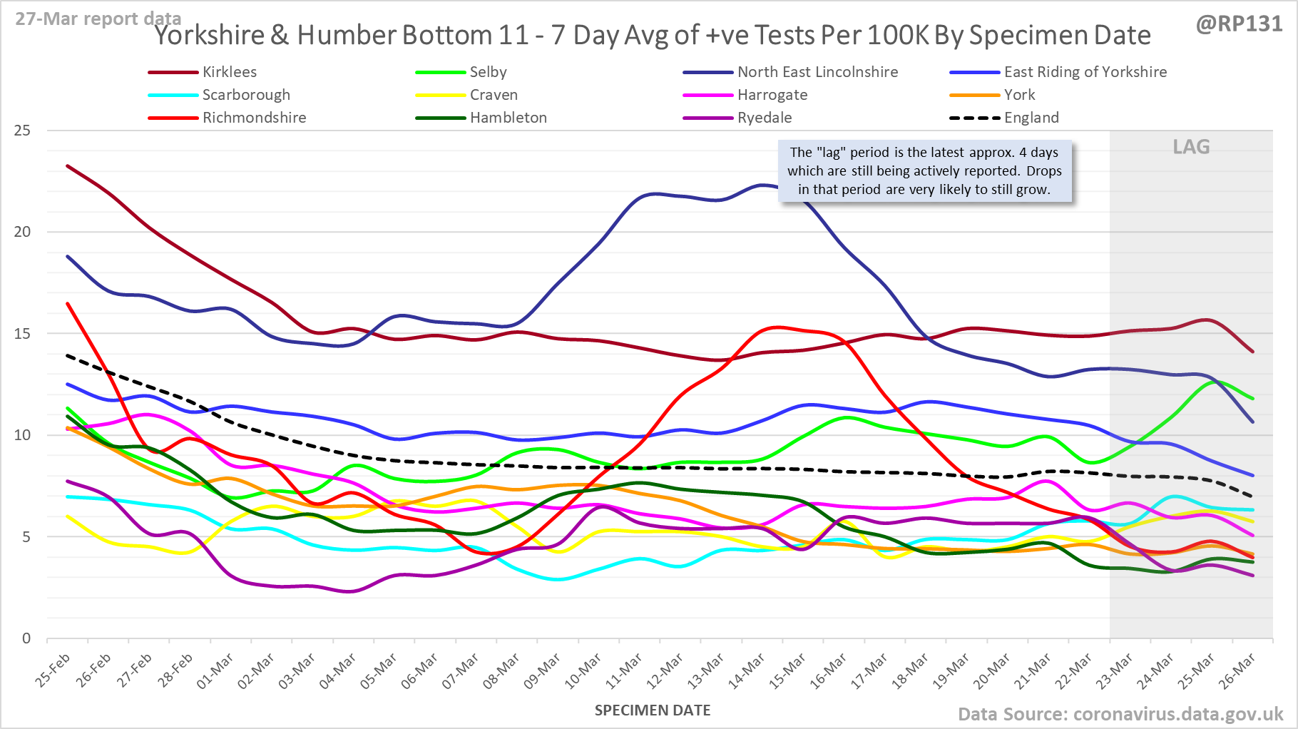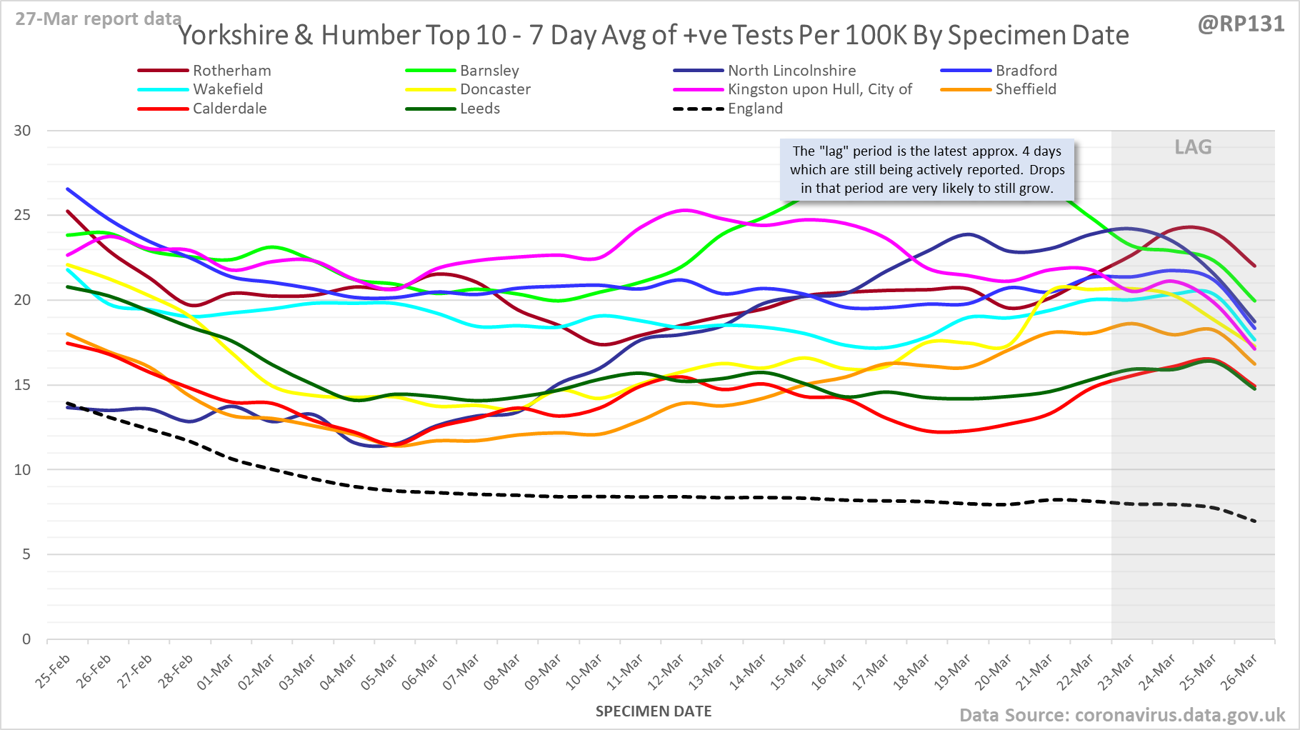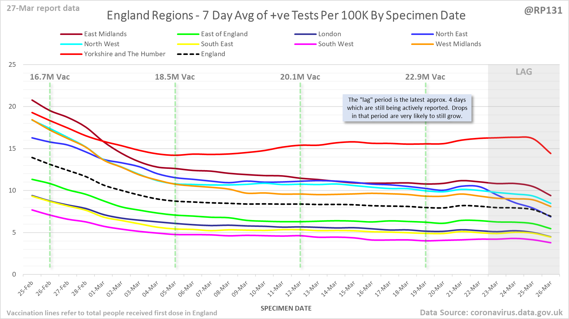 [1/22] #covid19uk - Detailed positive tests thread. The majority of this thread is a set of views of rolling 7 day average positives per 100K by specimen date. Starting with England regions: