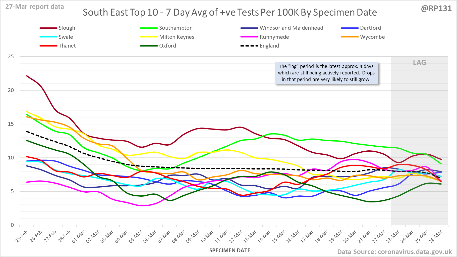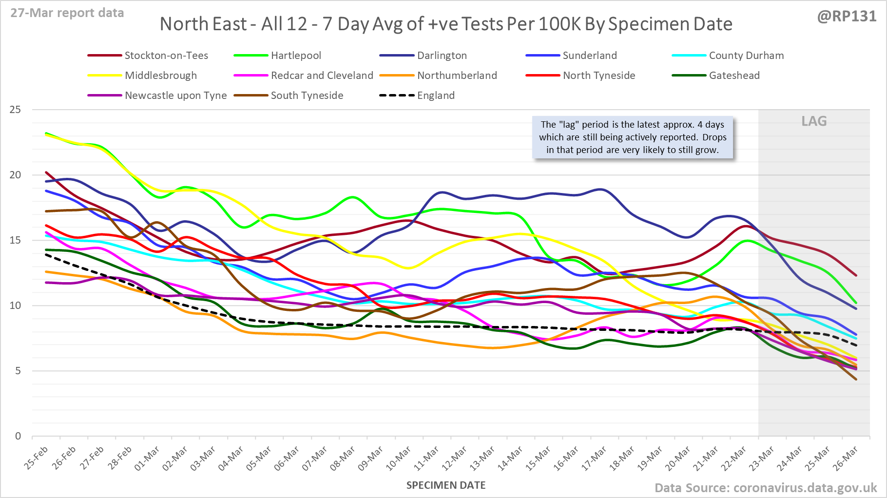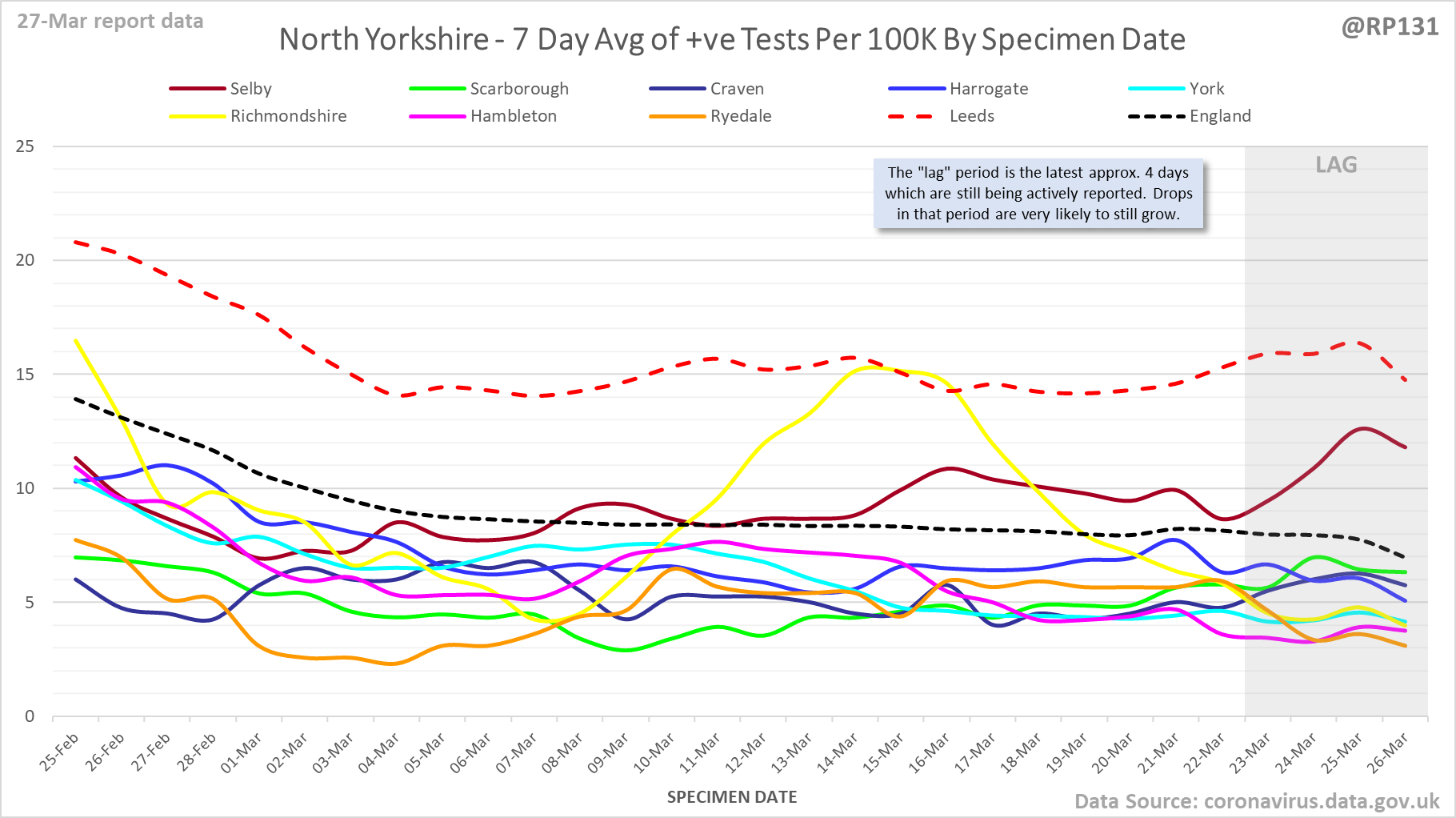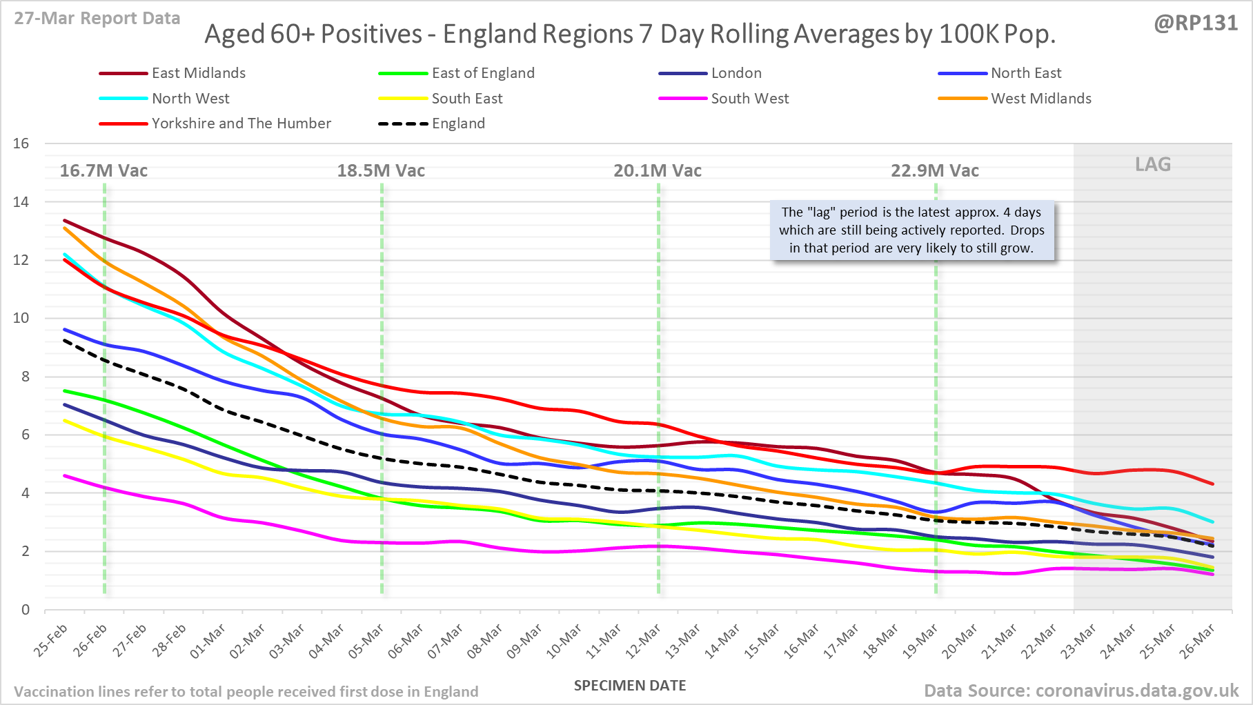 [1/22] #covid19uk - Detailed positive tests thread. The majority of this thread is a set of views of rolling 7 day average positives per 100K by specimen date. Starting with England regions: