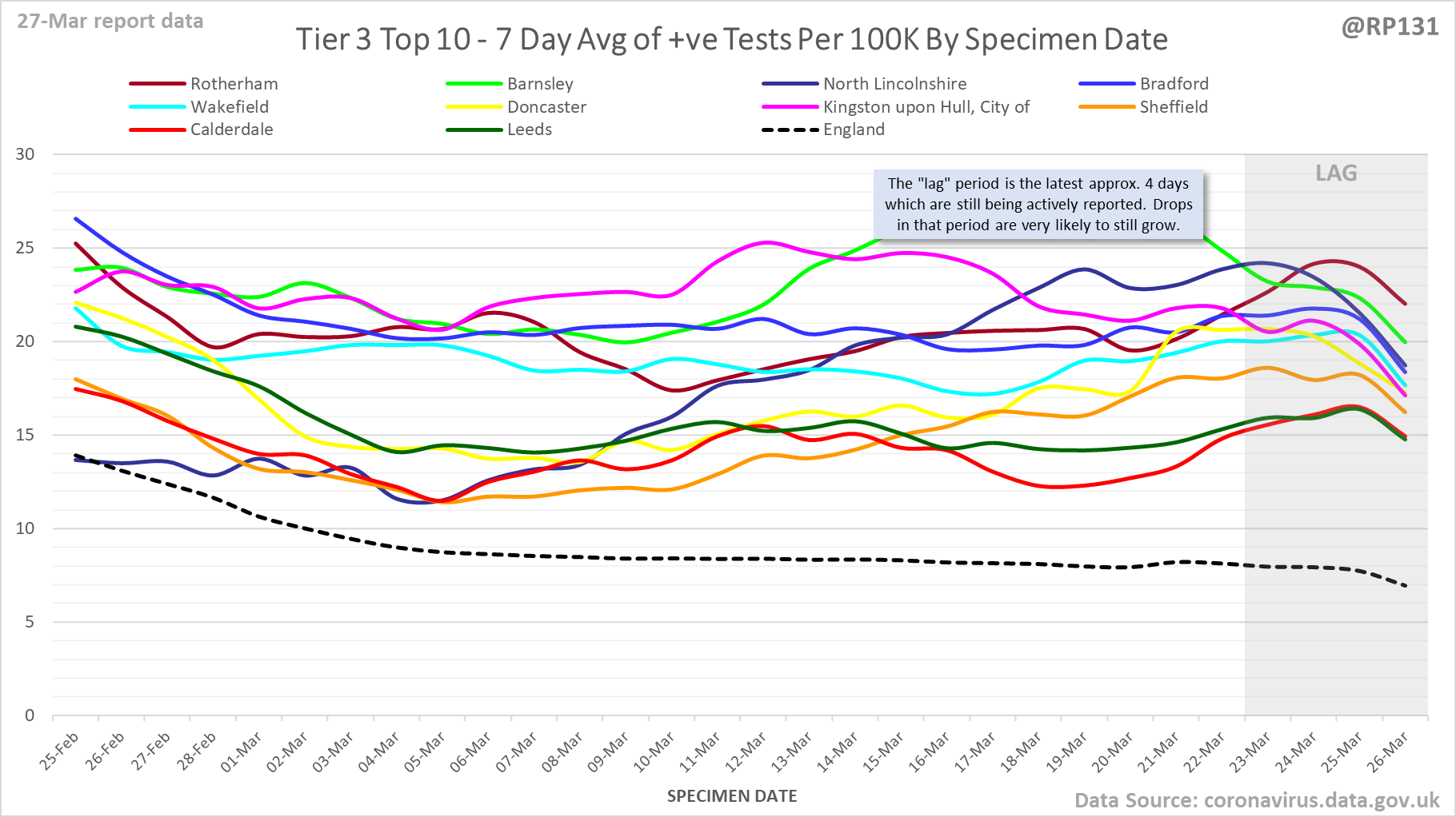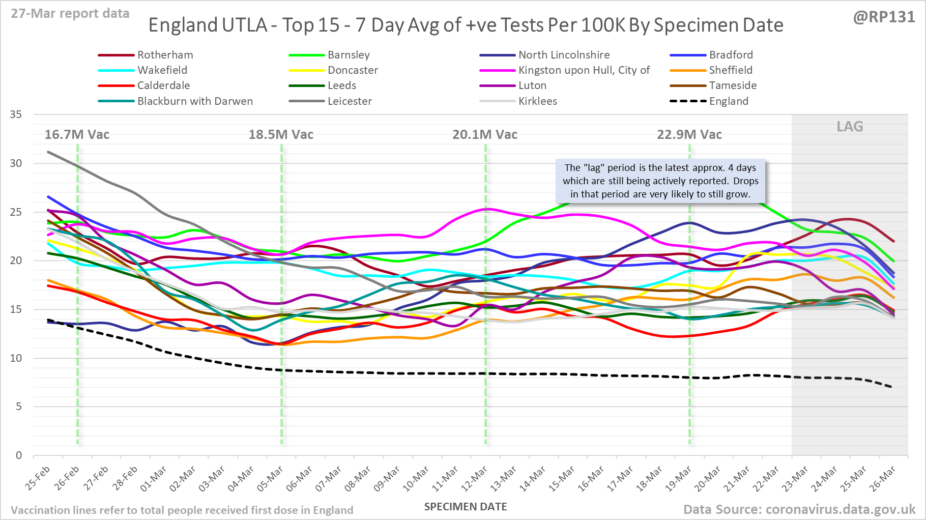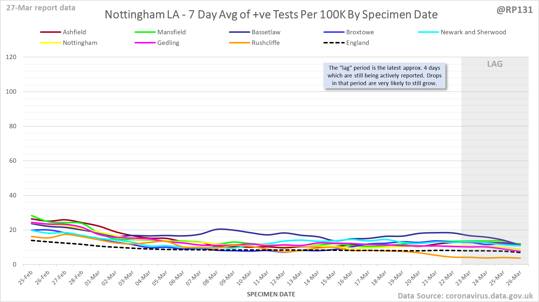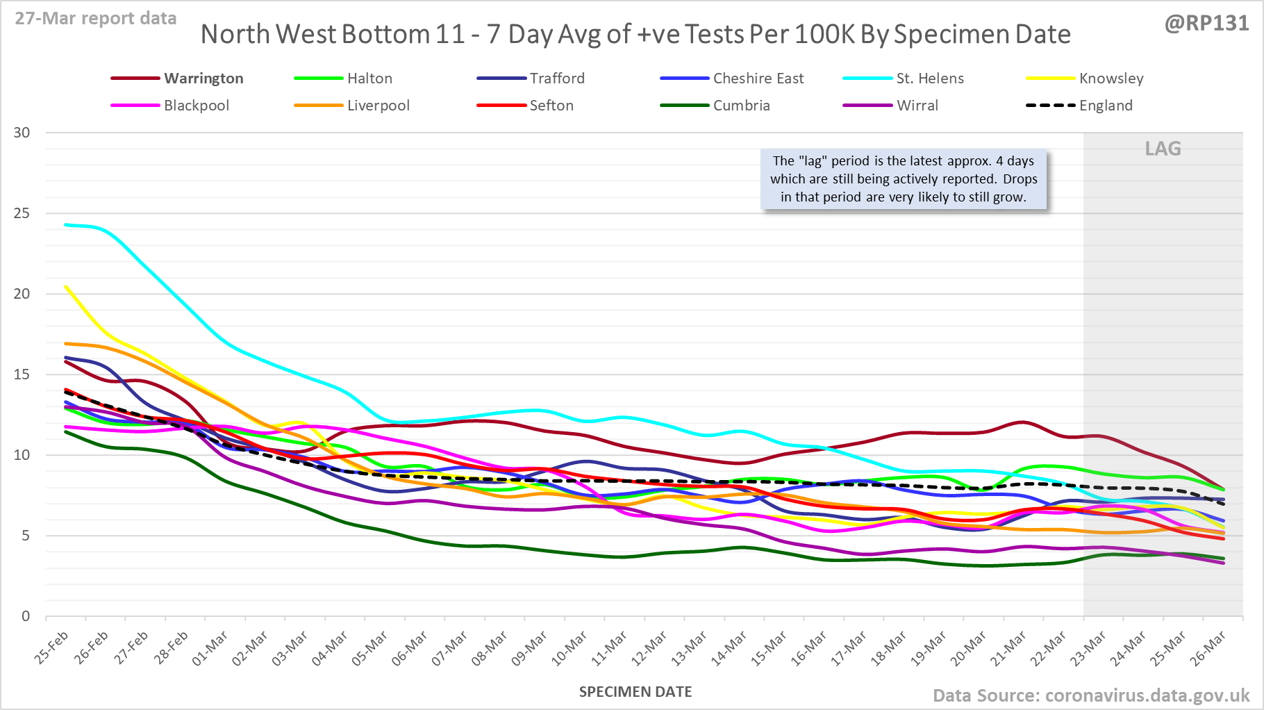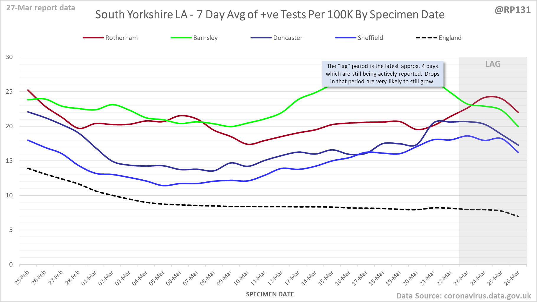 [1/22] #covid19uk - Detailed positive tests thread. The majority of this thread is a set of views of rolling 7 day average positives per 100K by specimen date. Starting with England regions: