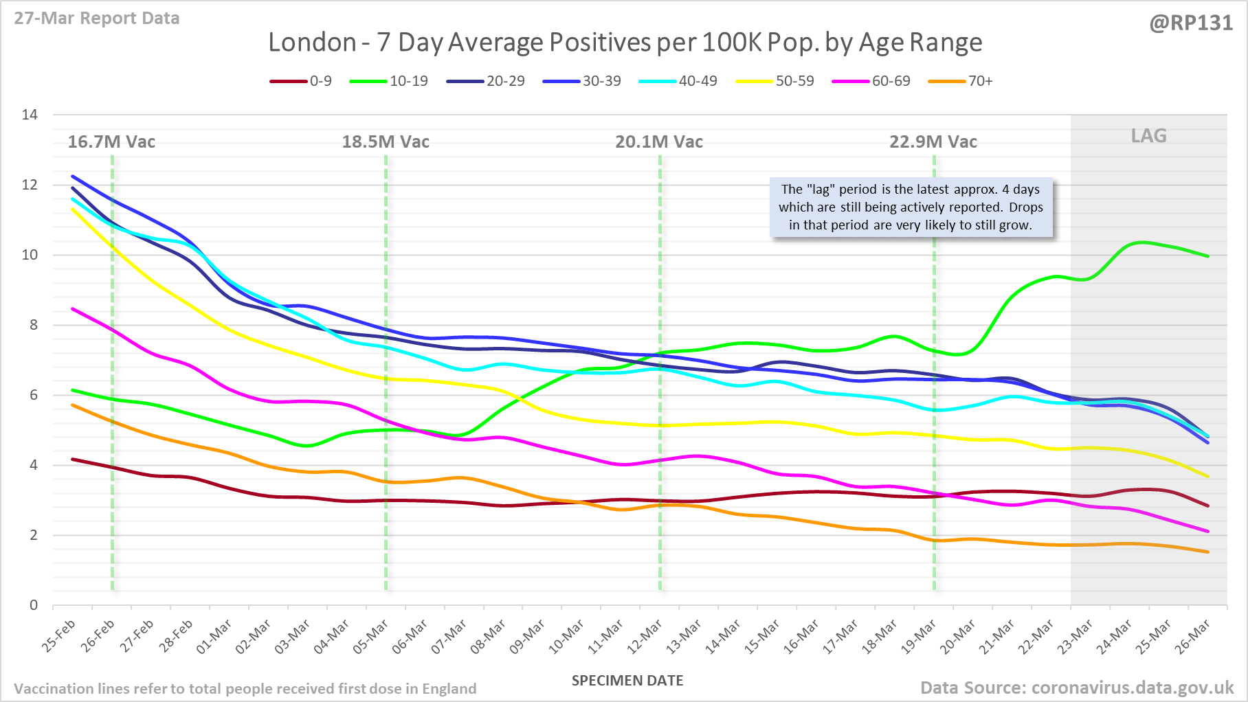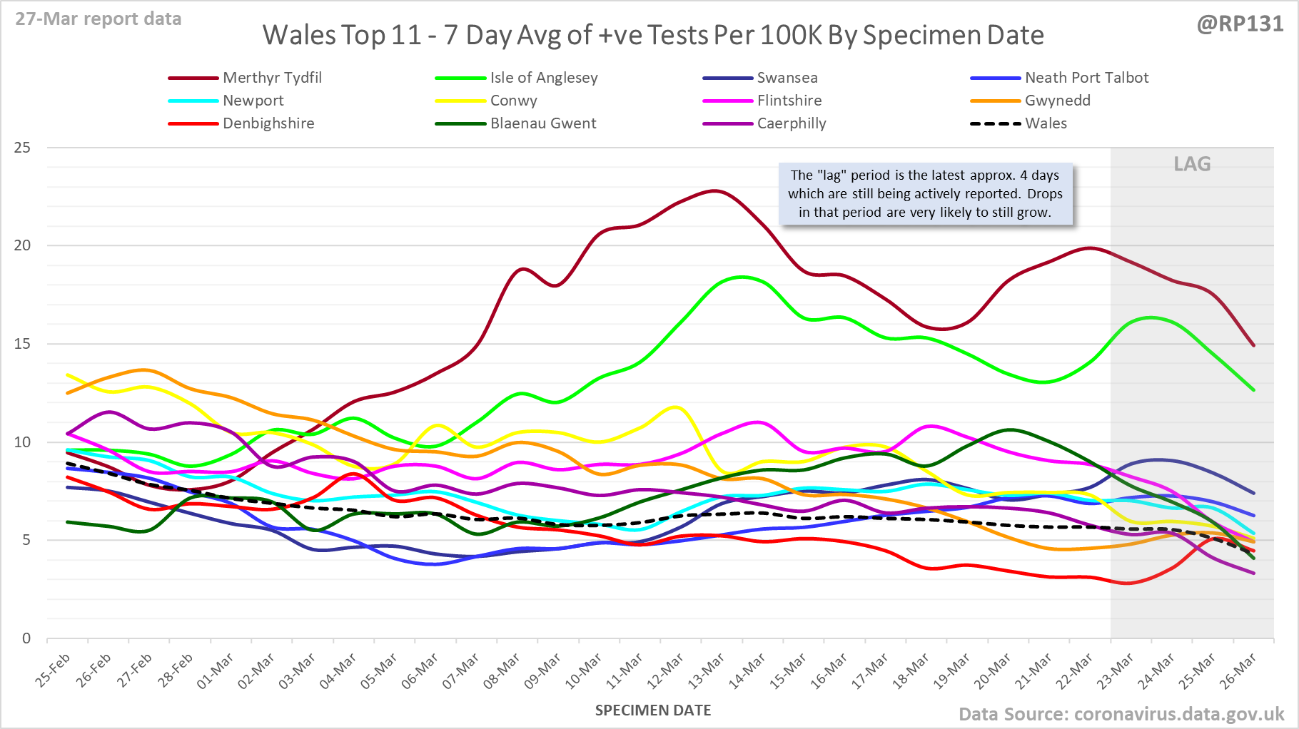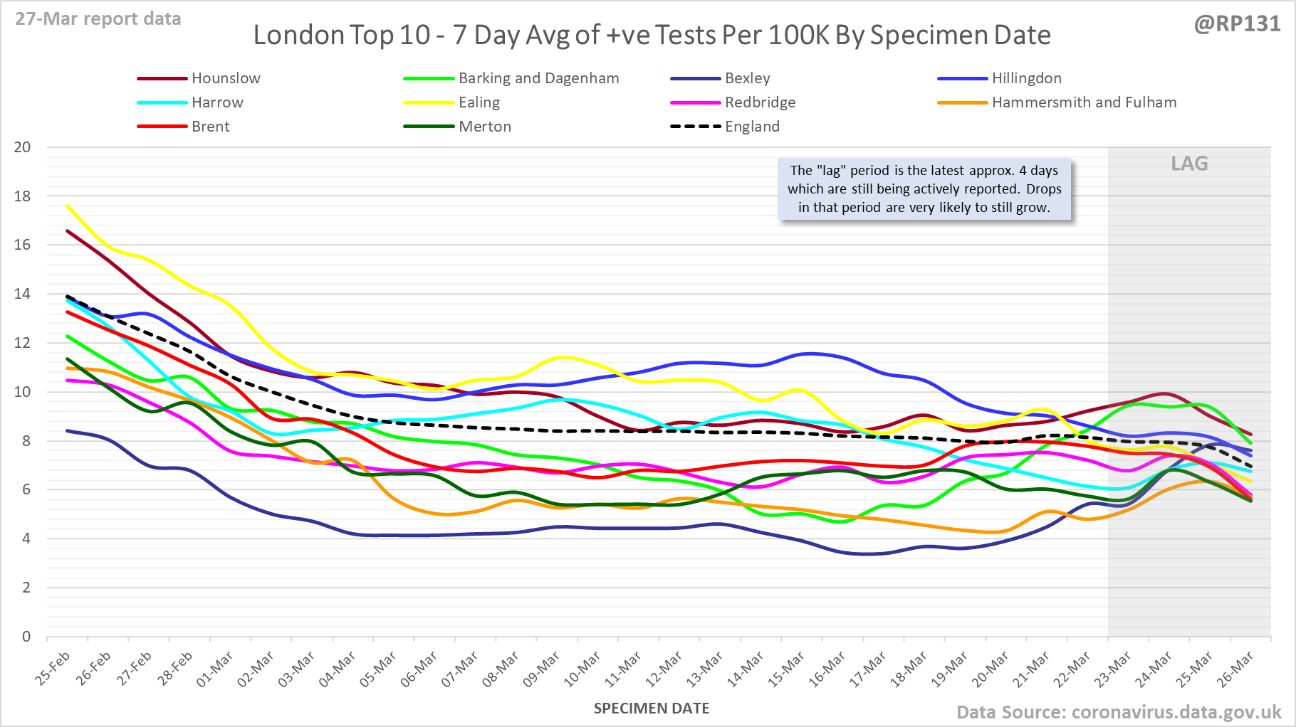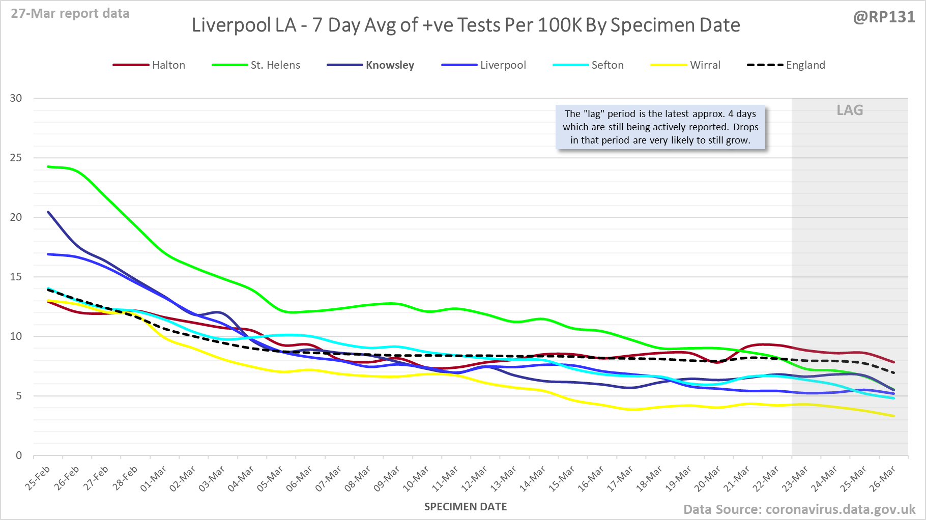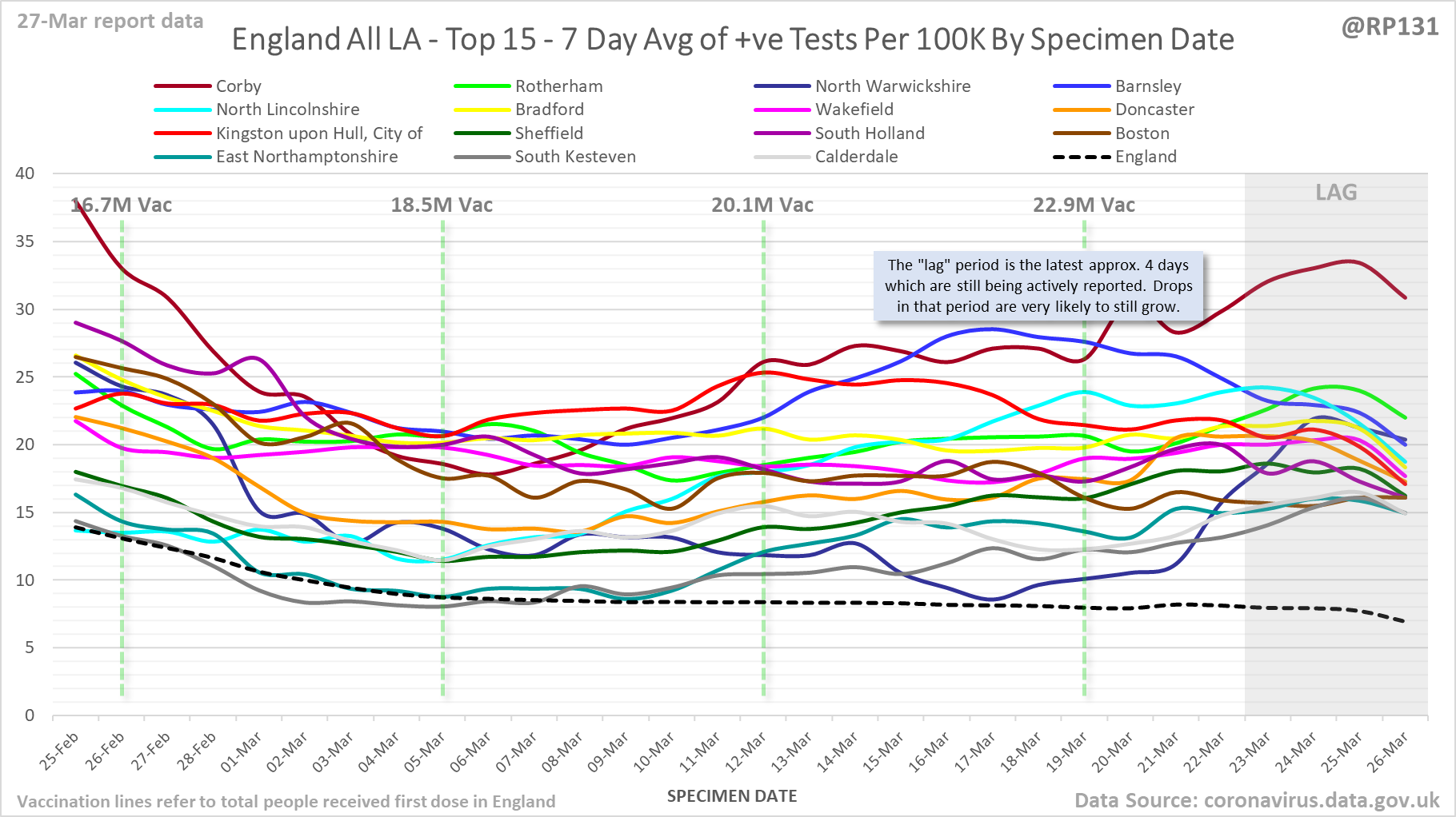 [1/22] #covid19uk - Detailed positive tests thread. The majority of this thread is a set of views of rolling 7 day average positives per 100K by specimen date. Starting with England regions:
