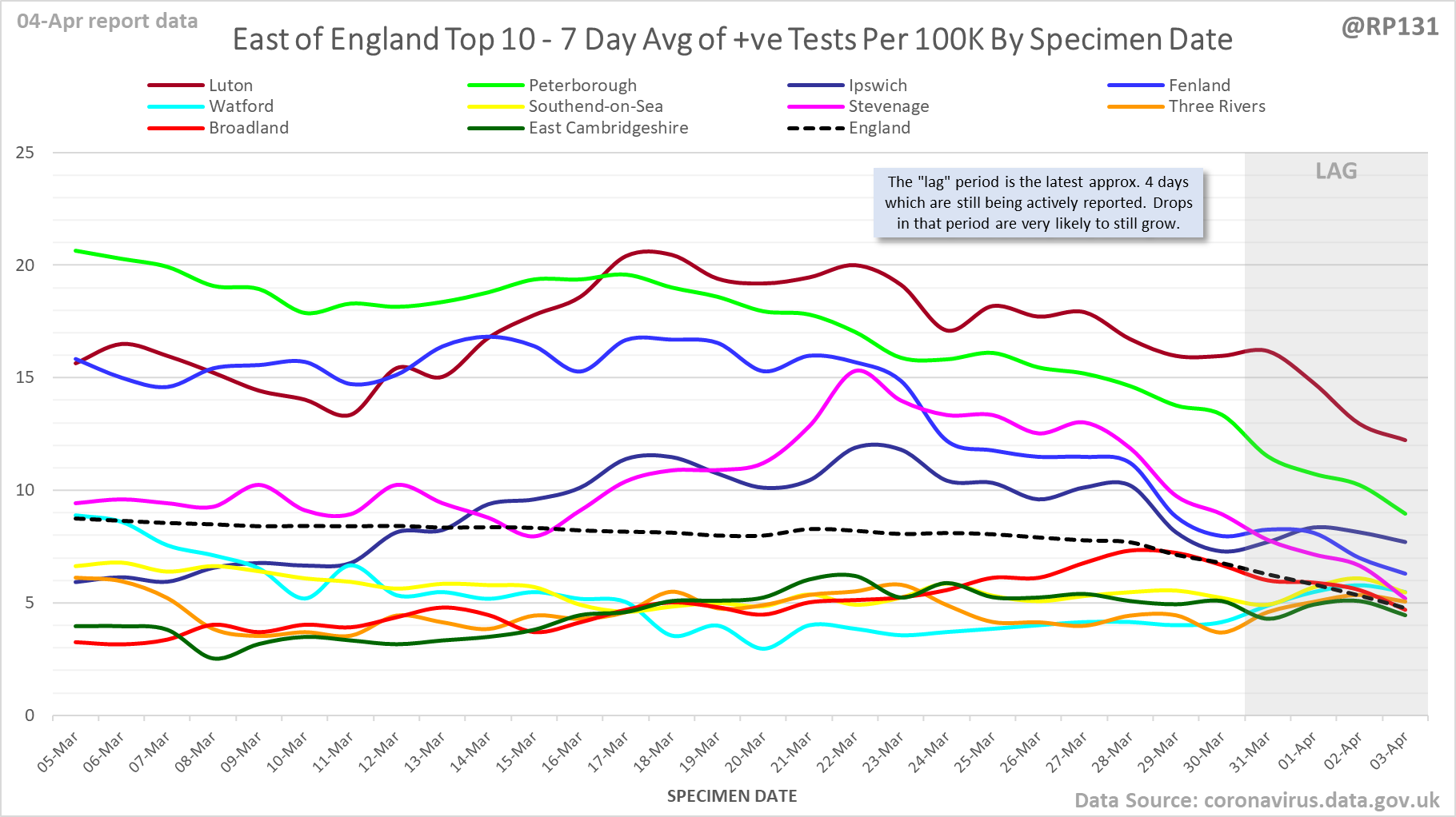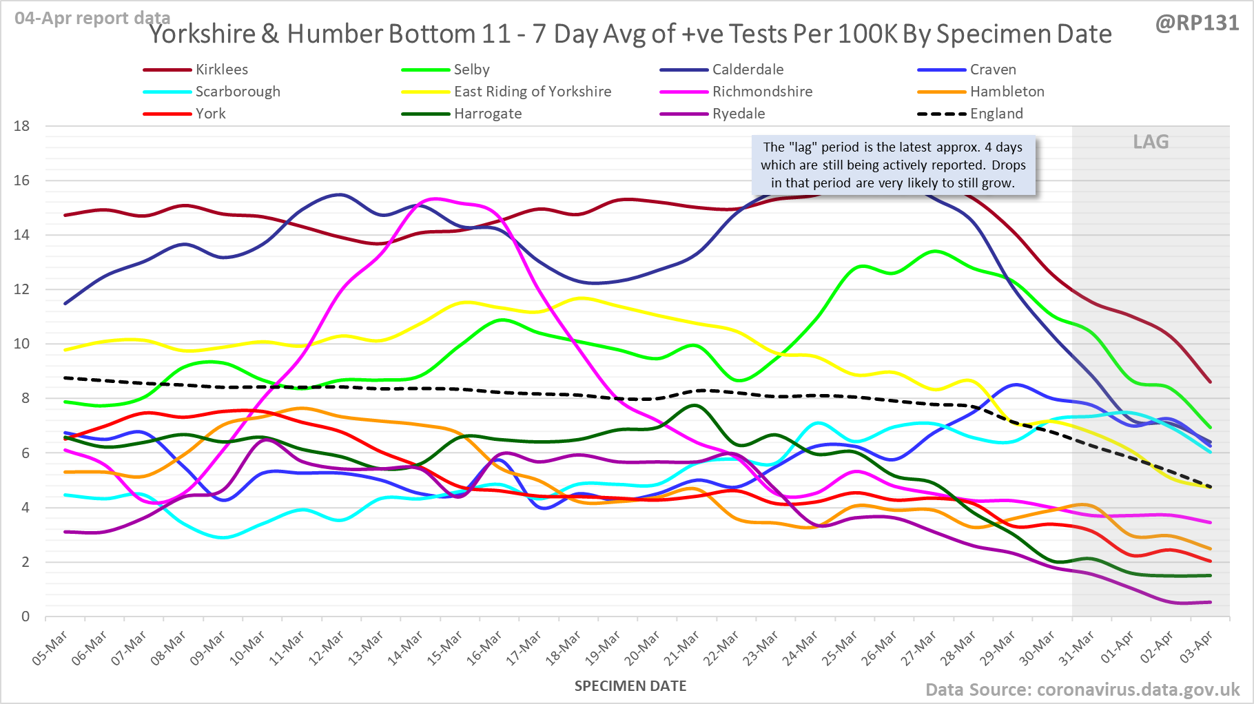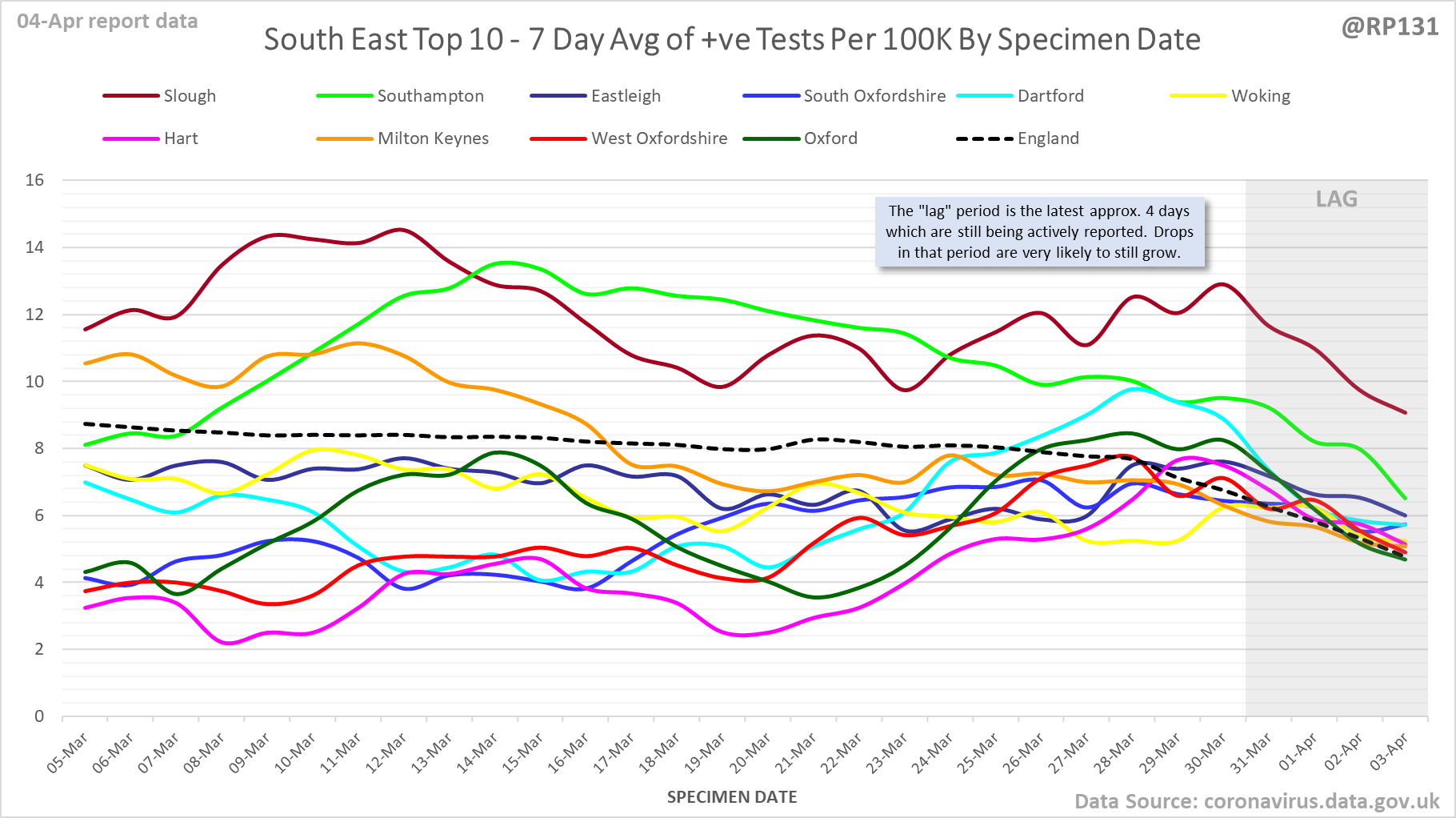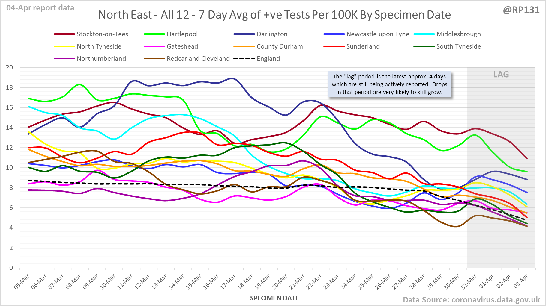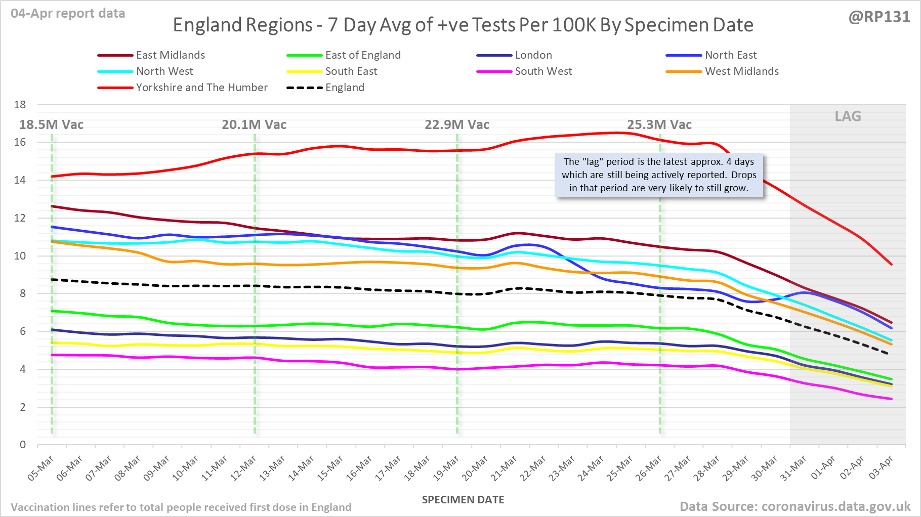 [1/22] #covid19uk - Detailed positive tests thread. The majority of this thread is a set of views of rolling 7 day average positives per 100K by specimen date. Starting with England regions: