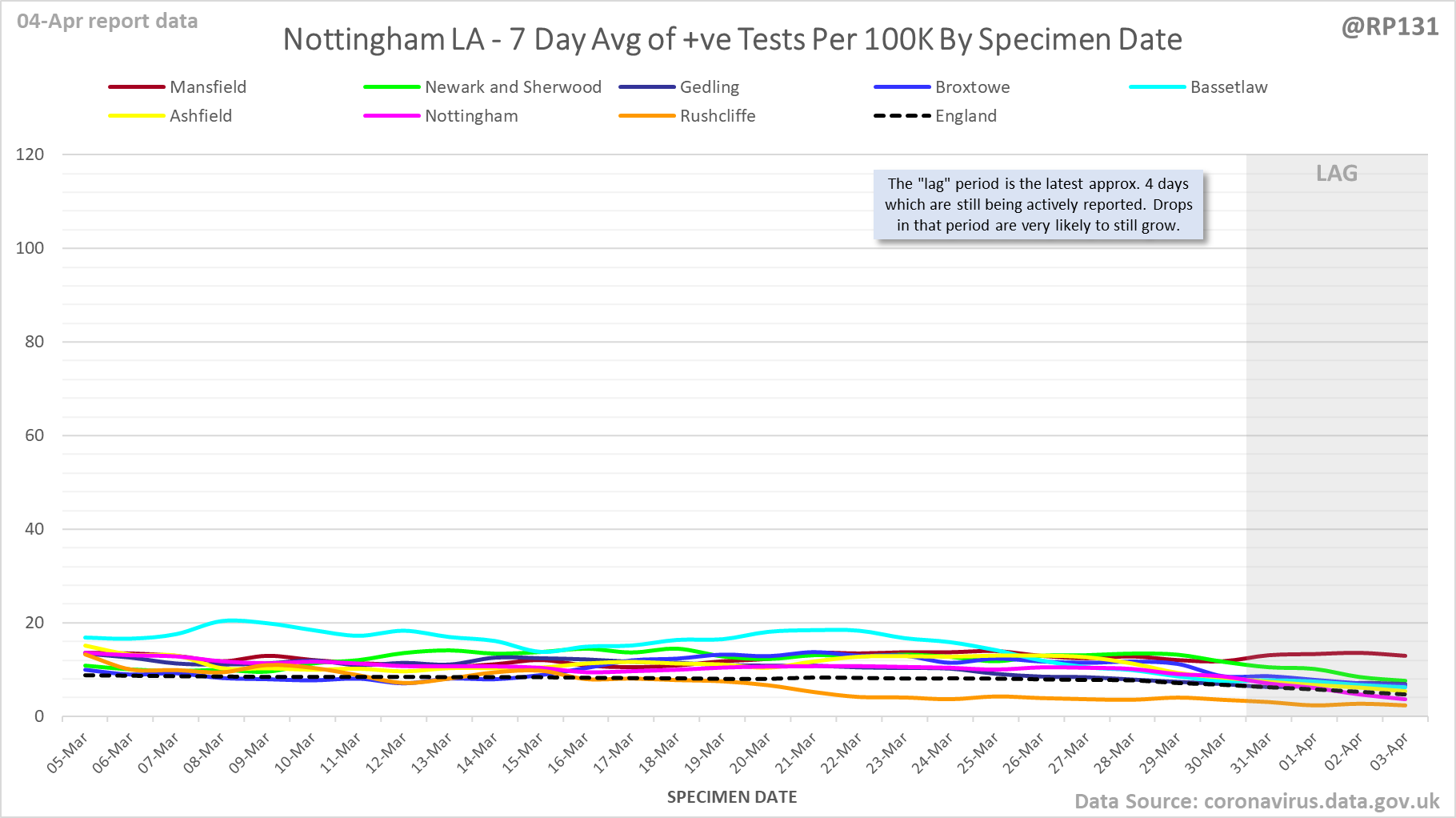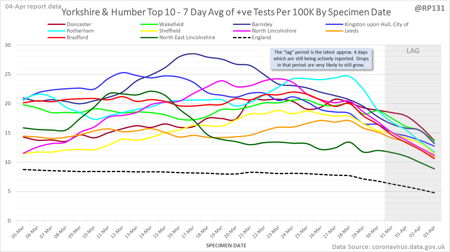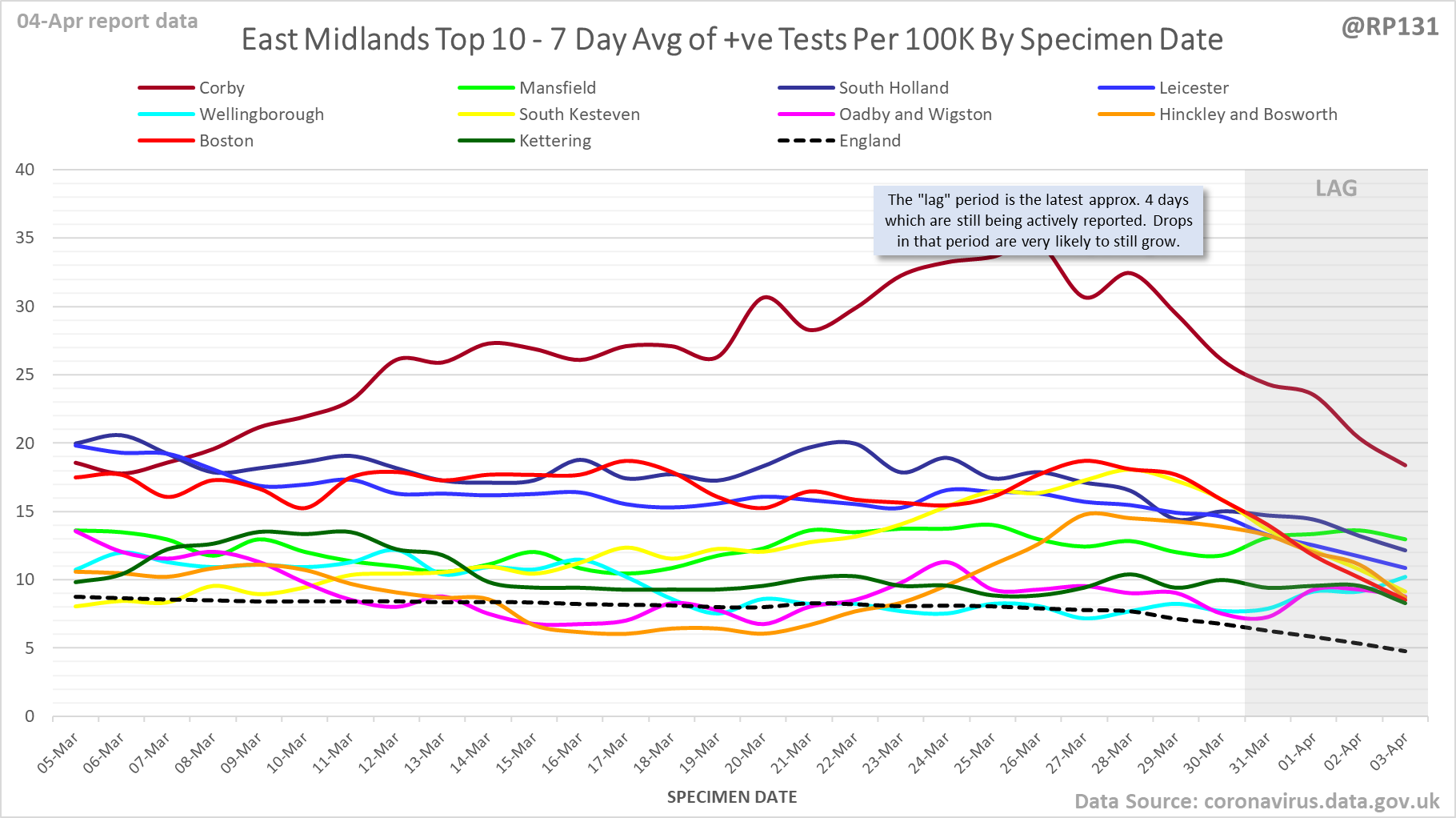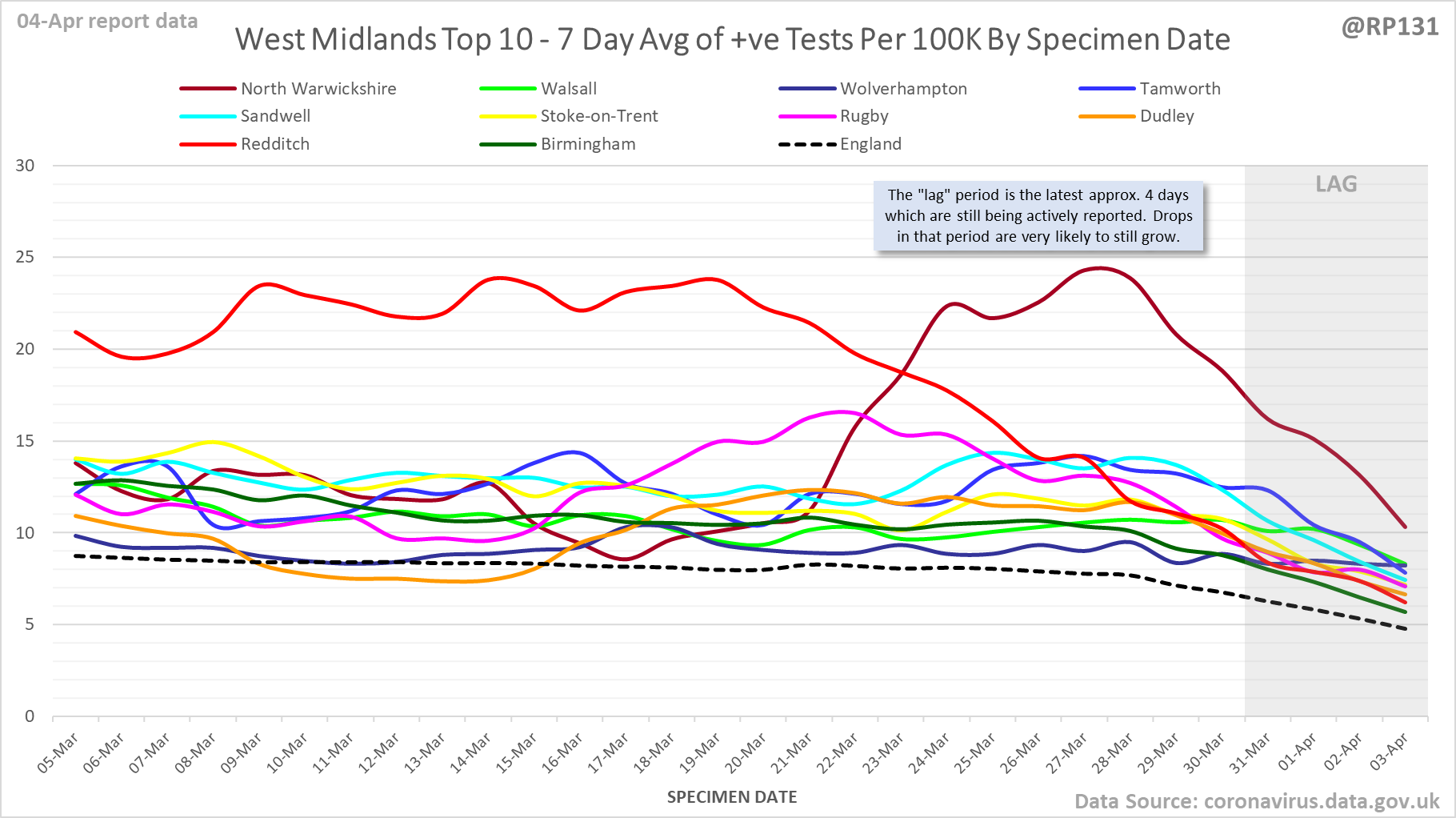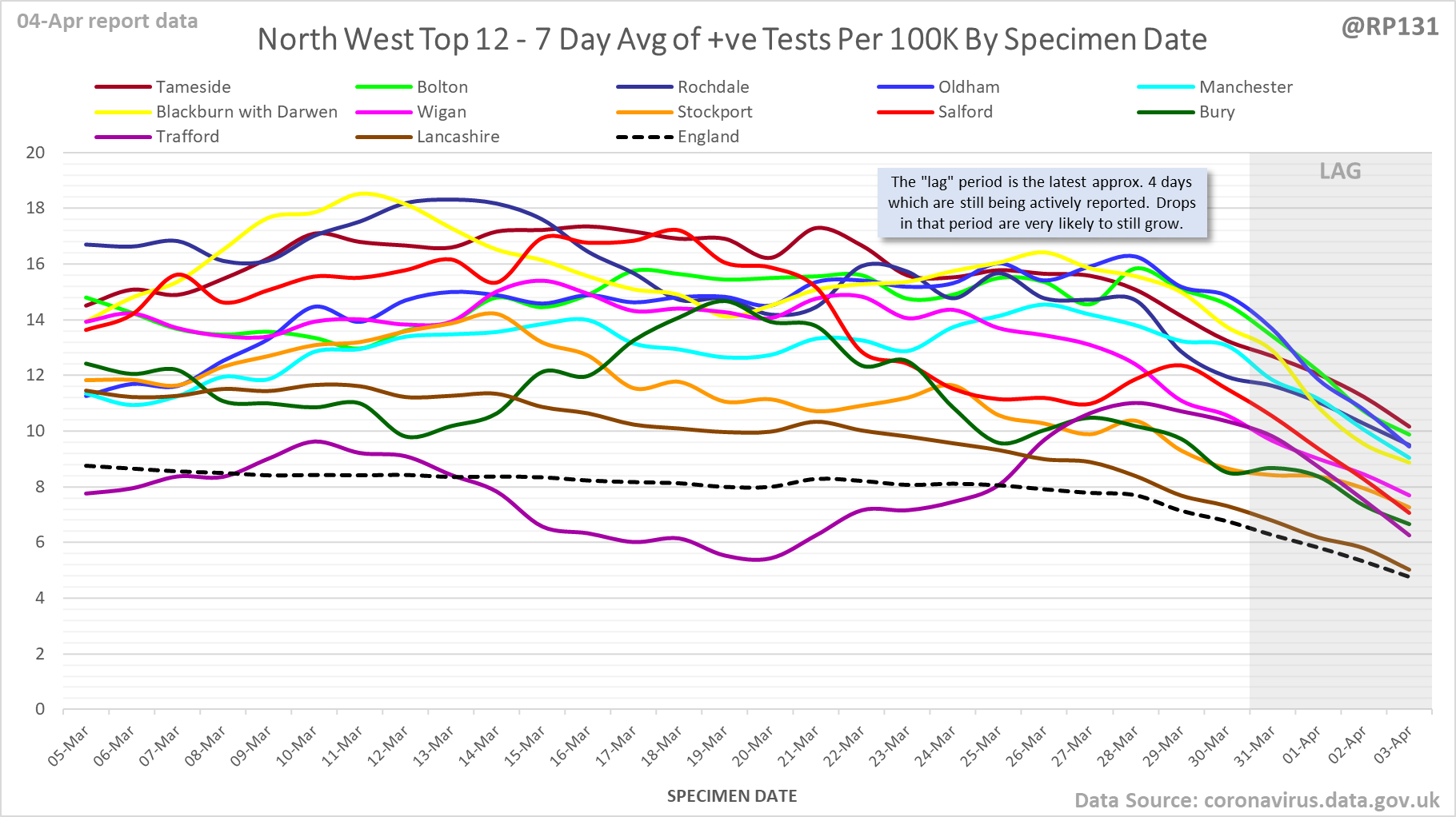 [1/22] #covid19uk - Detailed positive tests thread. The majority of this thread is a set of views of rolling 7 day average positives per 100K by specimen date. Starting with England regions: