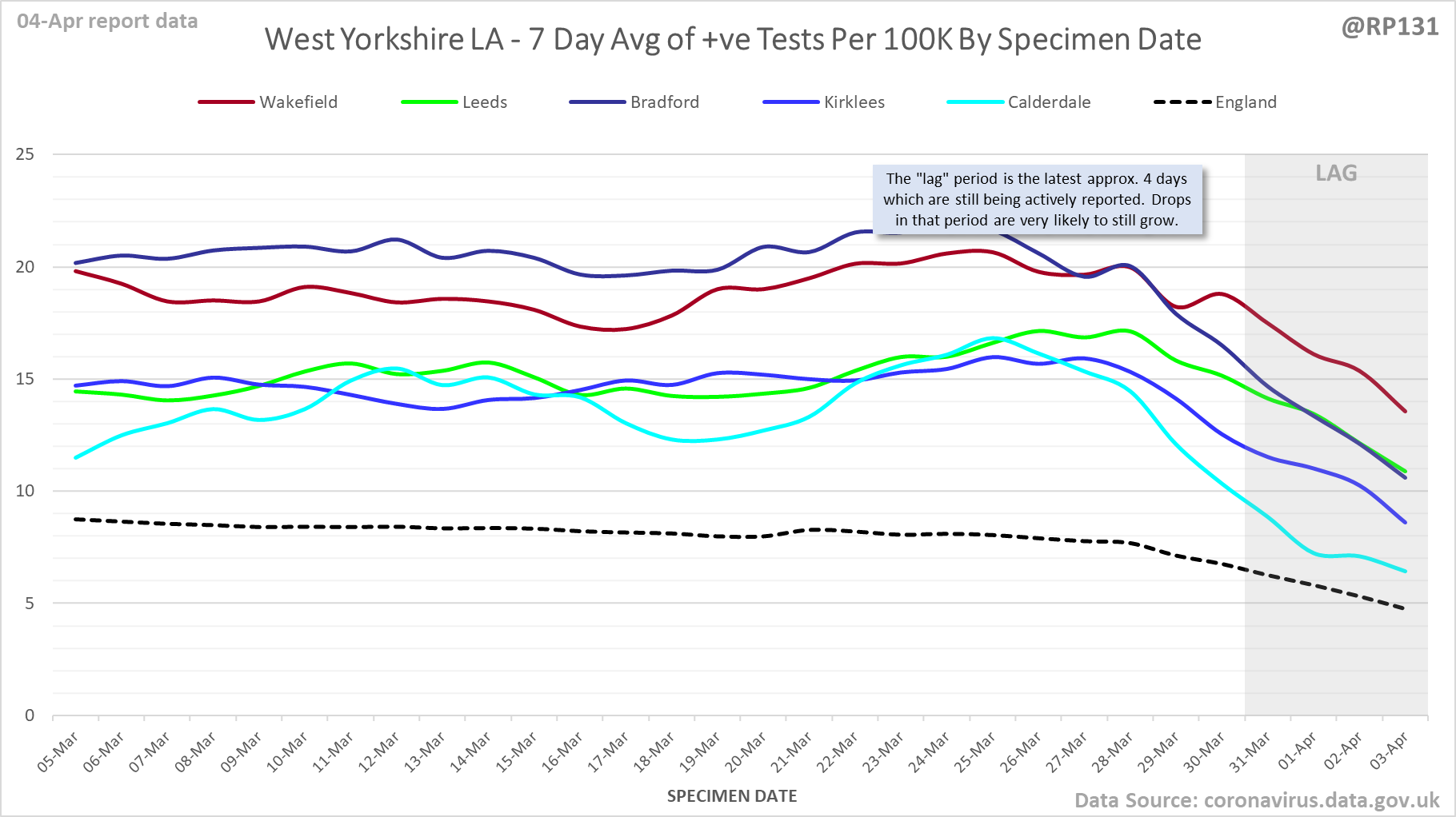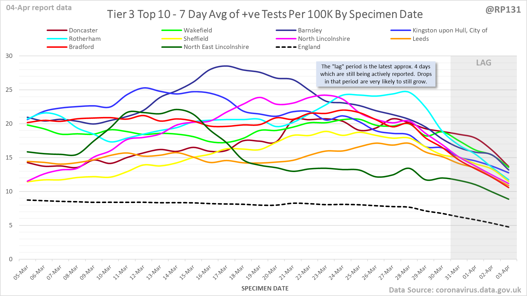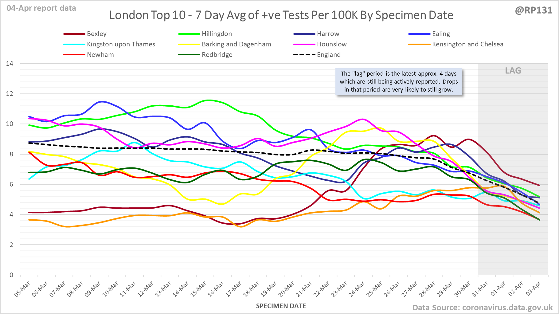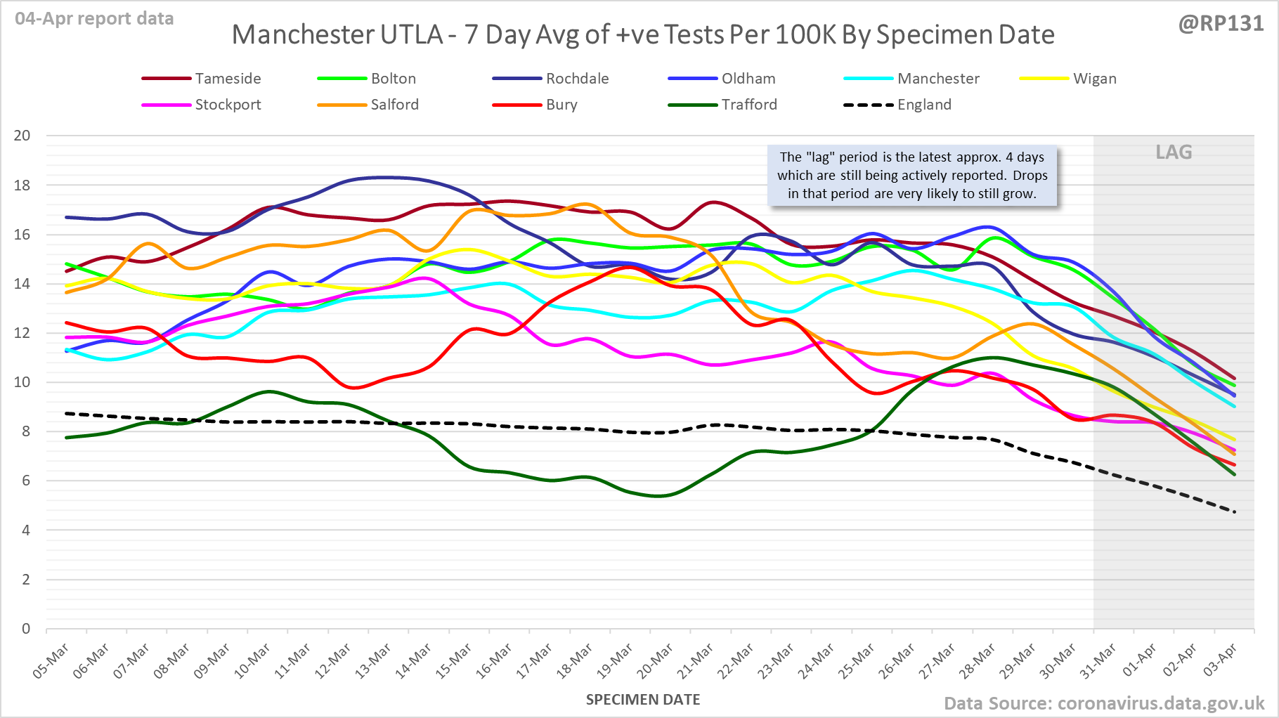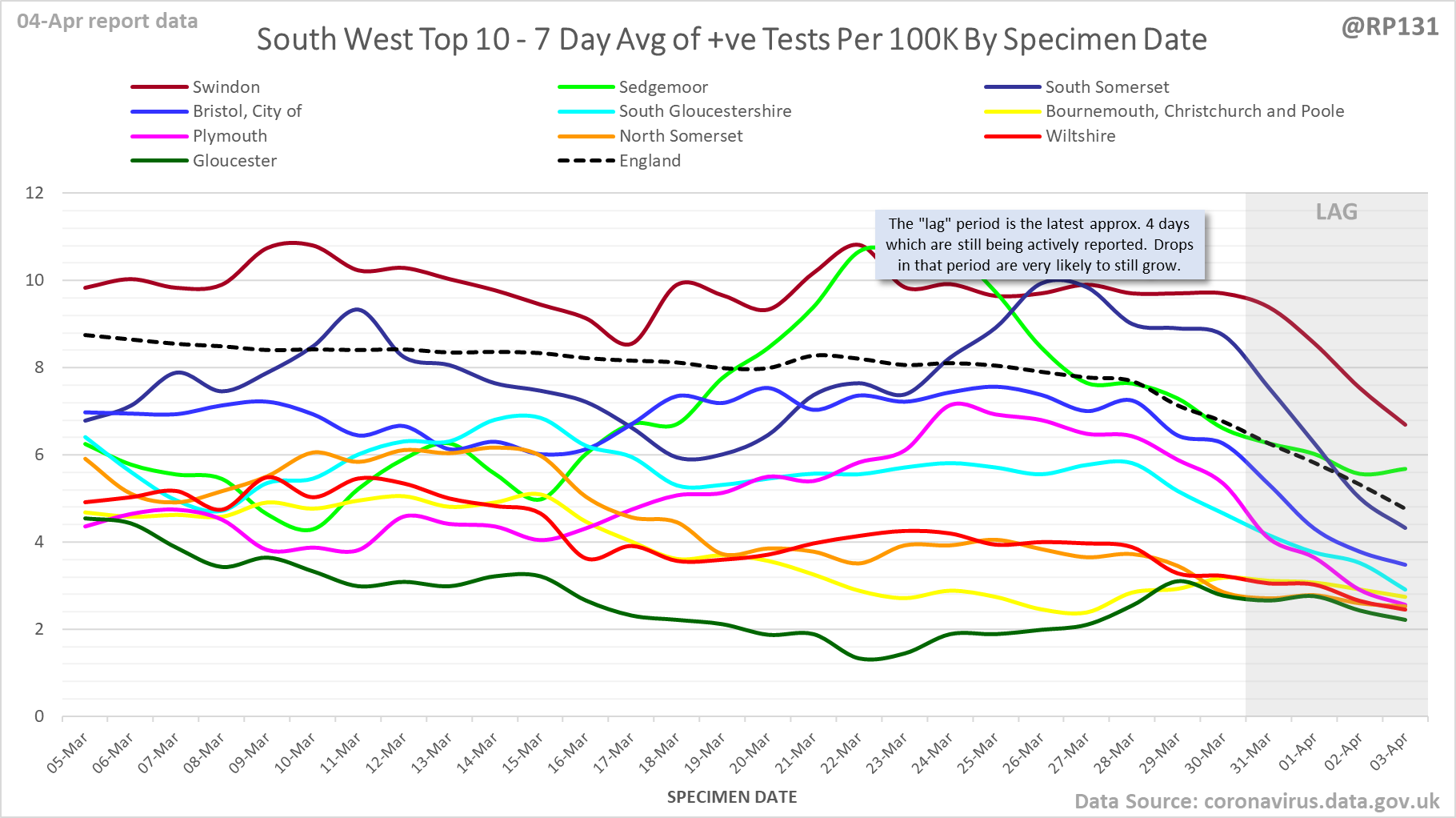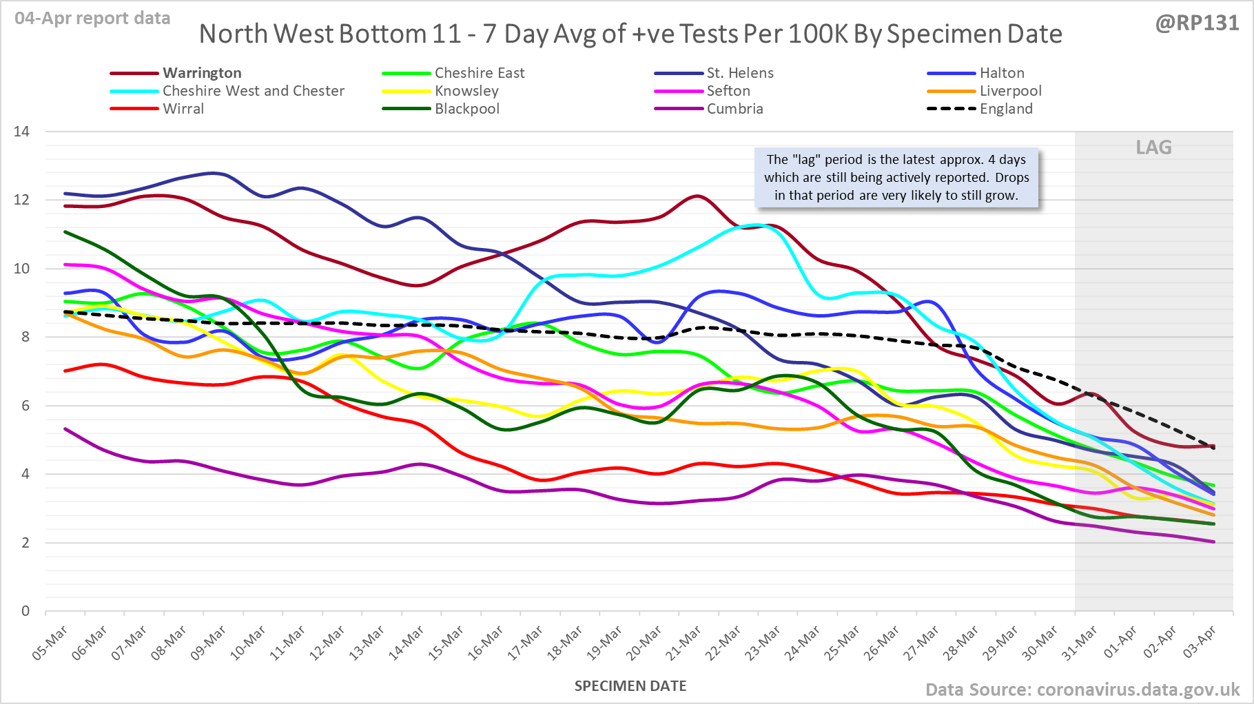 [1/22] #covid19uk - Detailed positive tests thread. The majority of this thread is a set of views of rolling 7 day average positives per 100K by specimen date. Starting with England regions: