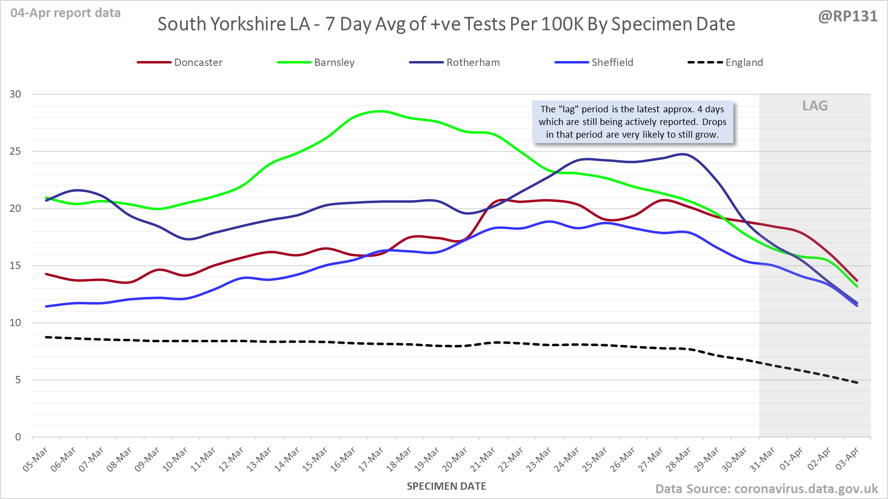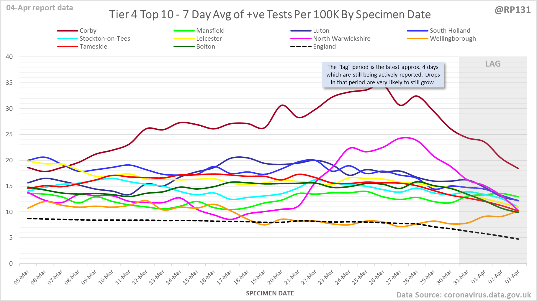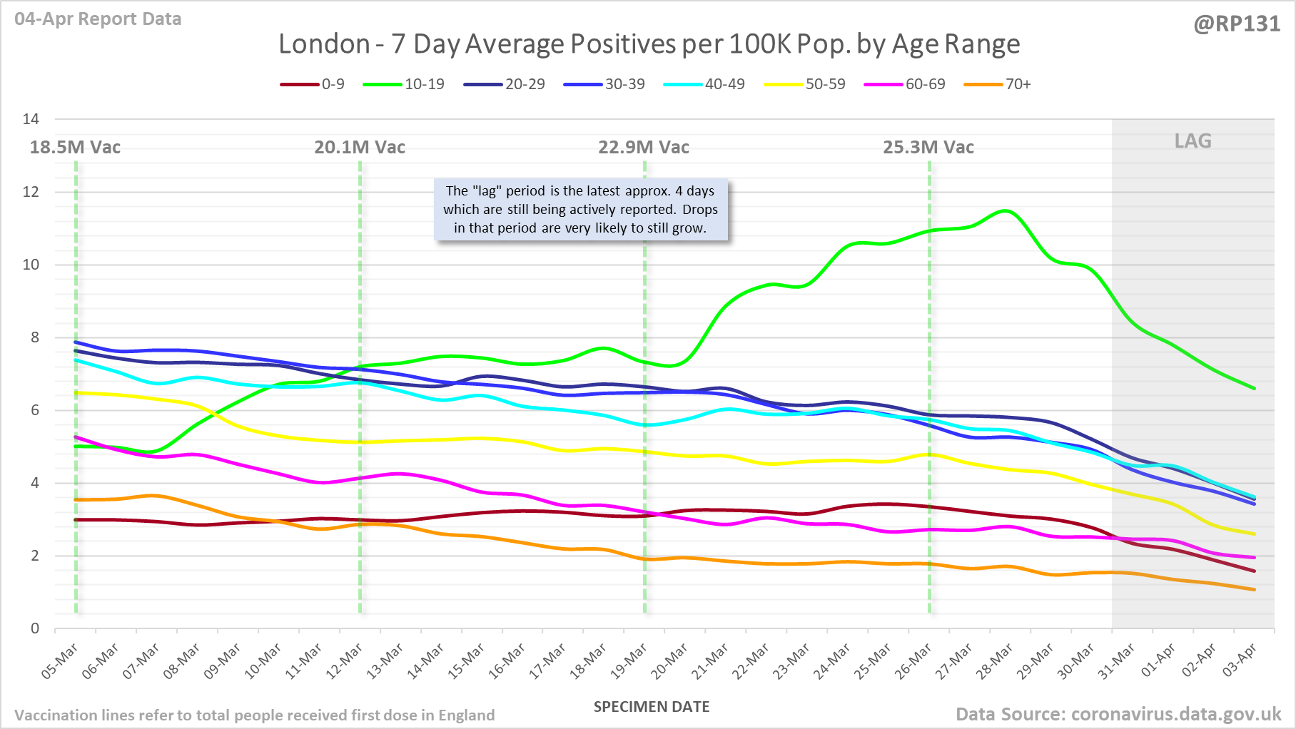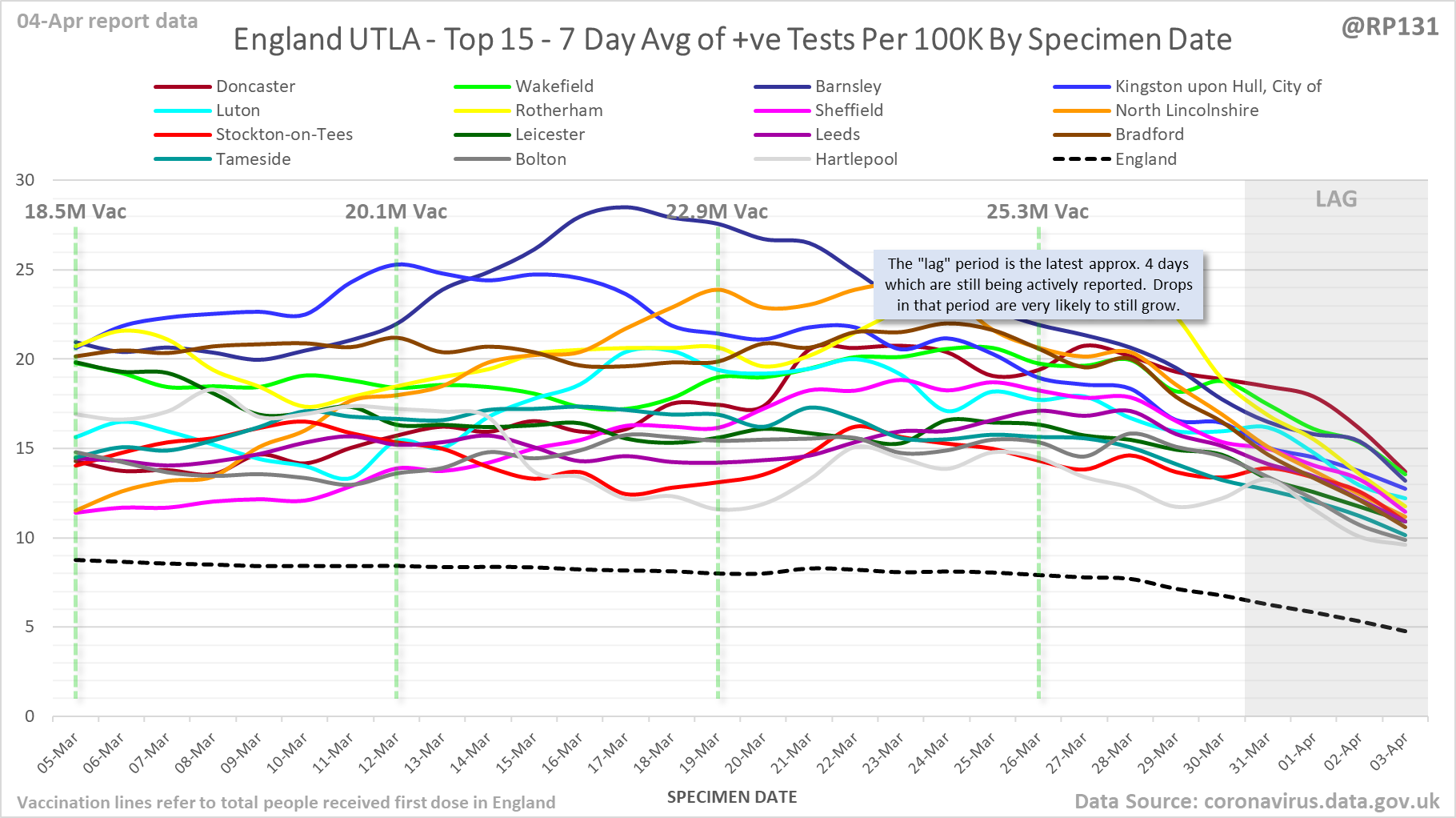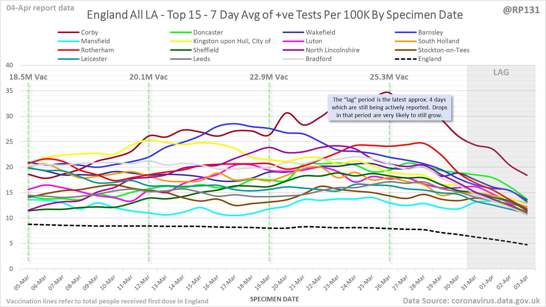 [1/22] #covid19uk - Detailed positive tests thread. The majority of this thread is a set of views of rolling 7 day average positives per 100K by specimen date. Starting with England regions: