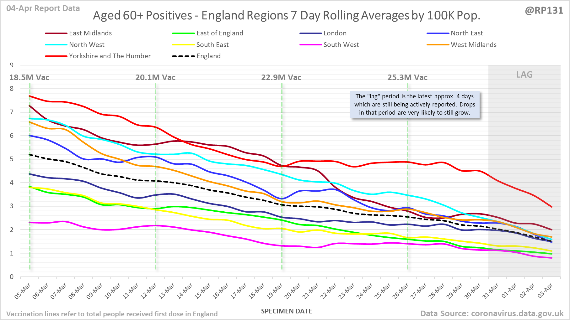 [20/22] England regional rolling average positives (per 100K population) in the 60+ age range: