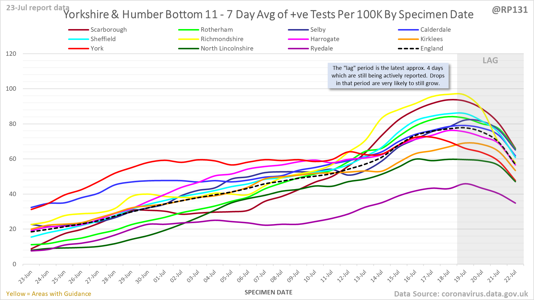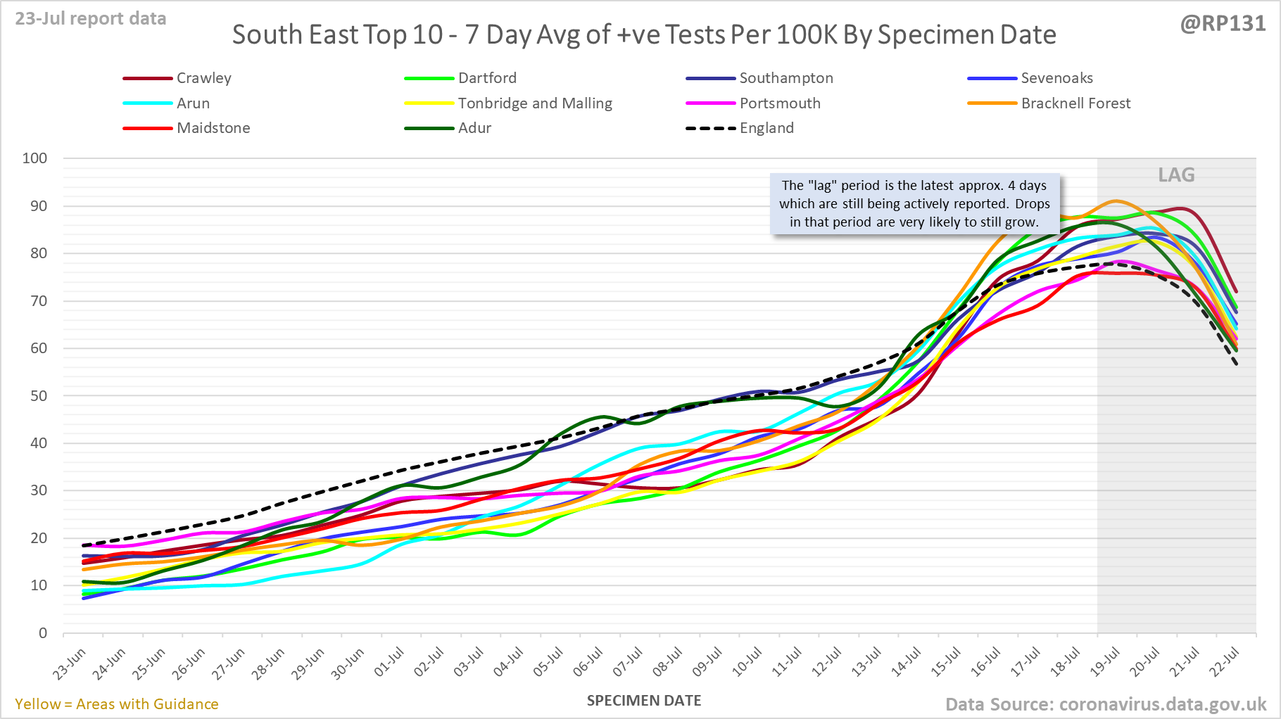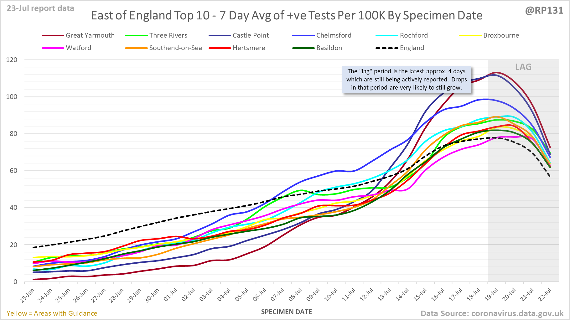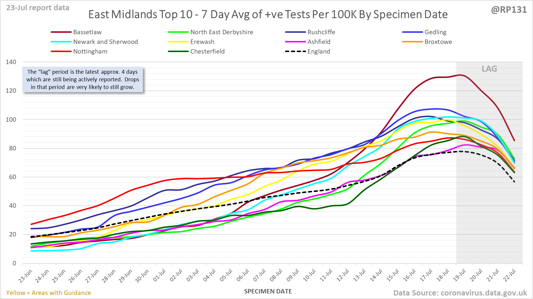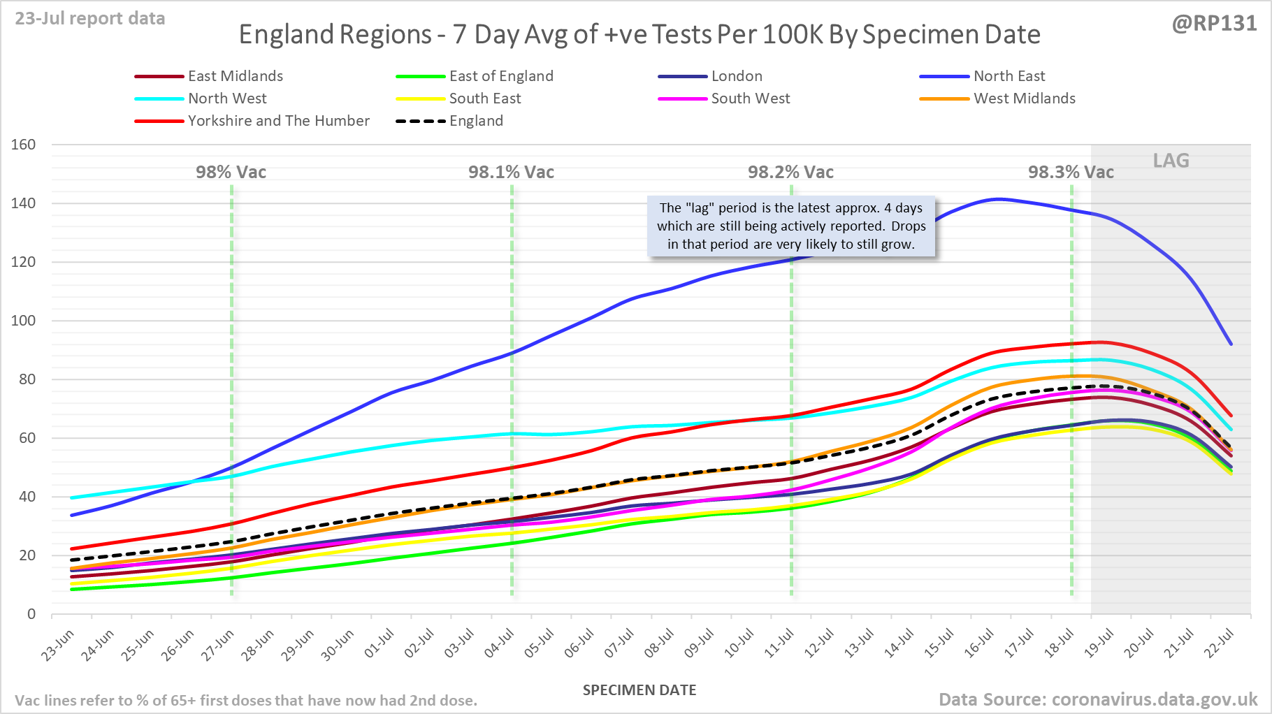 [1/23] #covid19uk - Detailed positive tests thread. The majority of this thread is a set of views of rolling 7 day average positives per 100K by specimen date. Starting with England regions: