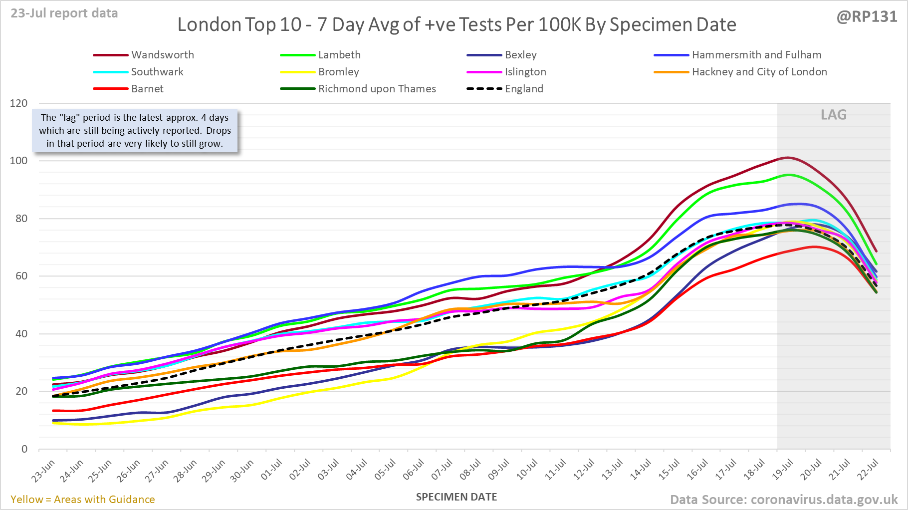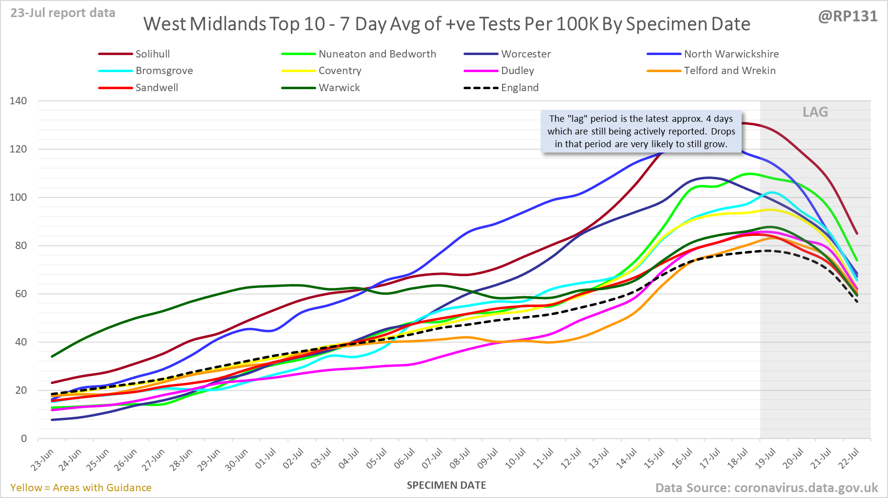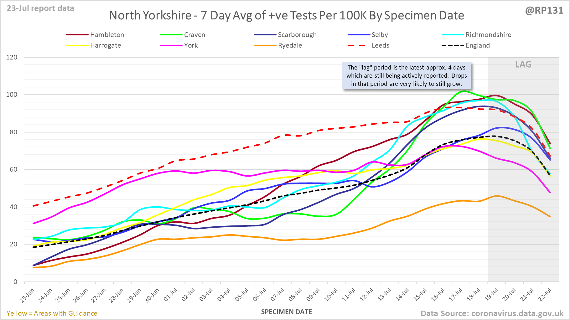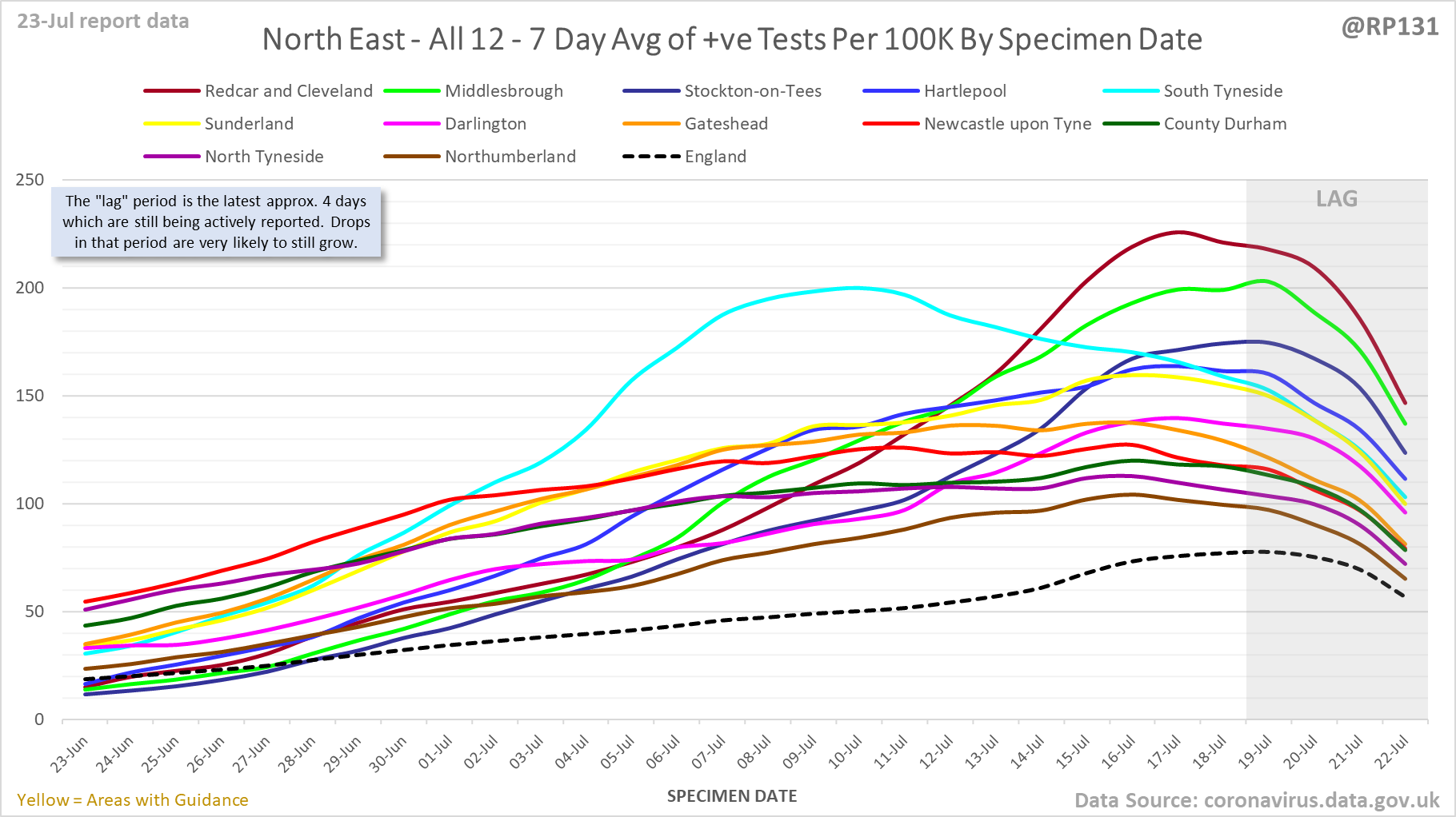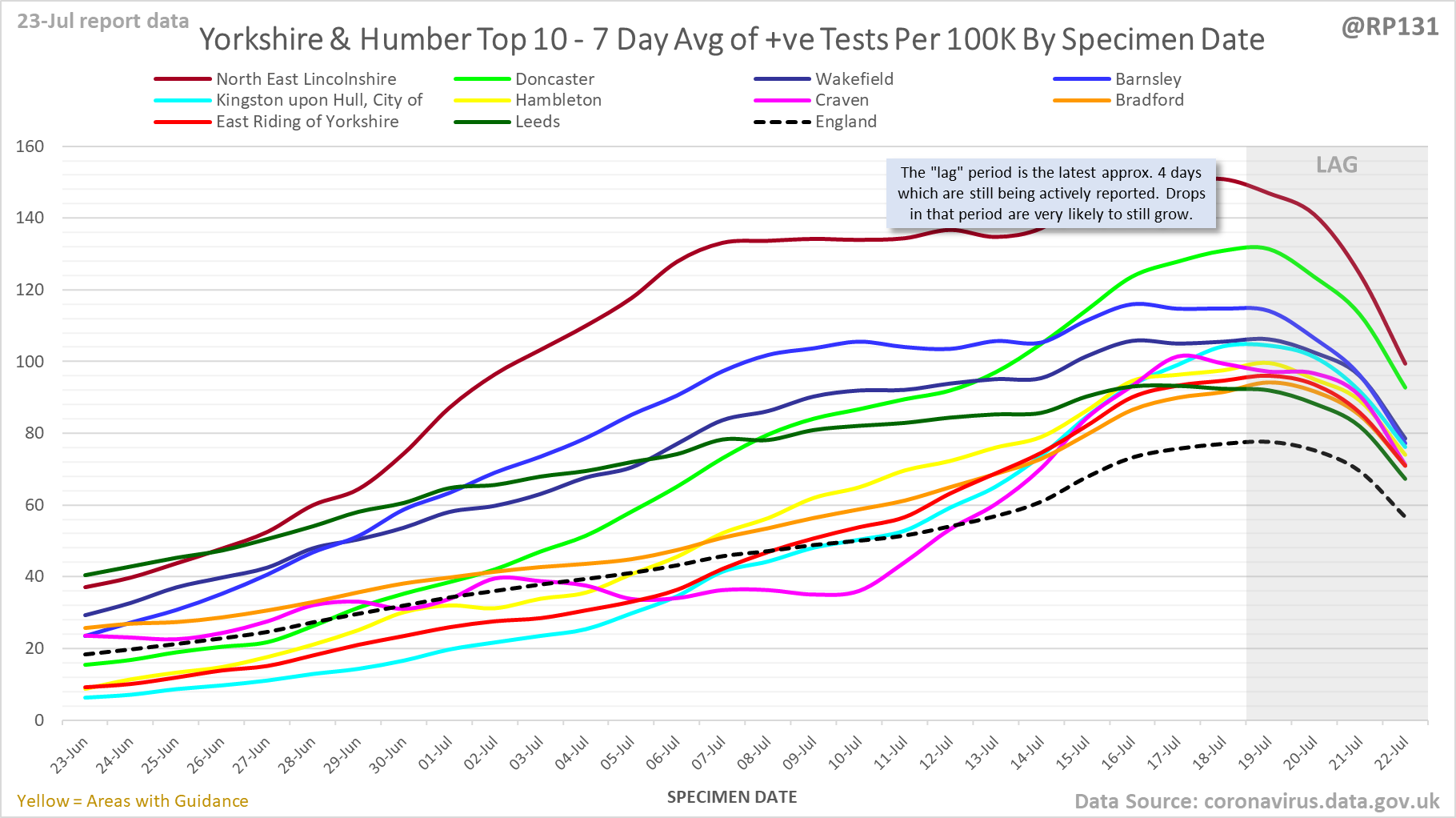 [1/23] #covid19uk - Detailed positive tests thread. The majority of this thread is a set of views of rolling 7 day average positives per 100K by specimen date. Starting with England regions: