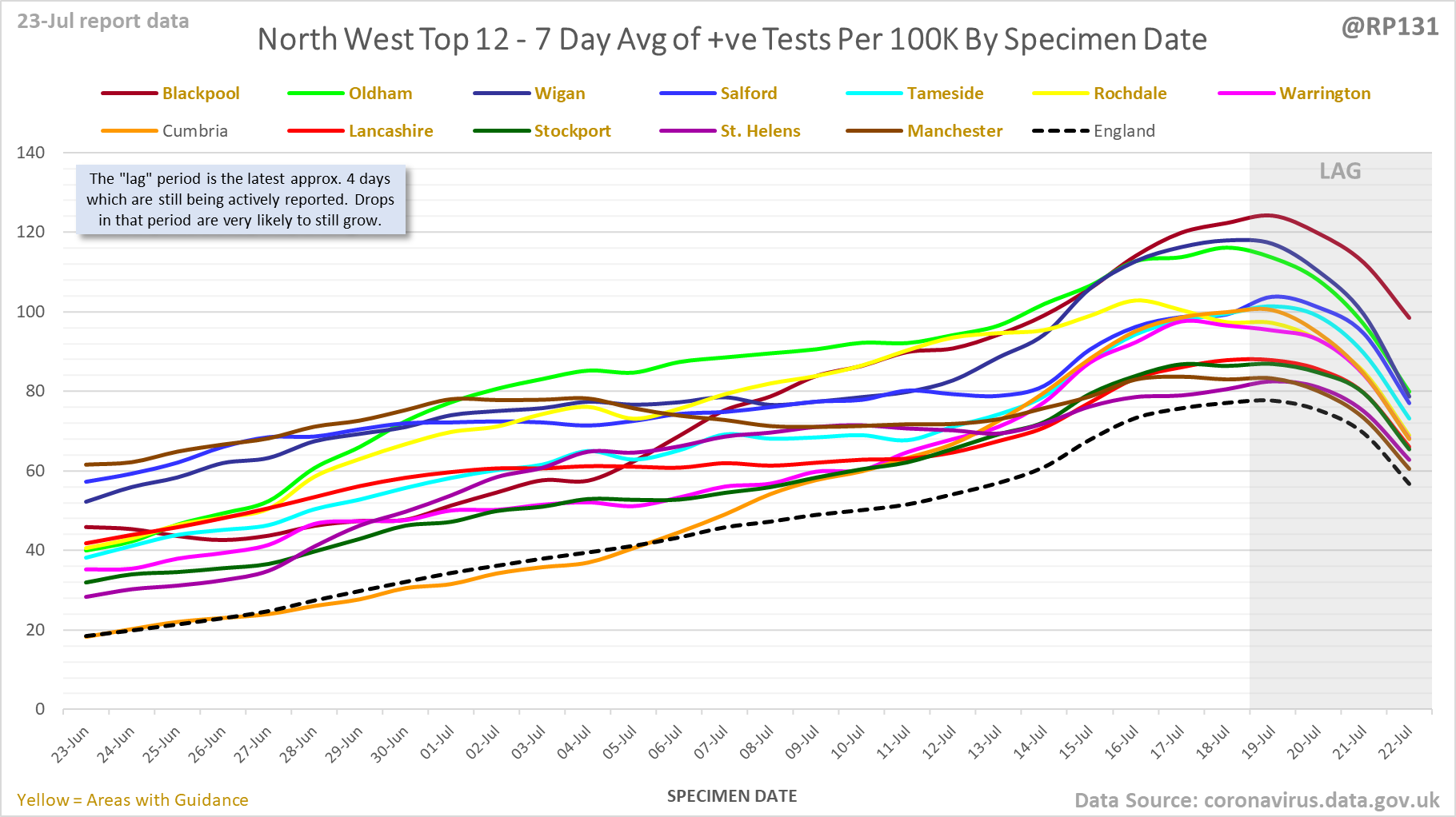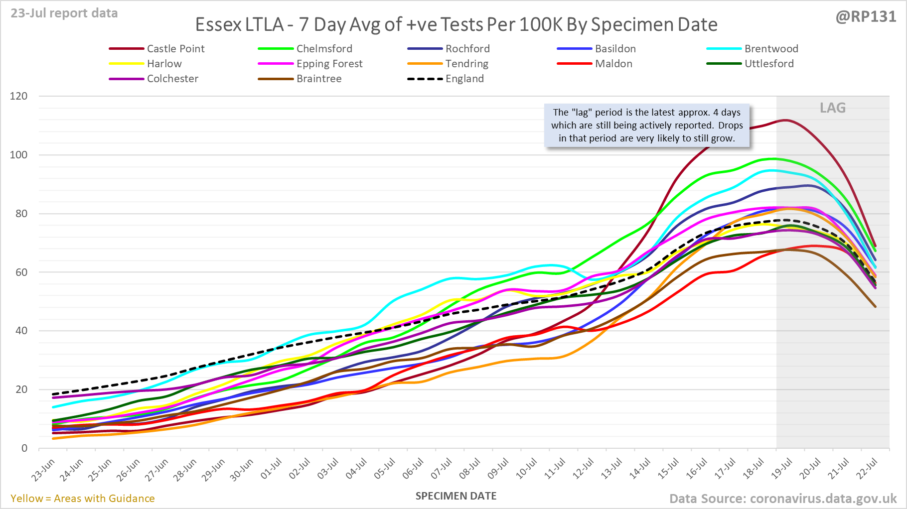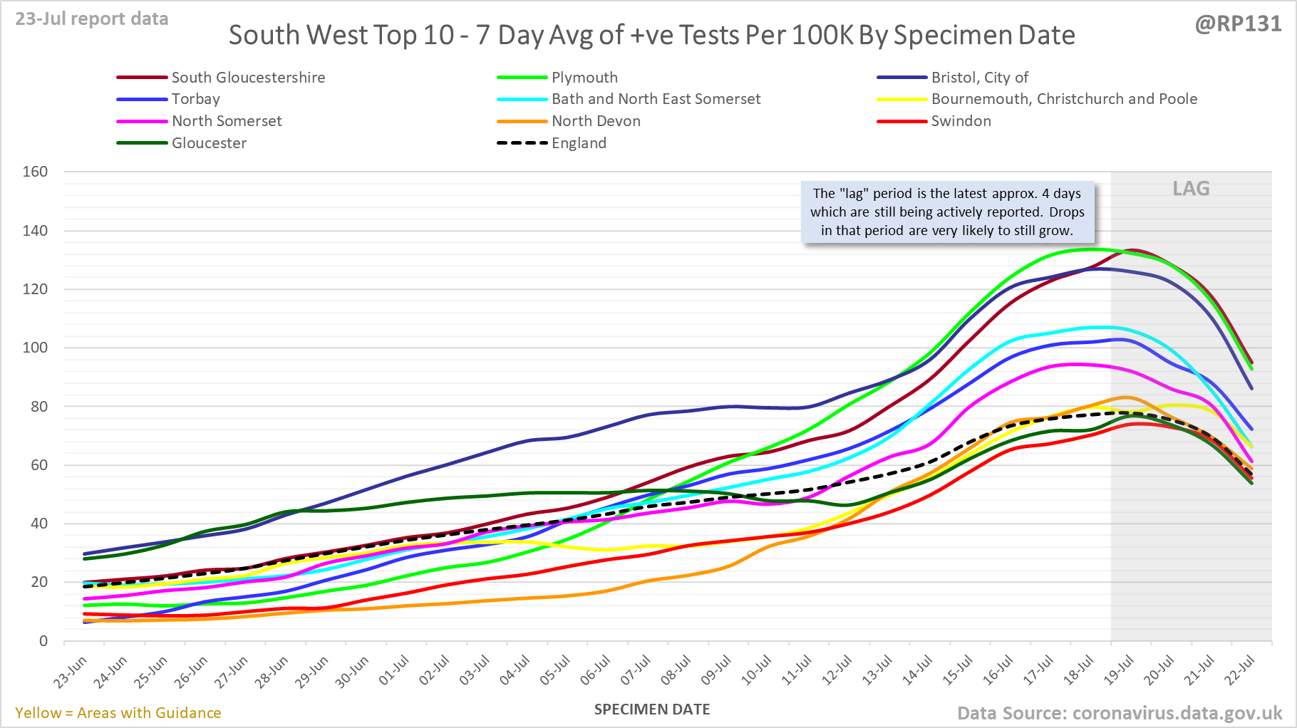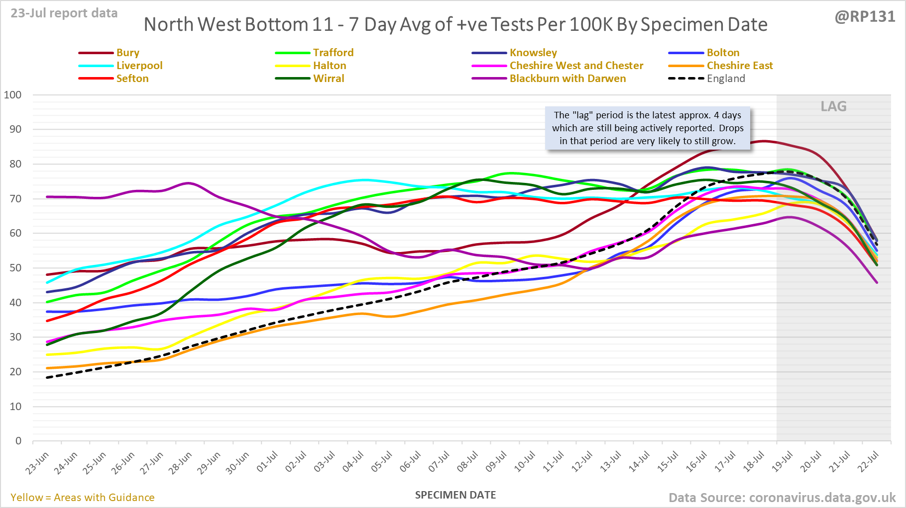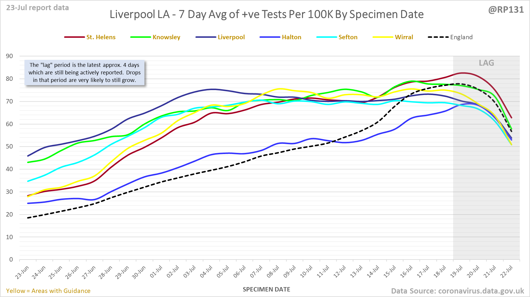 [1/23] #covid19uk - Detailed positive tests thread. The majority of this thread is a set of views of rolling 7 day average positives per 100K by specimen date. Starting with England regions: