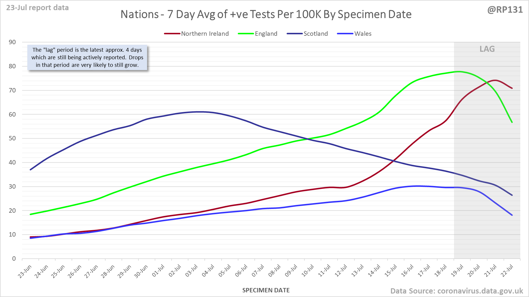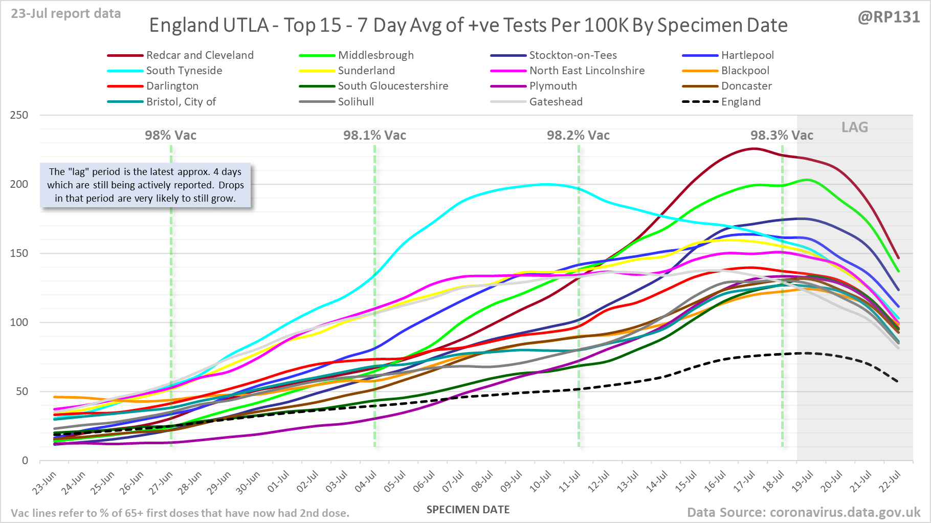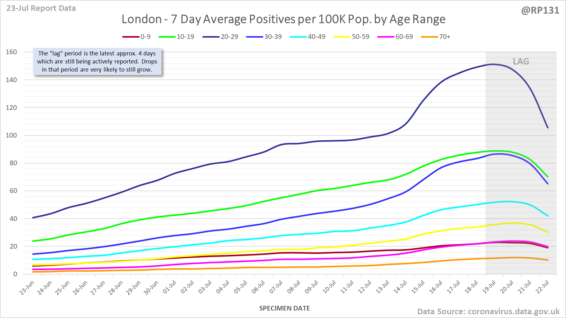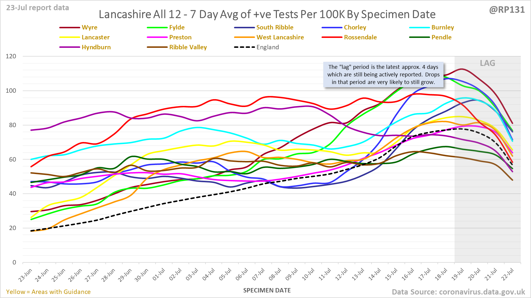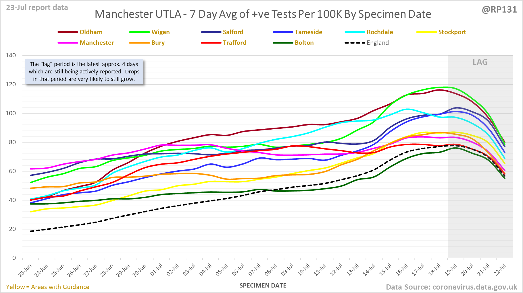 [1/23] #covid19uk - Detailed positive tests thread. The majority of this thread is a set of views of rolling 7 day average positives per 100K by specimen date. Starting with England regions: