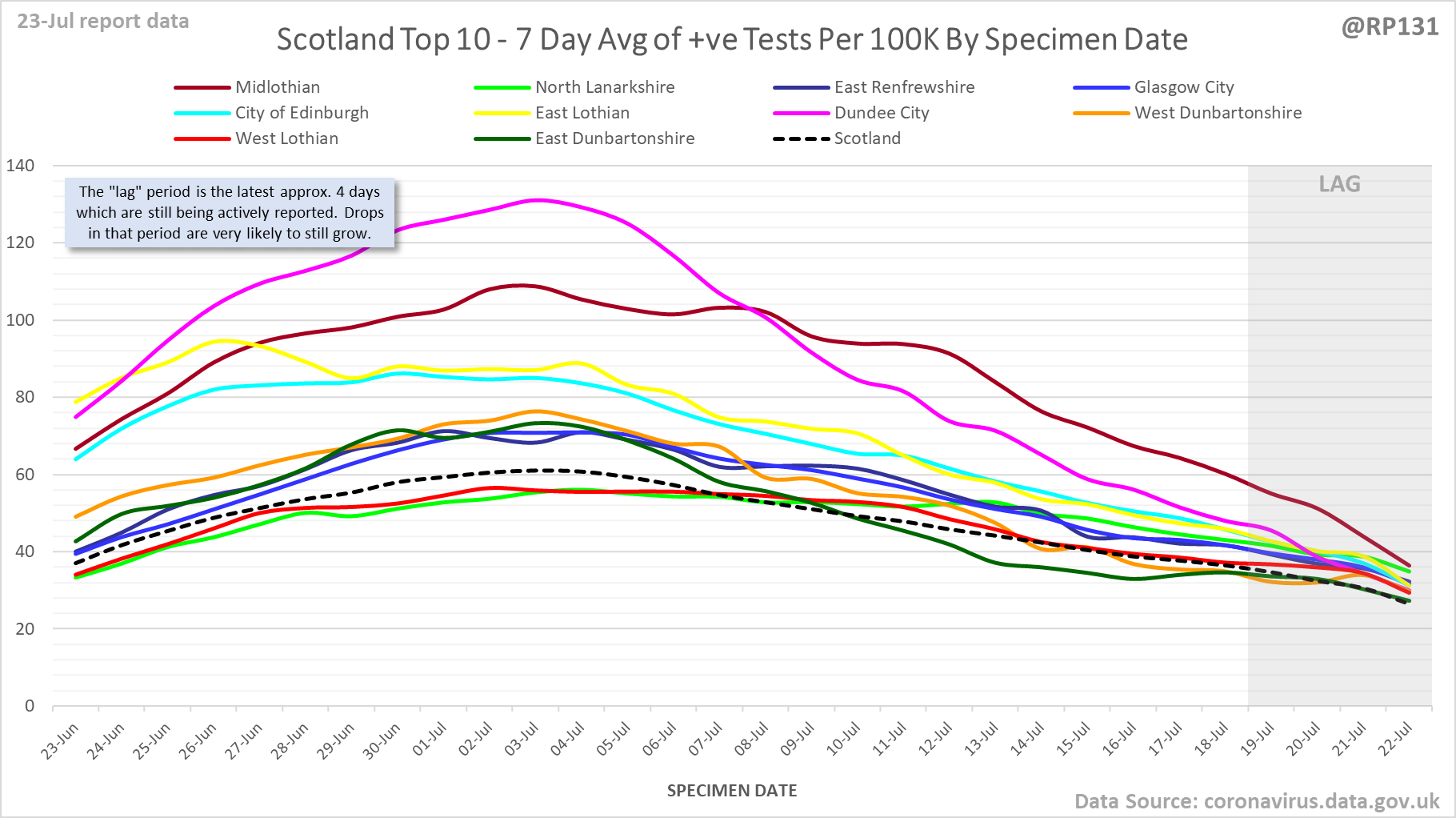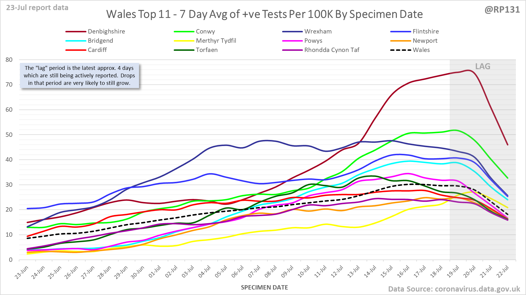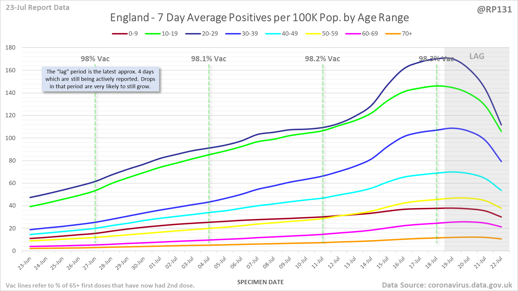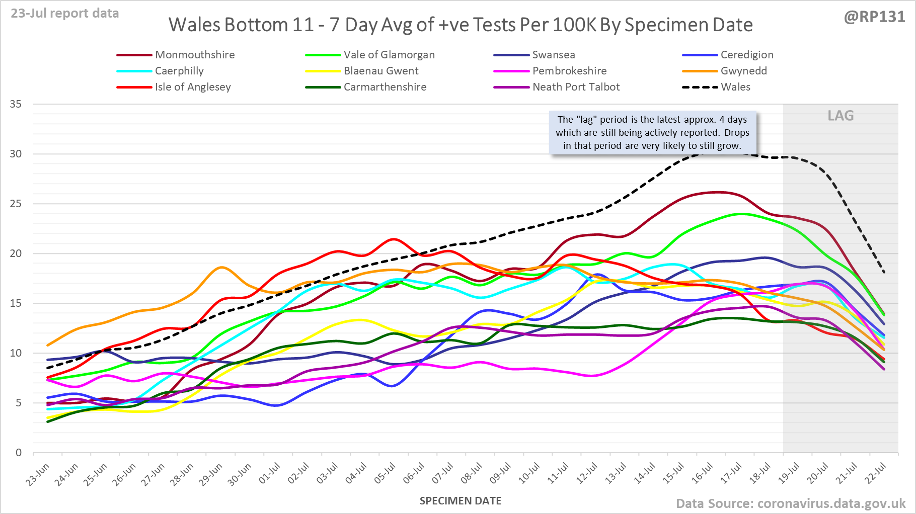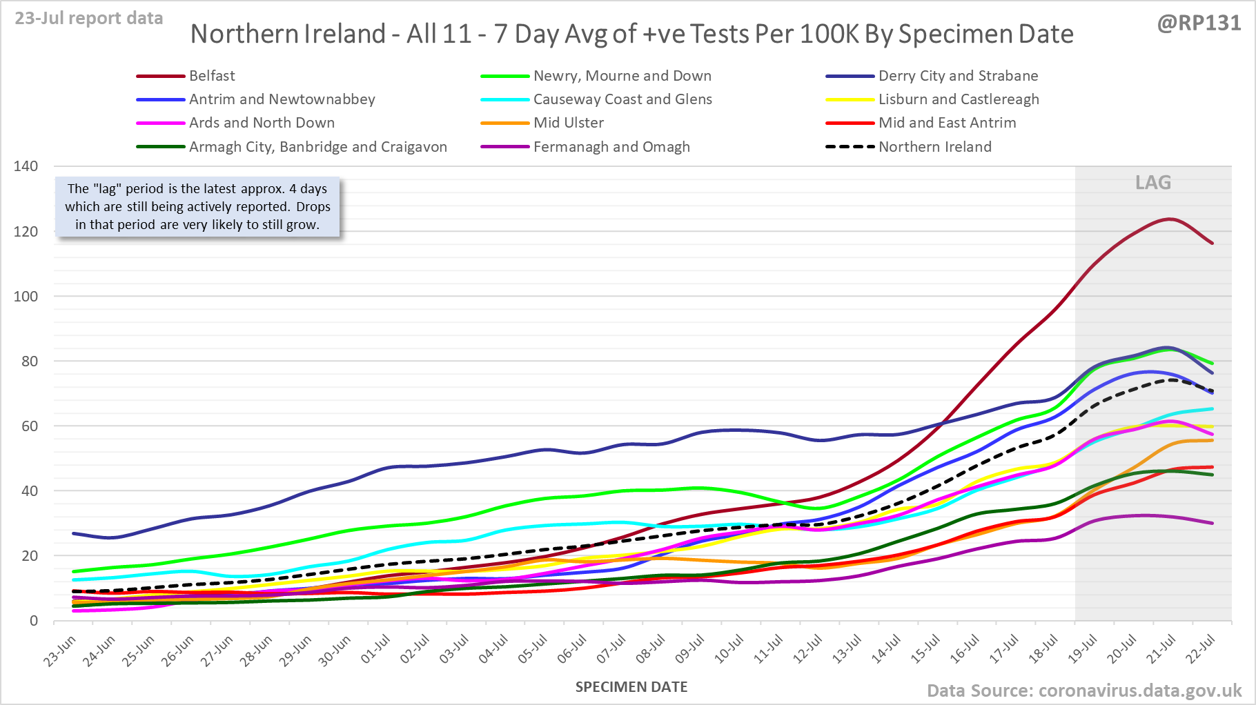 [1/23] #covid19uk - Detailed positive tests thread. The majority of this thread is a set of views of rolling 7 day average positives per 100K by specimen date. Starting with England regions: