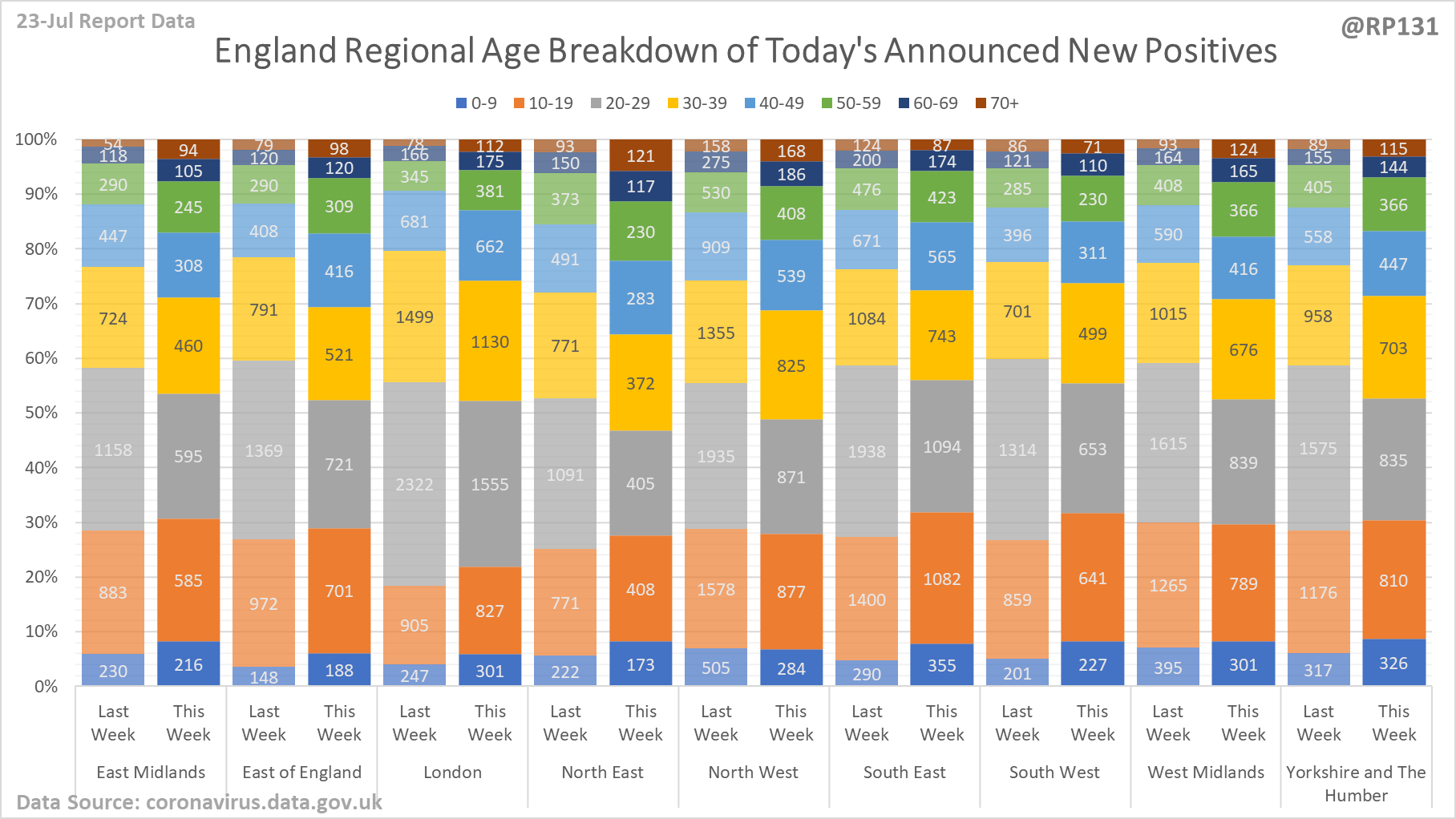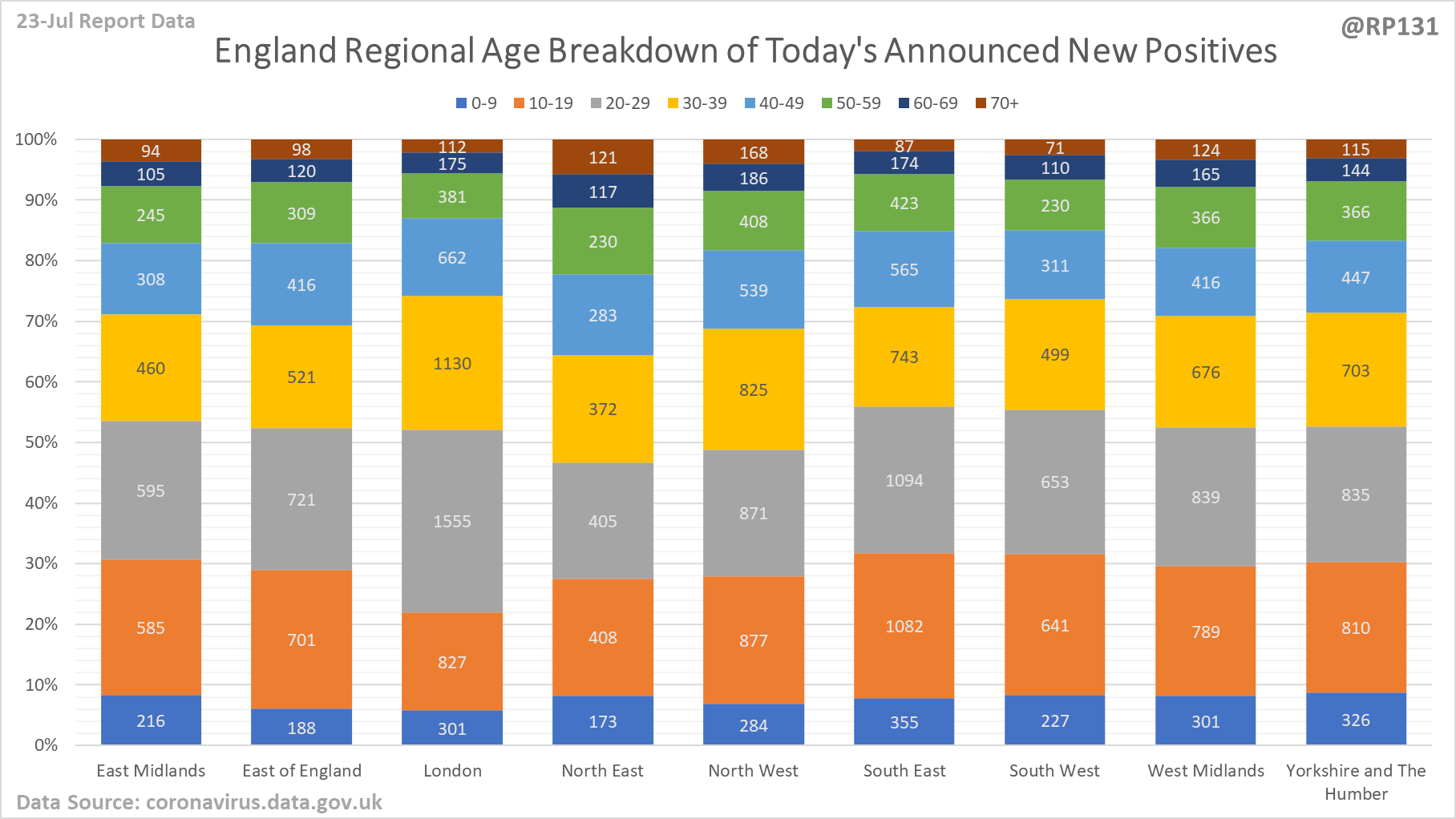 [15/23] Regional / age distribution of today's newly announced positives for England.