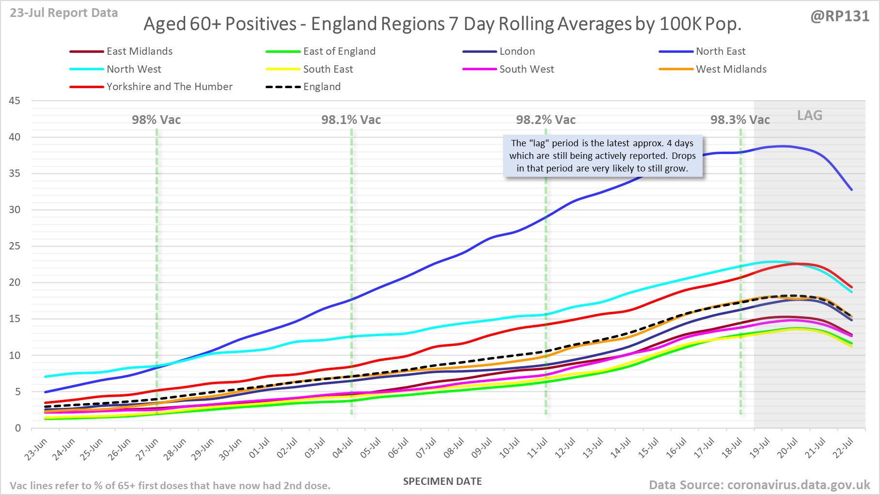 [19/23] England regional rolling average positives (per 100K population) in the 60+ age range: