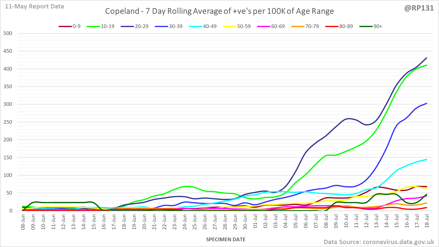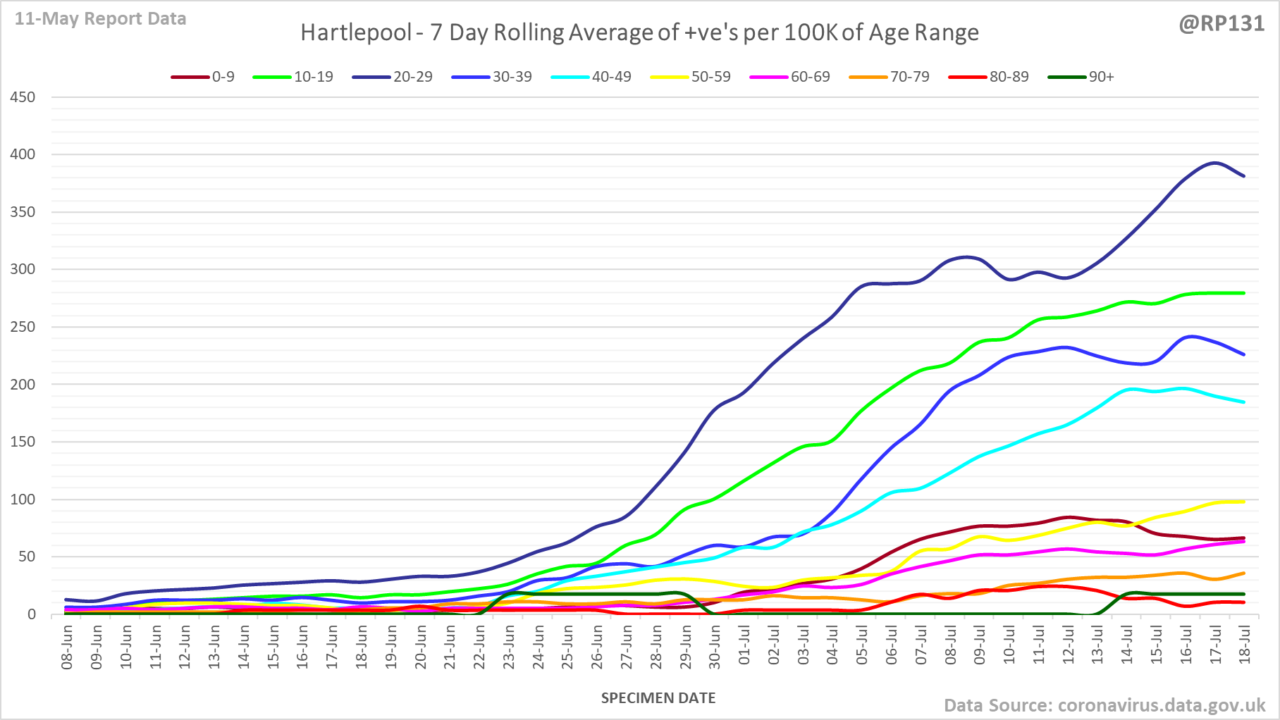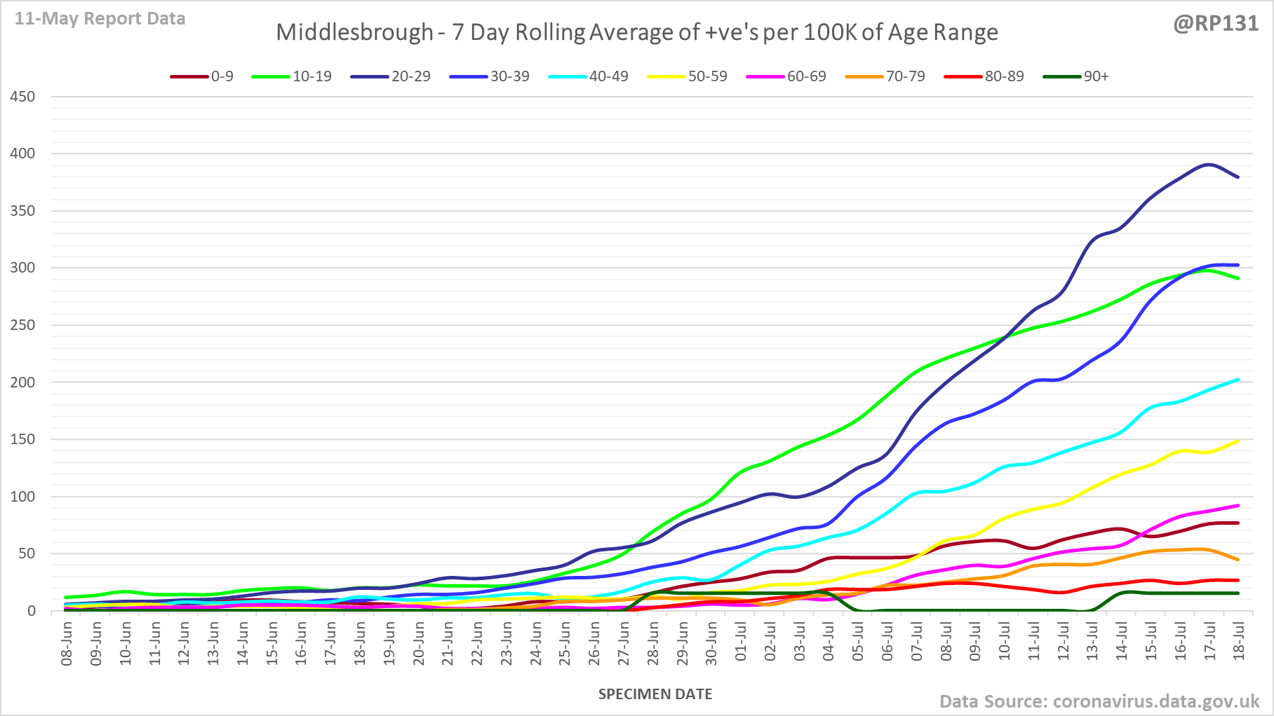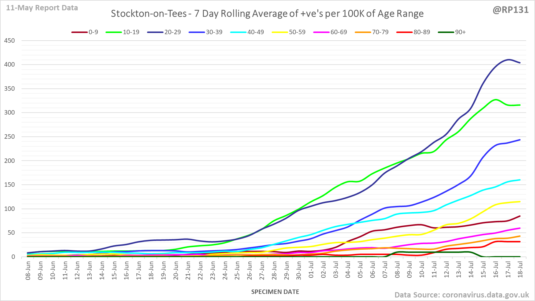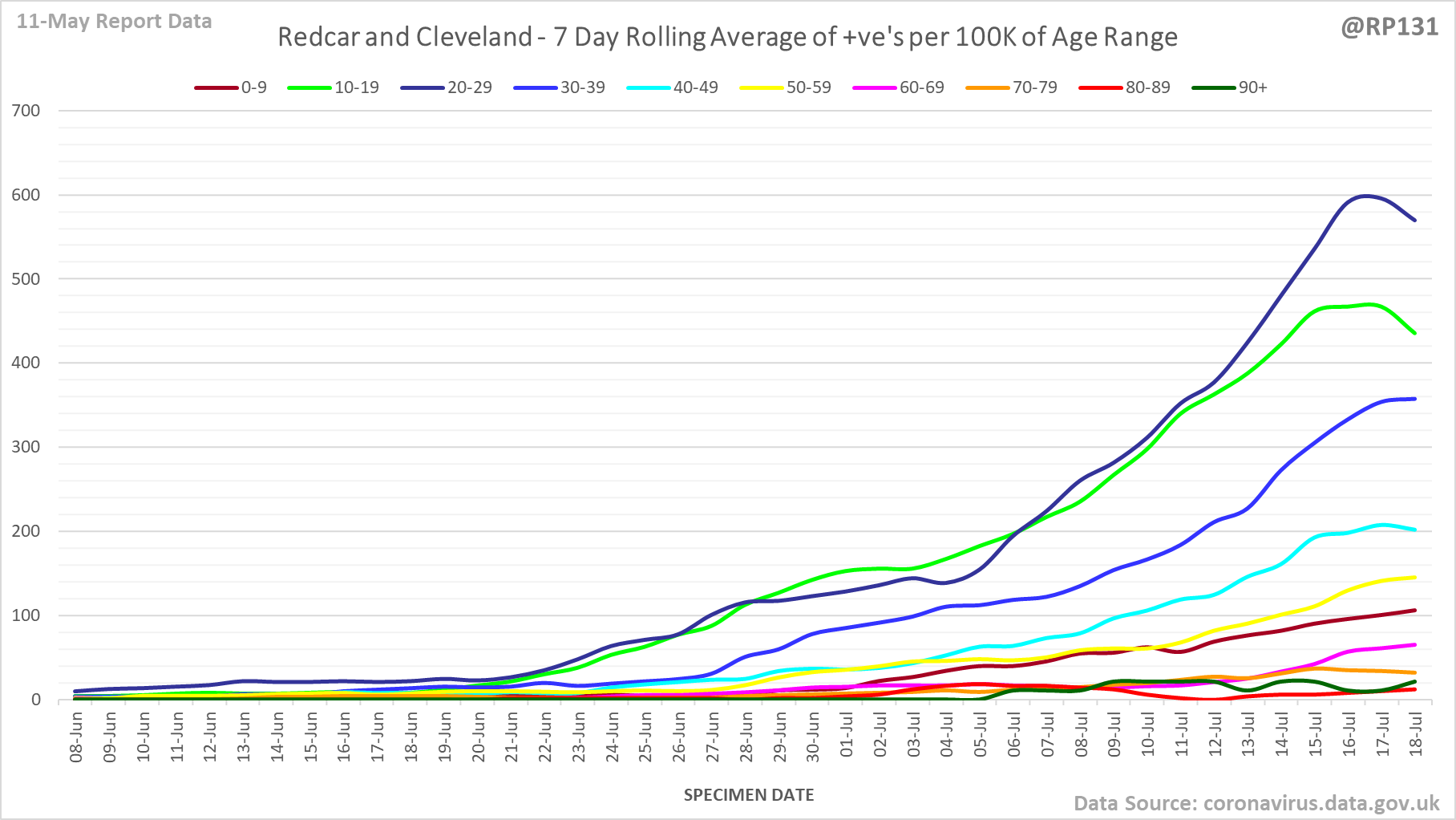 [20/23] Age breakdown chart for Redcar and Cleveland (current top LA). Rolling average of positive tests by specimen date per 100K population of each age range.