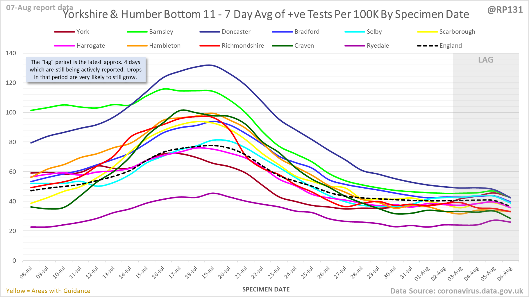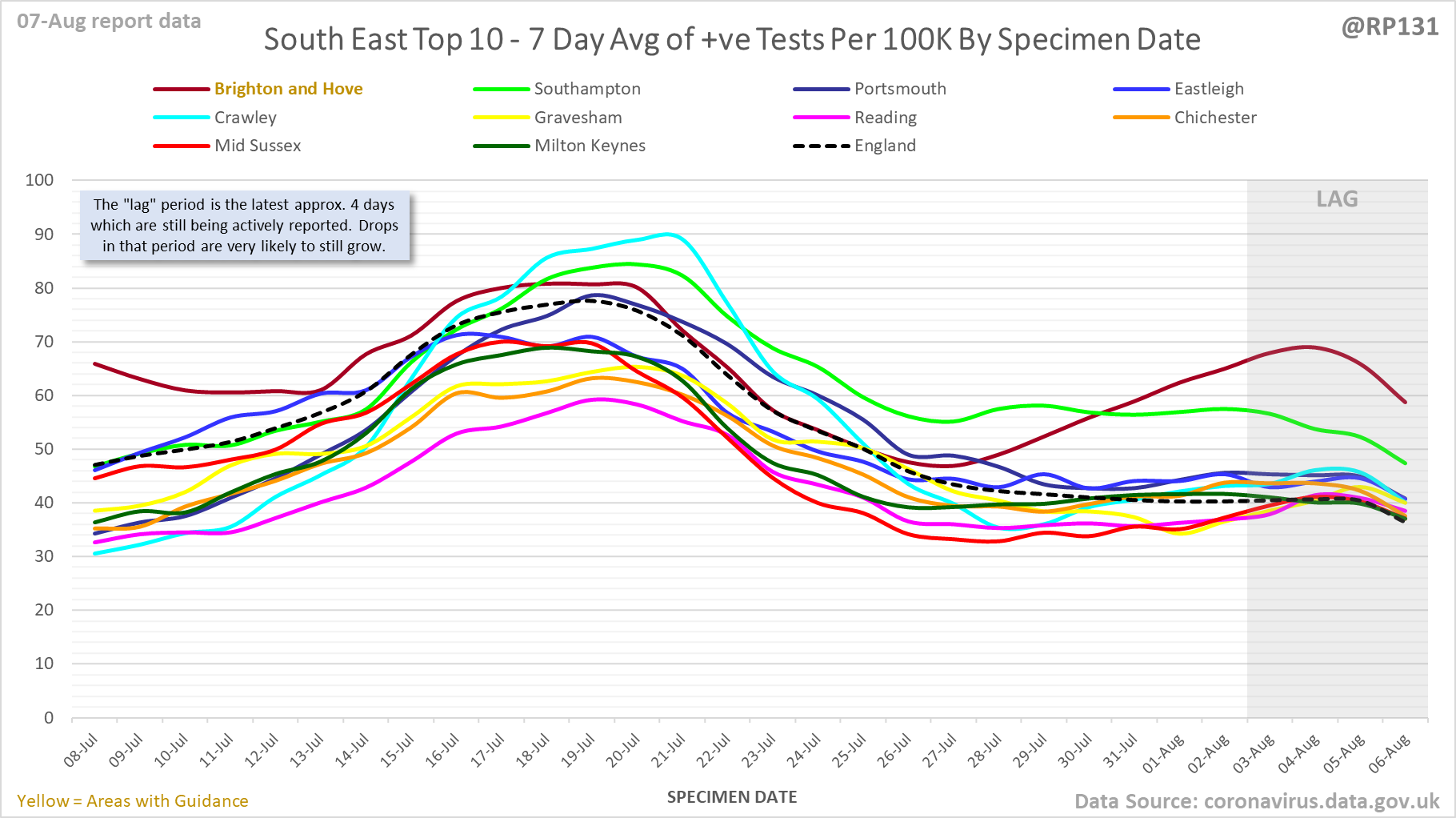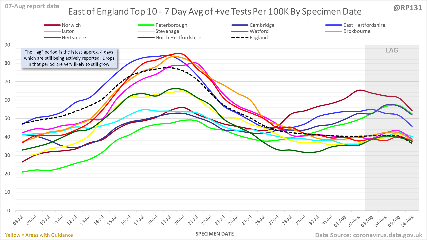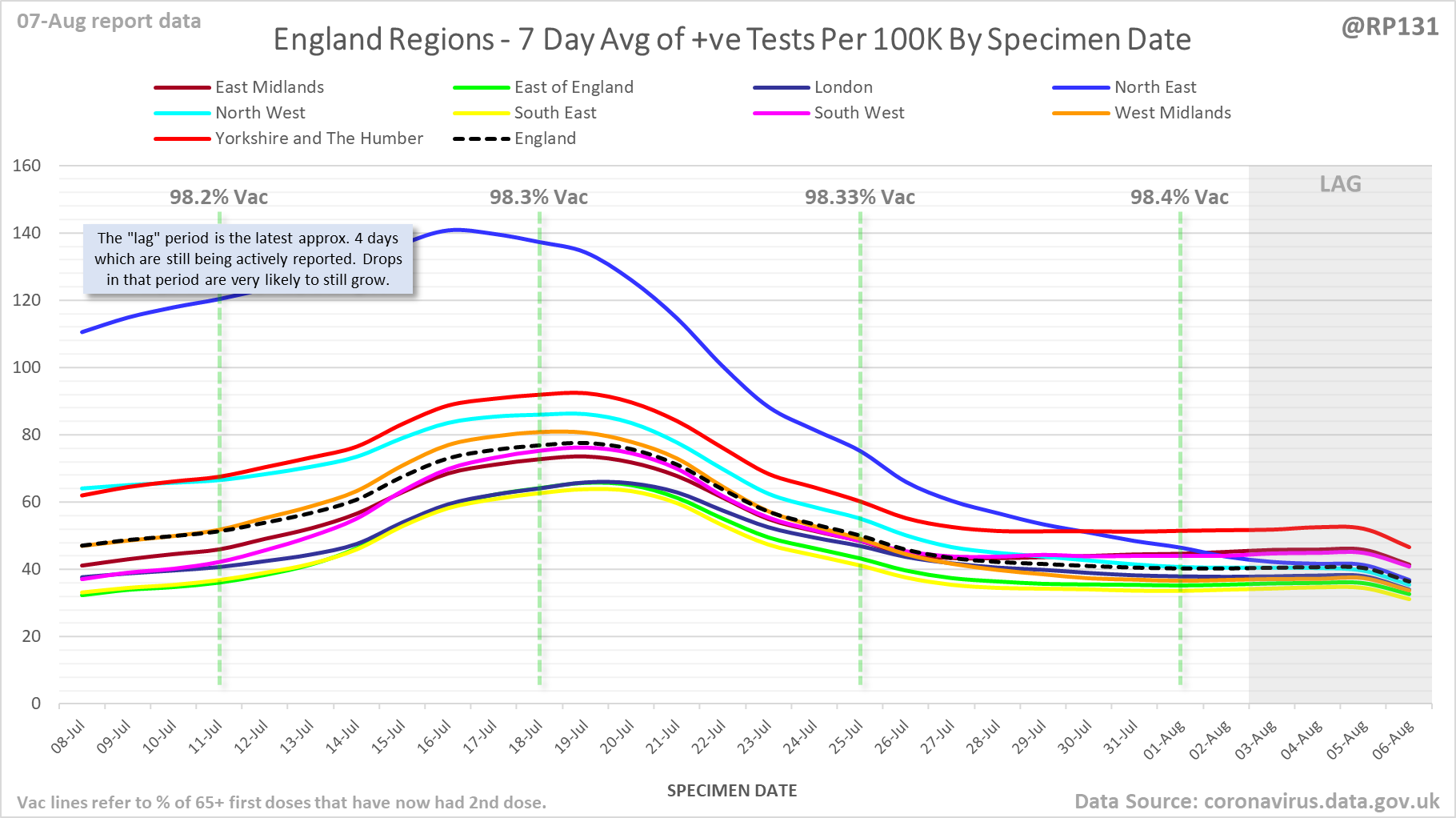 [1/23] #covid19uk - Detailed positive tests thread. The majority of this thread is a set of views of rolling 7 day average positives per 100K by specimen date. Starting with England regions: