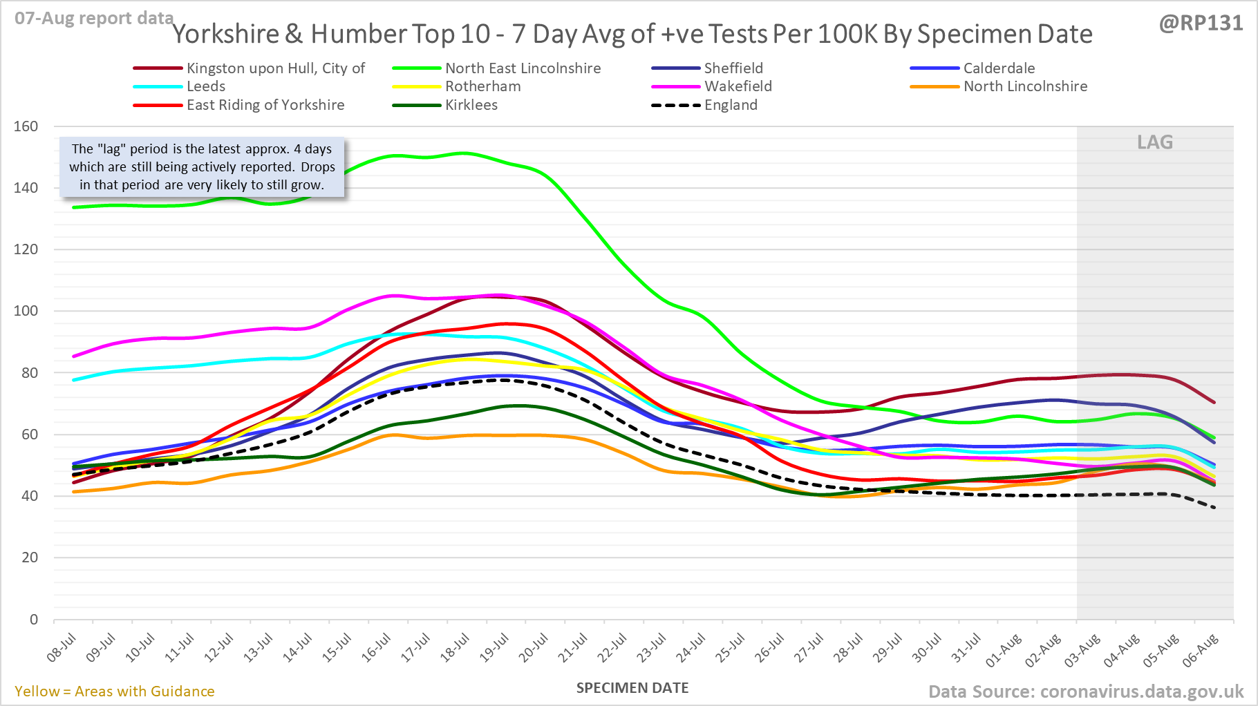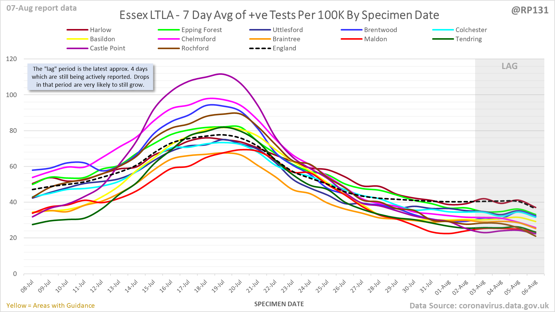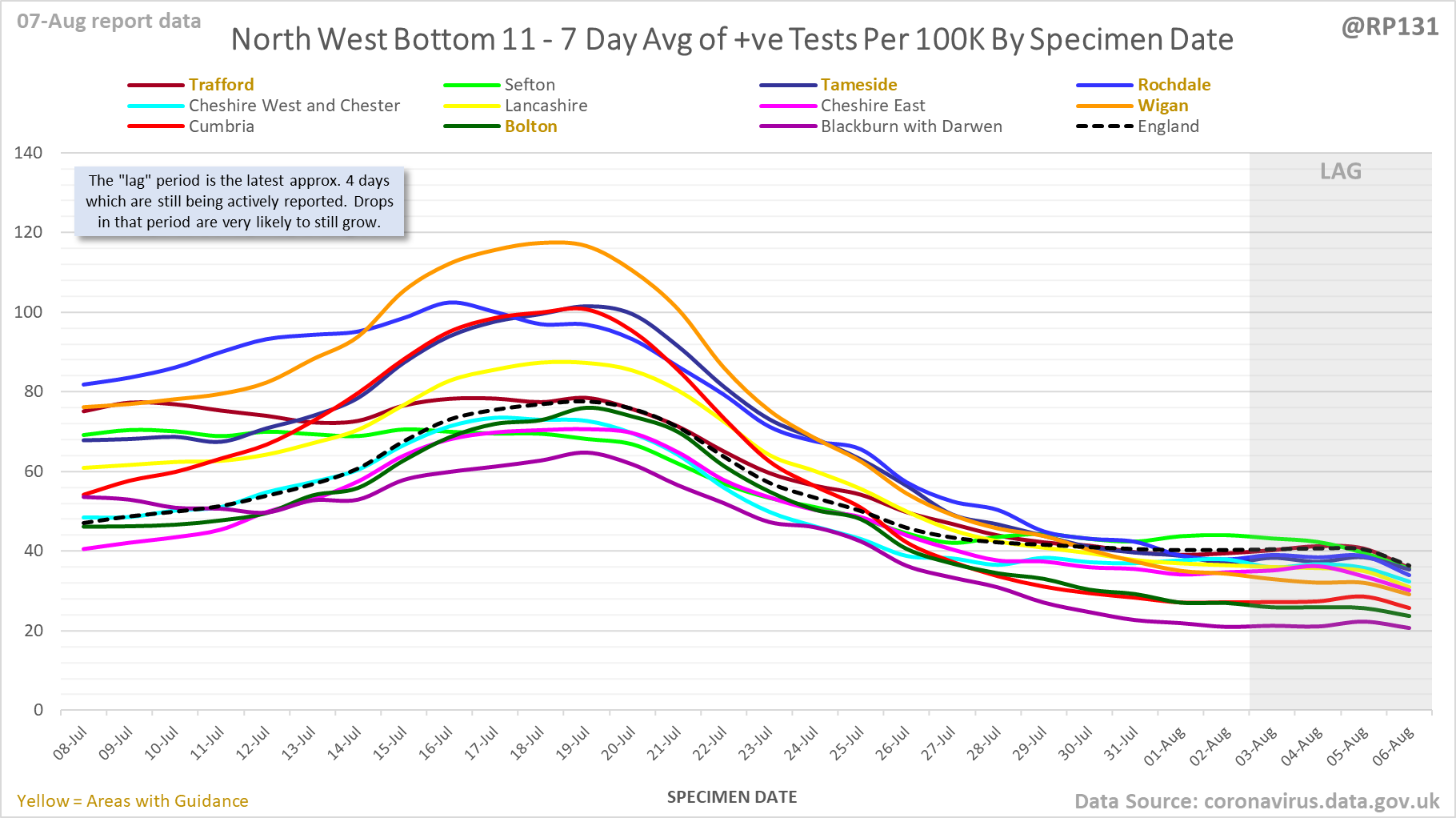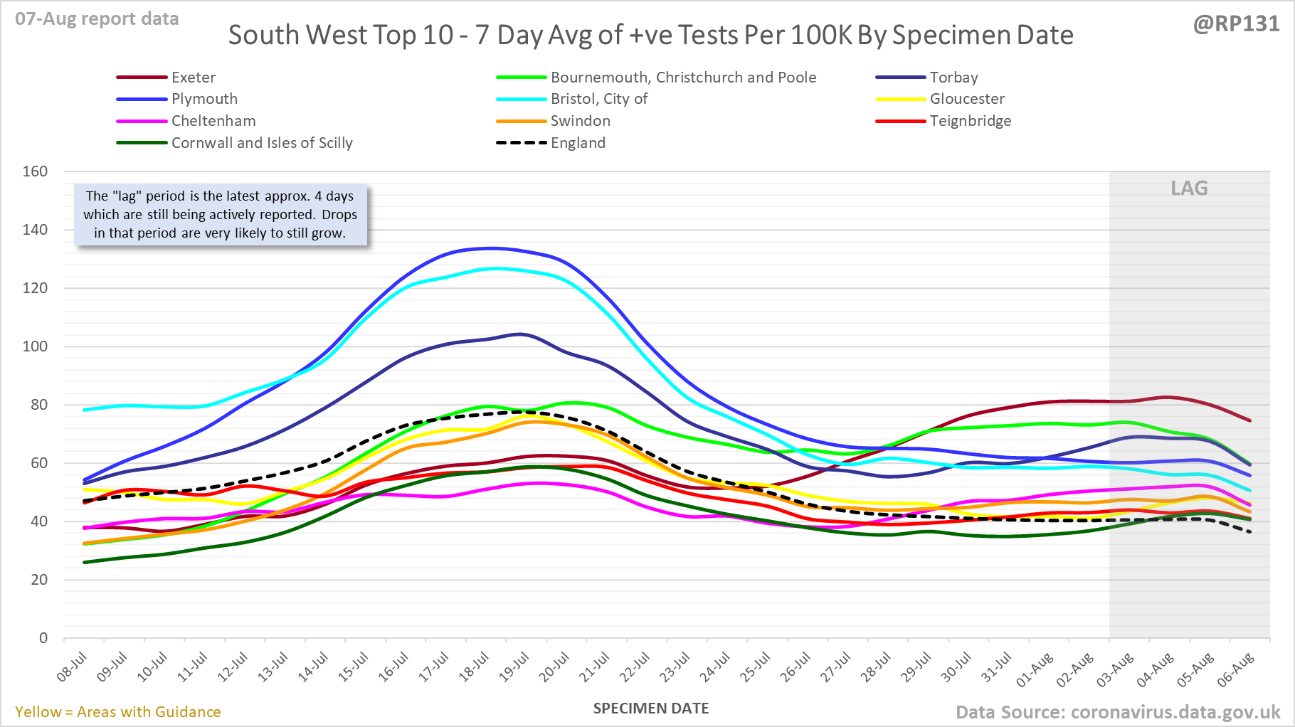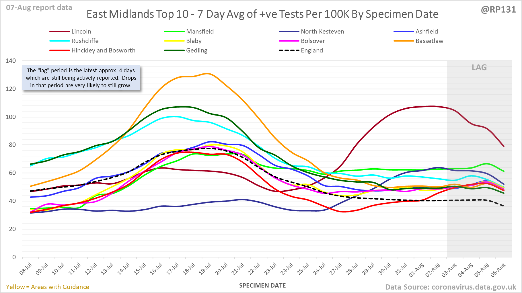 [1/23] #covid19uk - Detailed positive tests thread. The majority of this thread is a set of views of rolling 7 day average positives per 100K by specimen date. Starting with England regions: