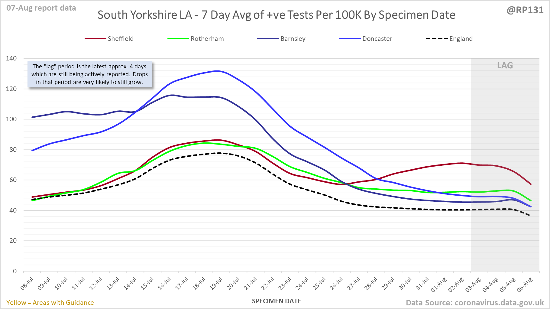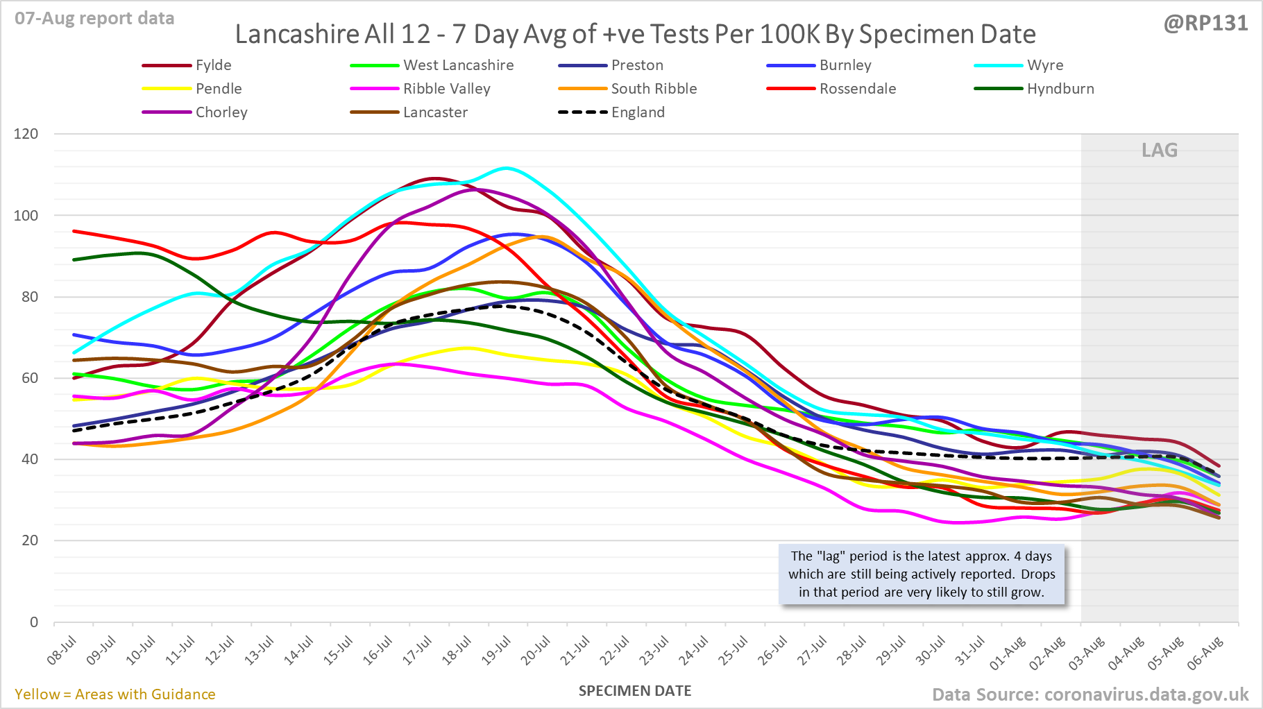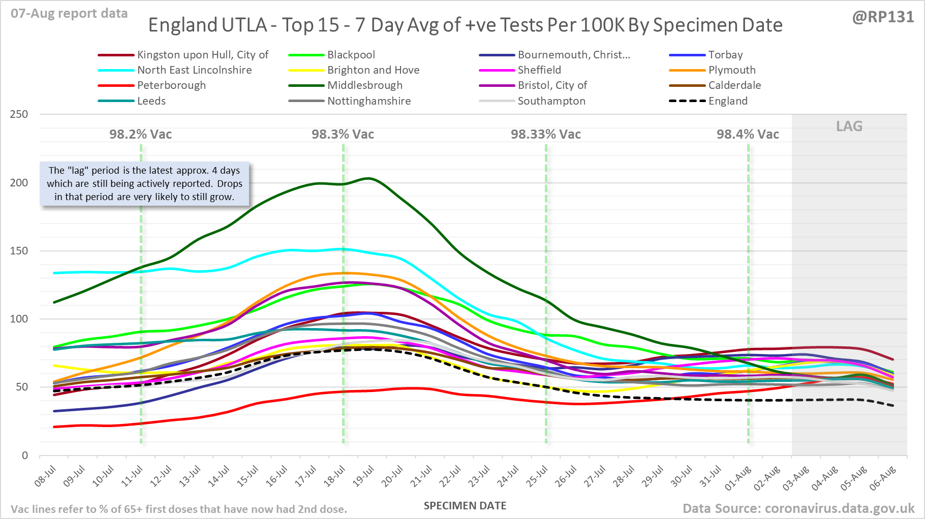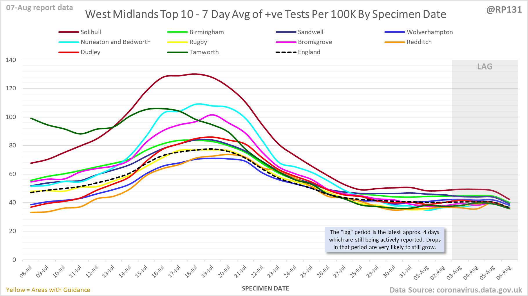 [1/23] #covid19uk - Detailed positive tests thread. The majority of this thread is a set of views of rolling 7 day average positives per 100K by specimen date. Starting with England regions: