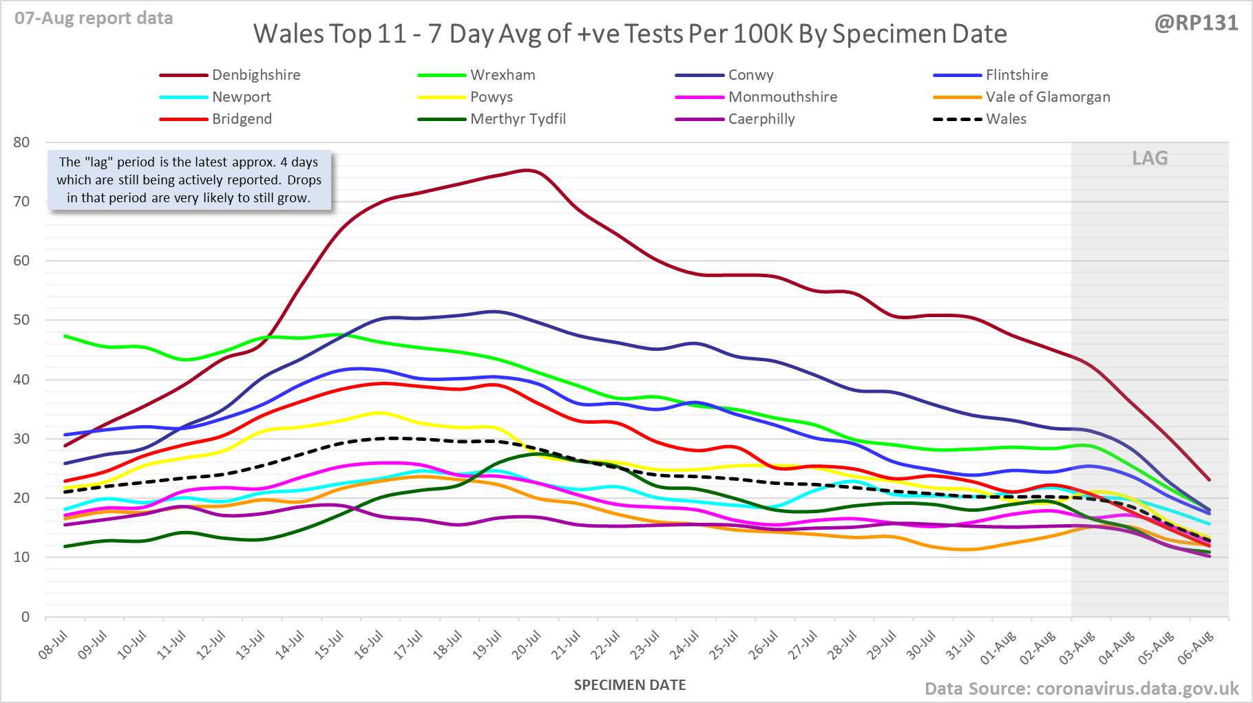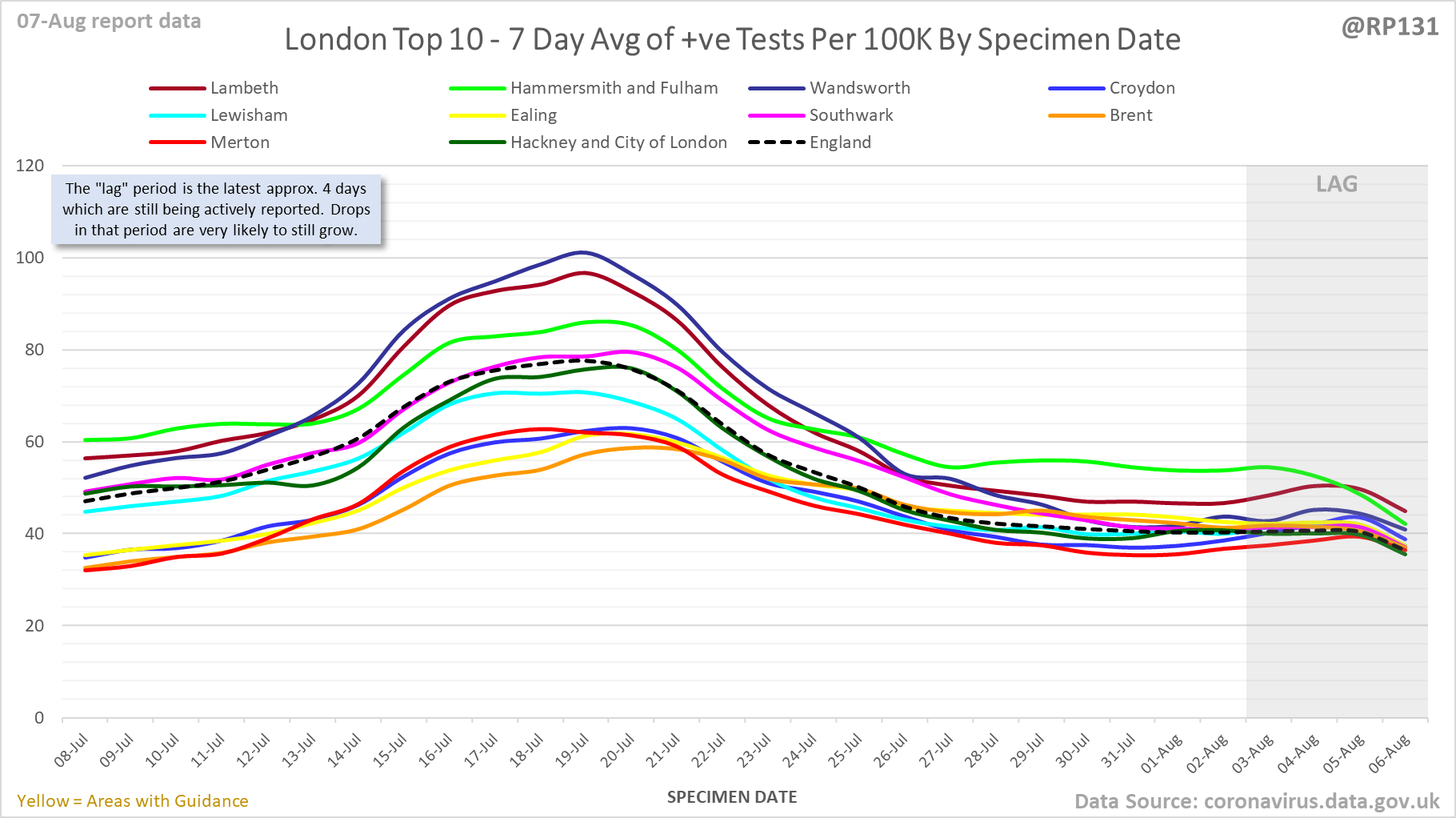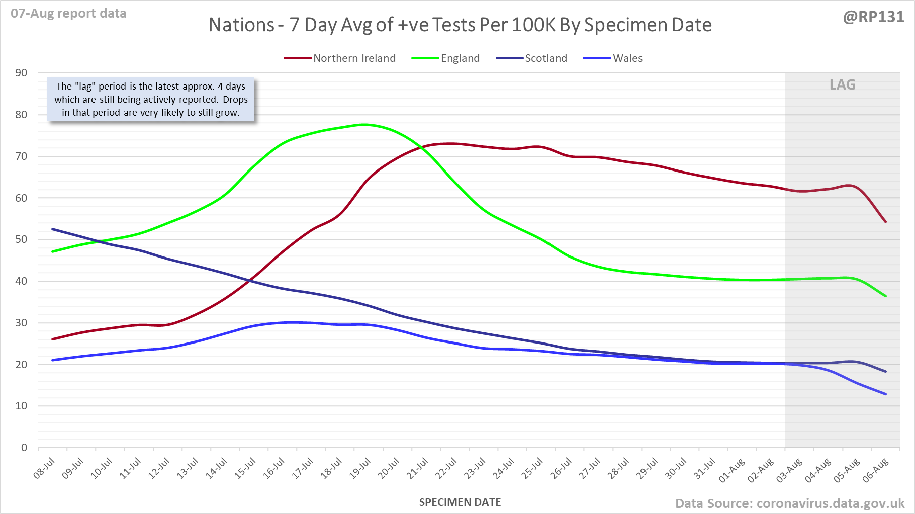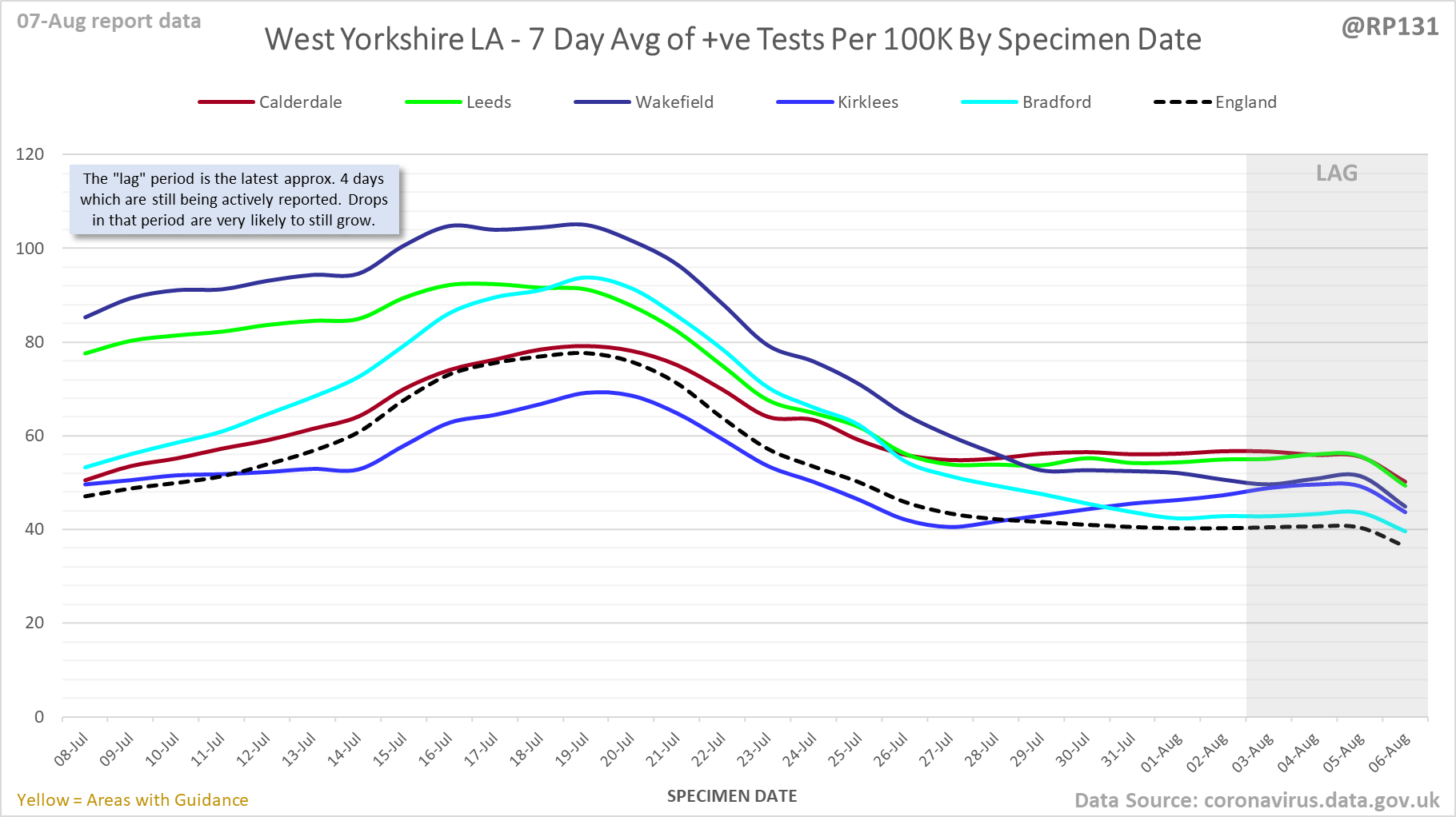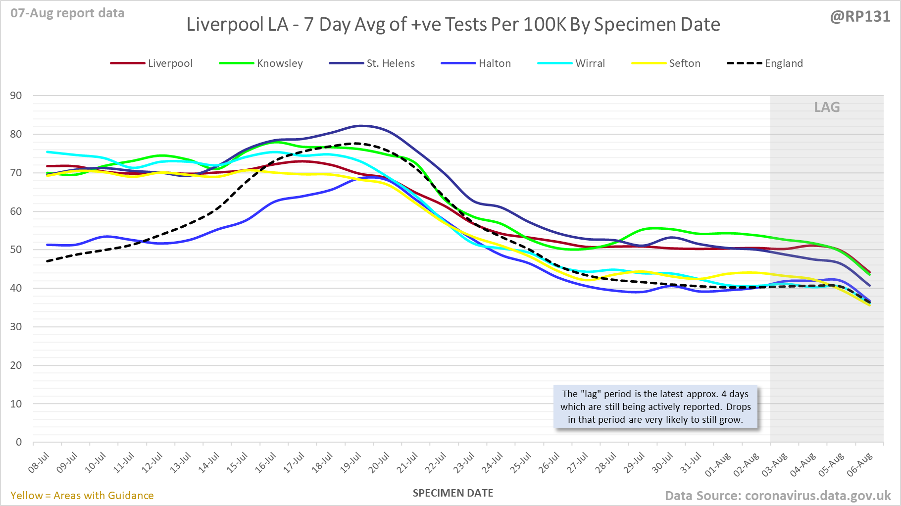 [1/23] #covid19uk - Detailed positive tests thread. The majority of this thread is a set of views of rolling 7 day average positives per 100K by specimen date. Starting with England regions: