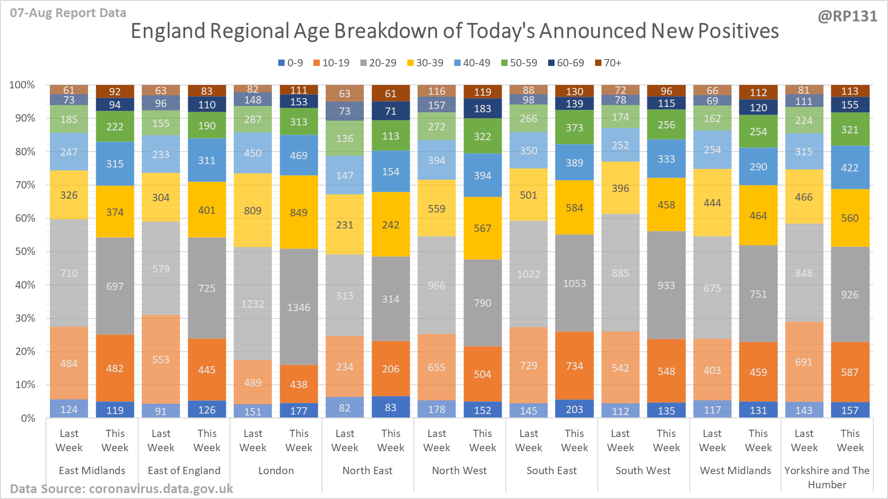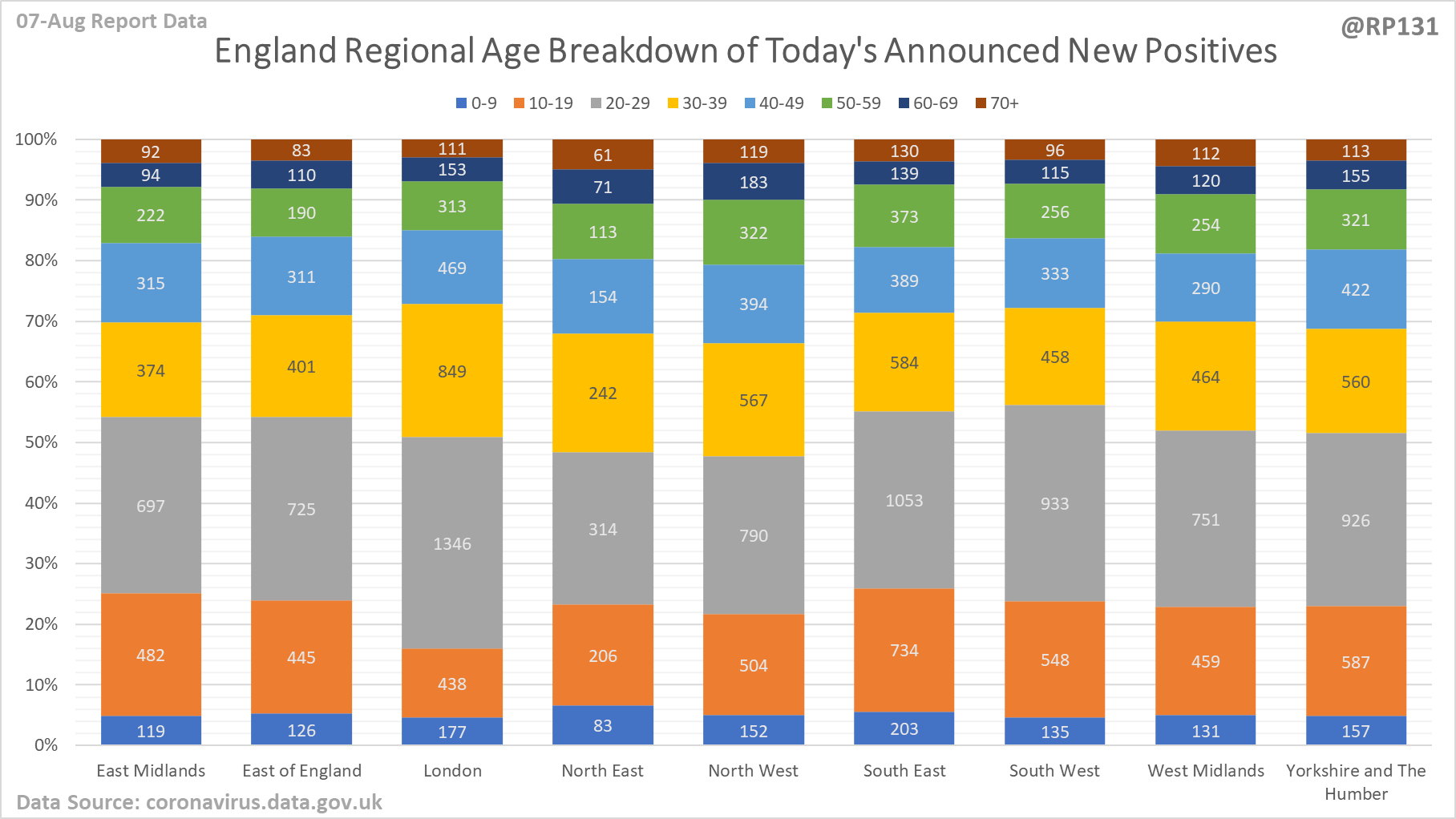 [15/23] Regional / age distribution of today's newly announced positives for England.