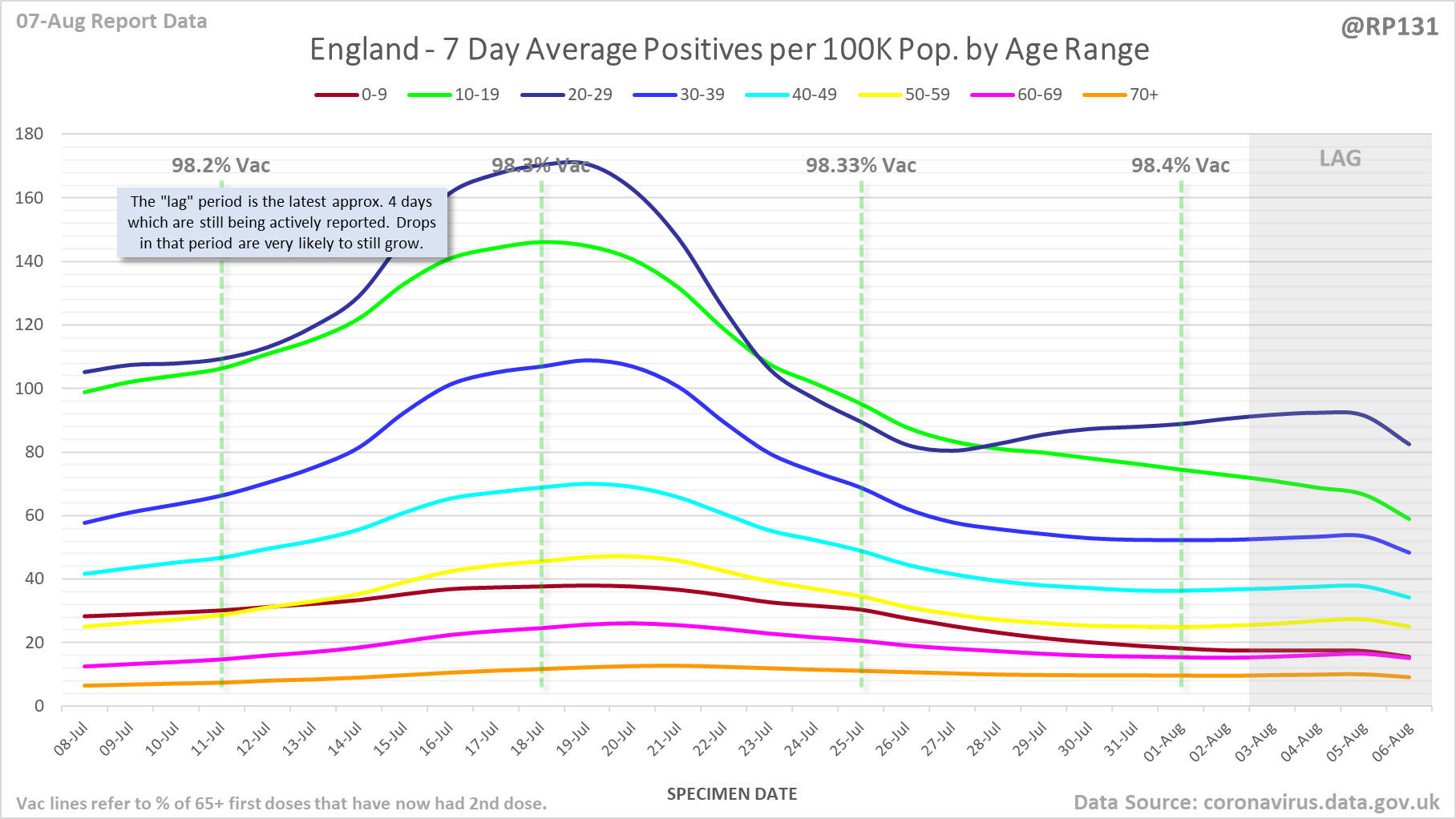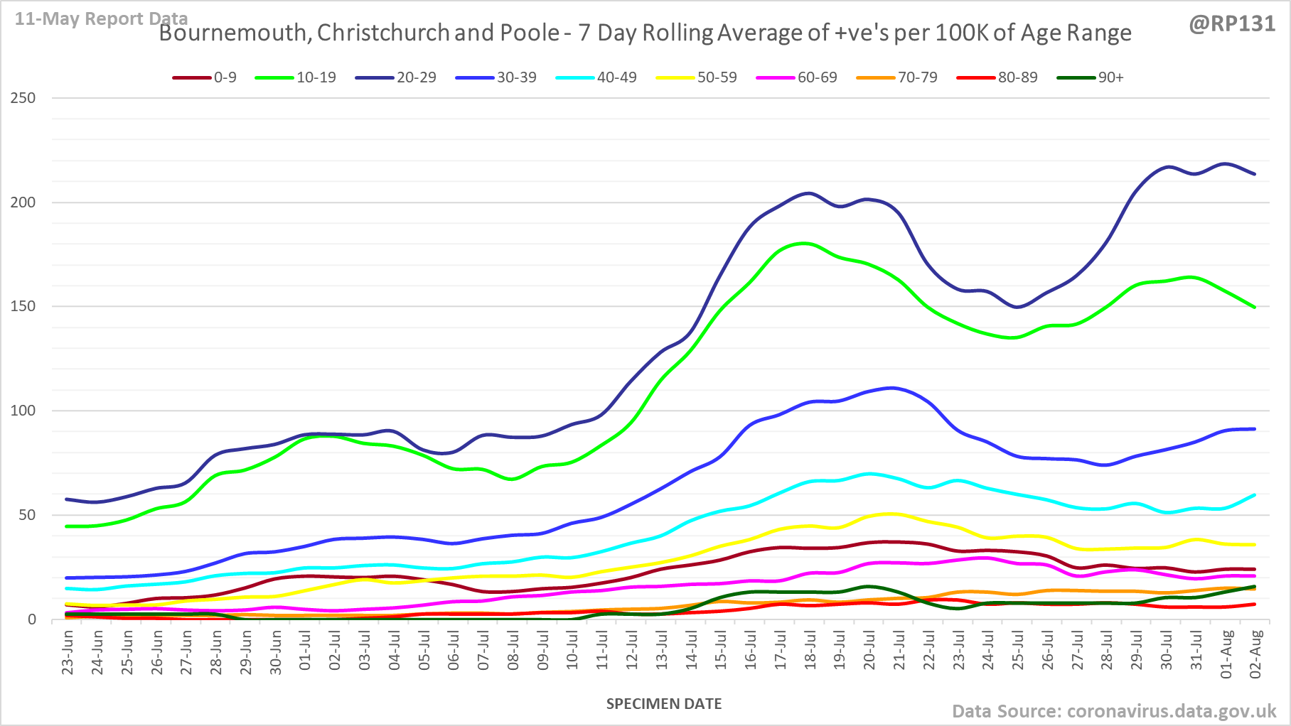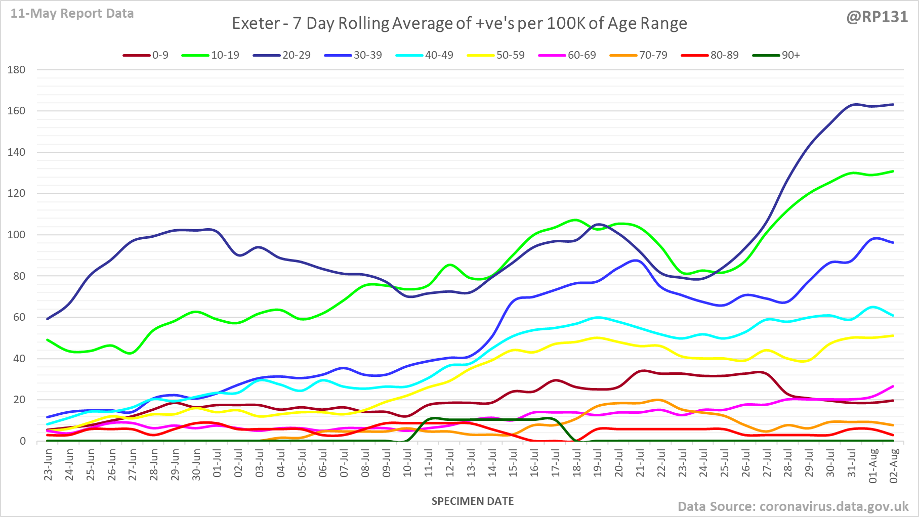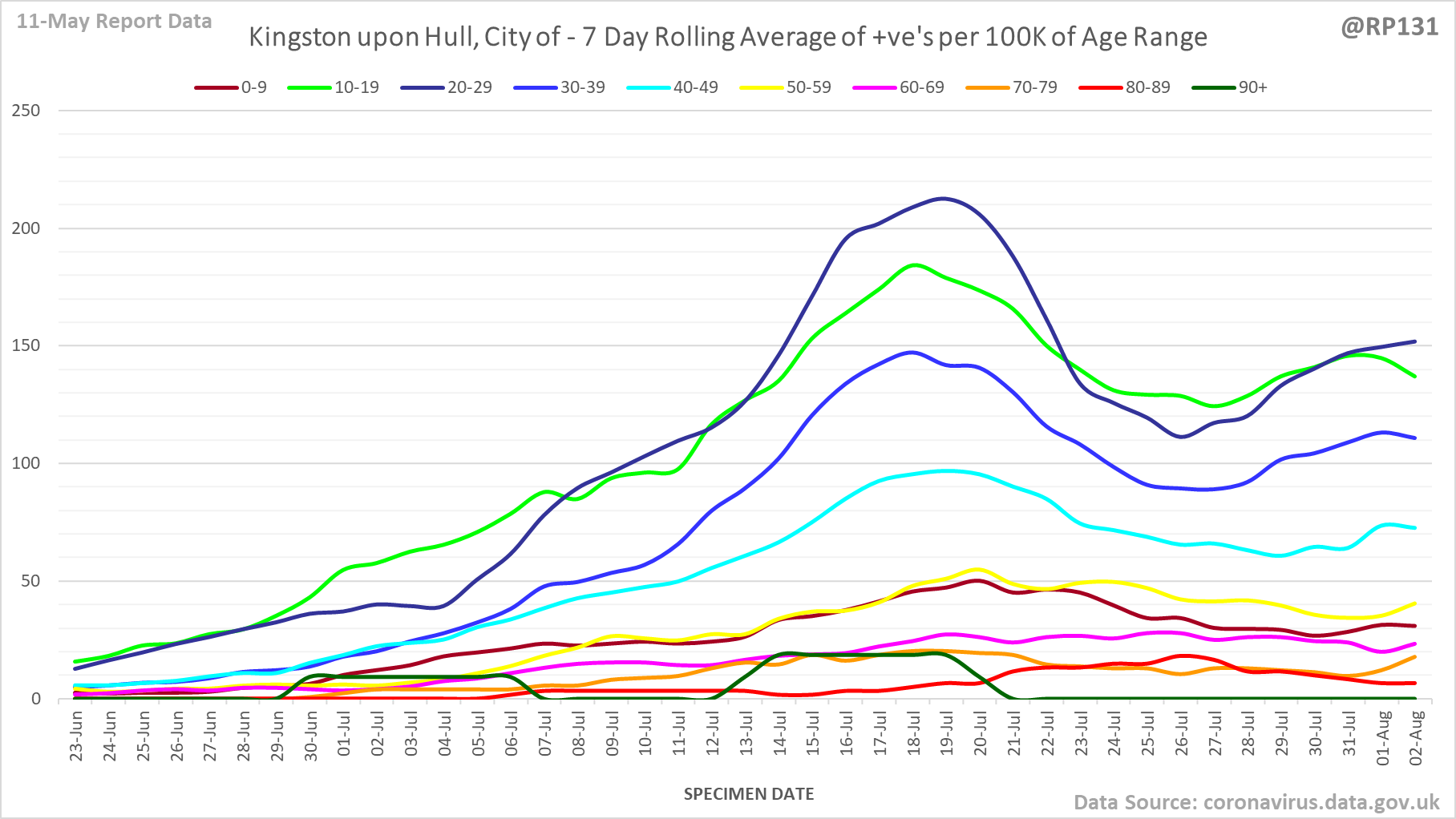 [17/23] England rolling average positives (per 100K population) by age range: