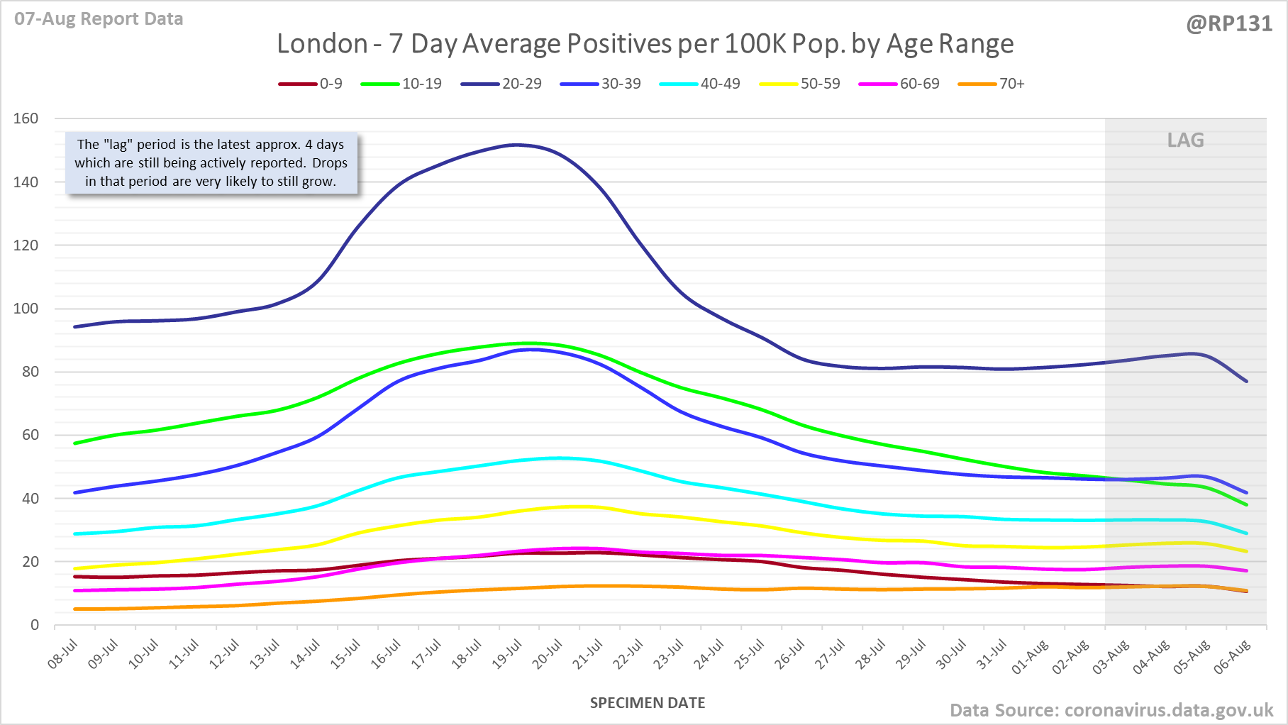 [18/23] London rolling average positives (per 100K population) by age range: