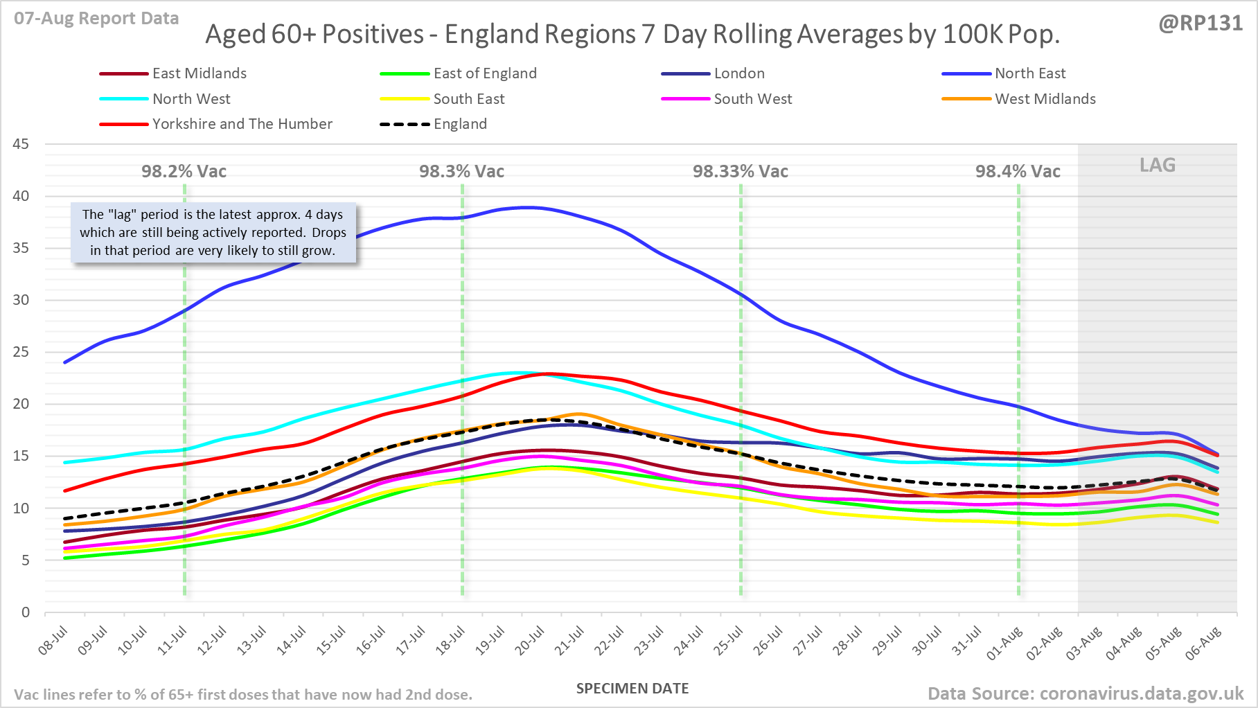 [19/23] England regional rolling average positives (per 100K population) in the 60+ age range: