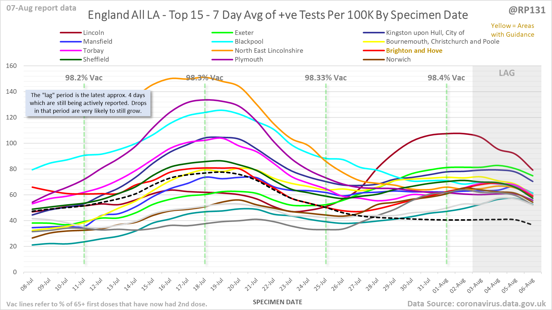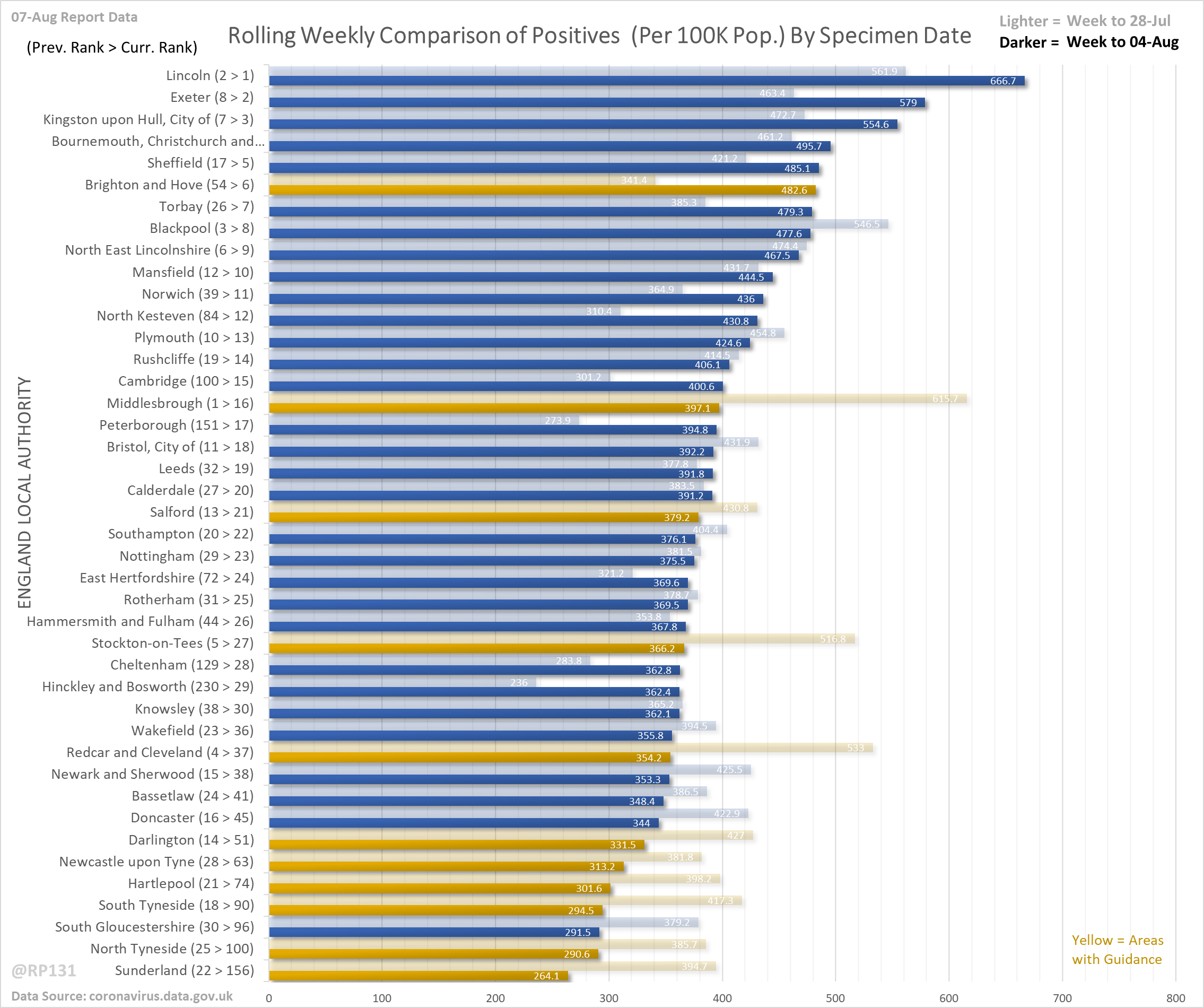 [22/23] Rolling weekly comparison of totals up to 3 days ago. This chart is useful to see the relative movements of the local authorities towards the top of the list.