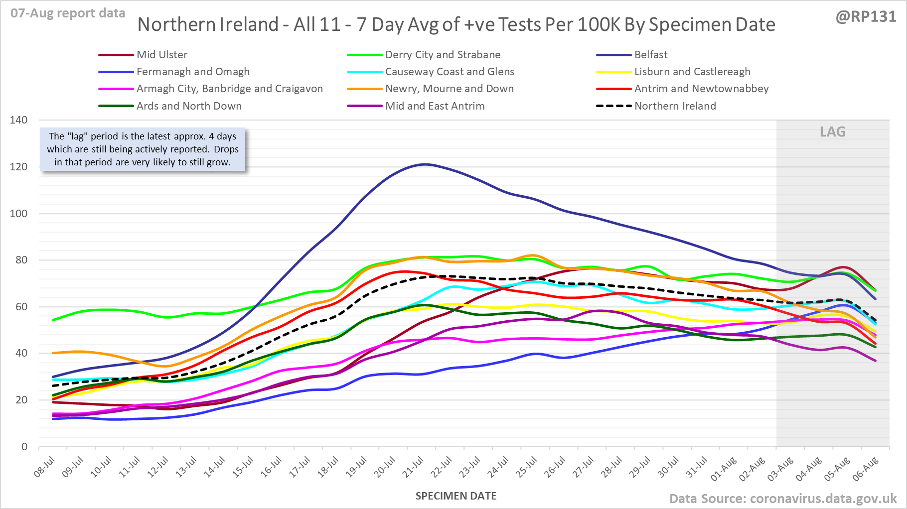 [20/23] Age breakdown chart for Lincoln (current top LA). Rolling average of positive tests by specimen date per 100K population of each age range.