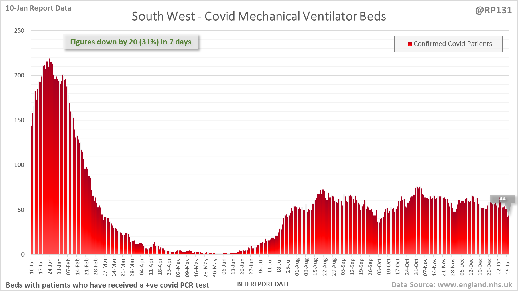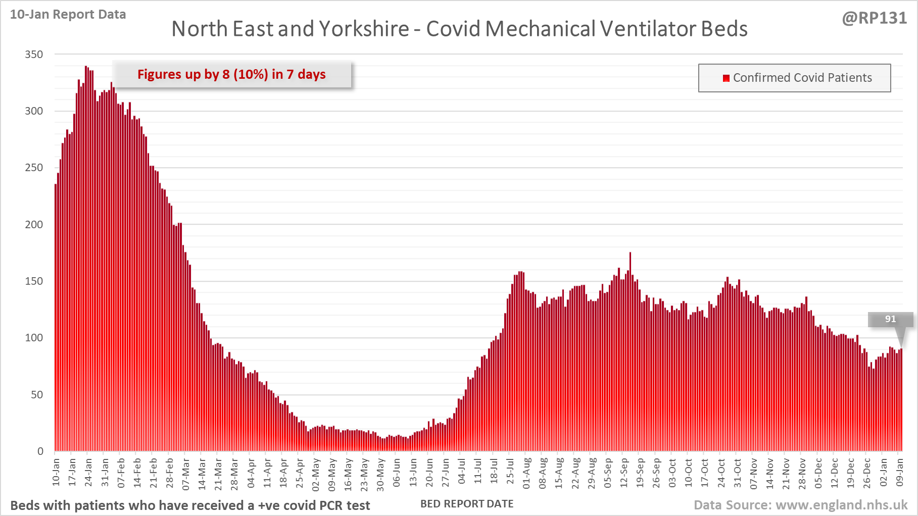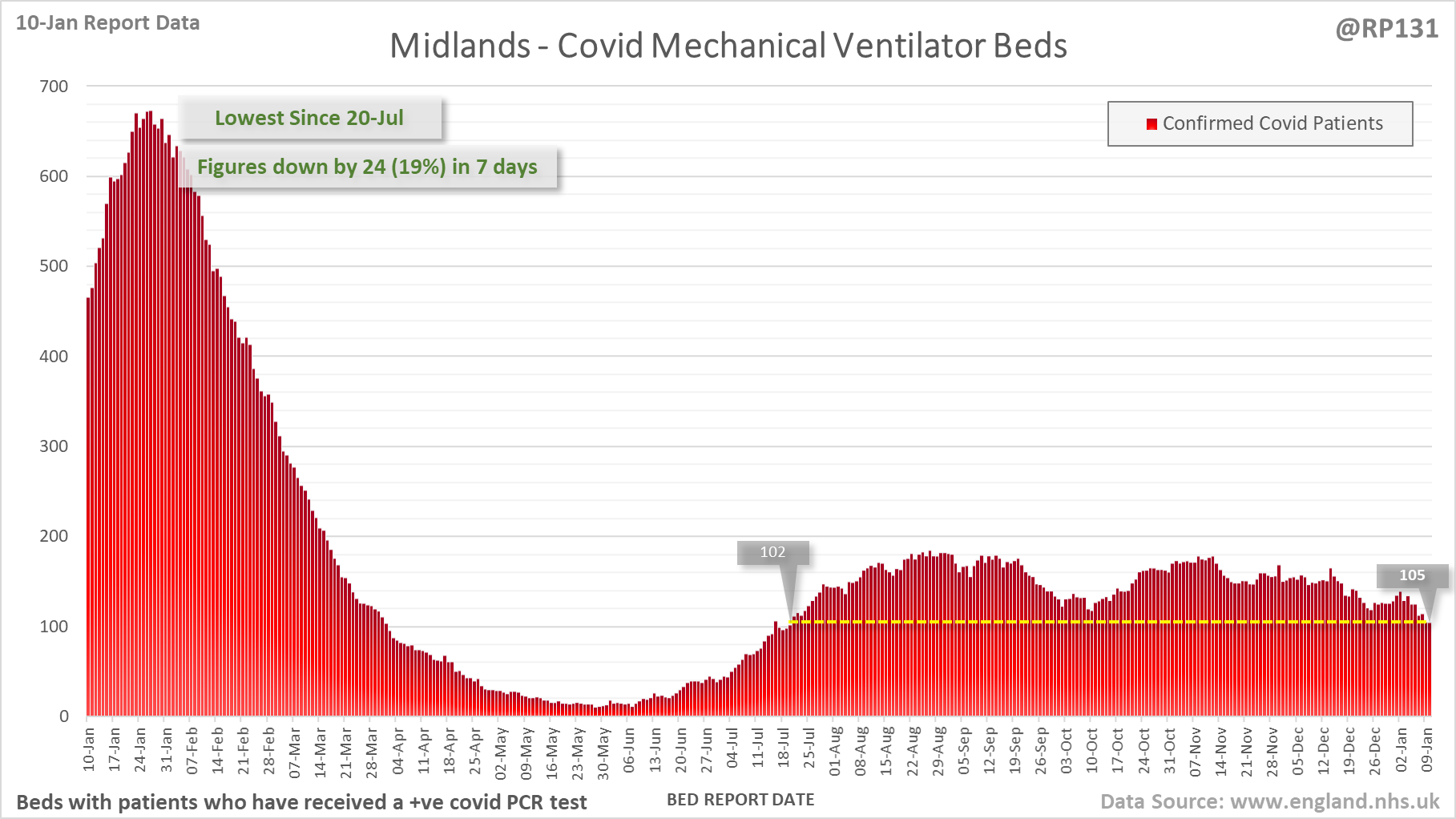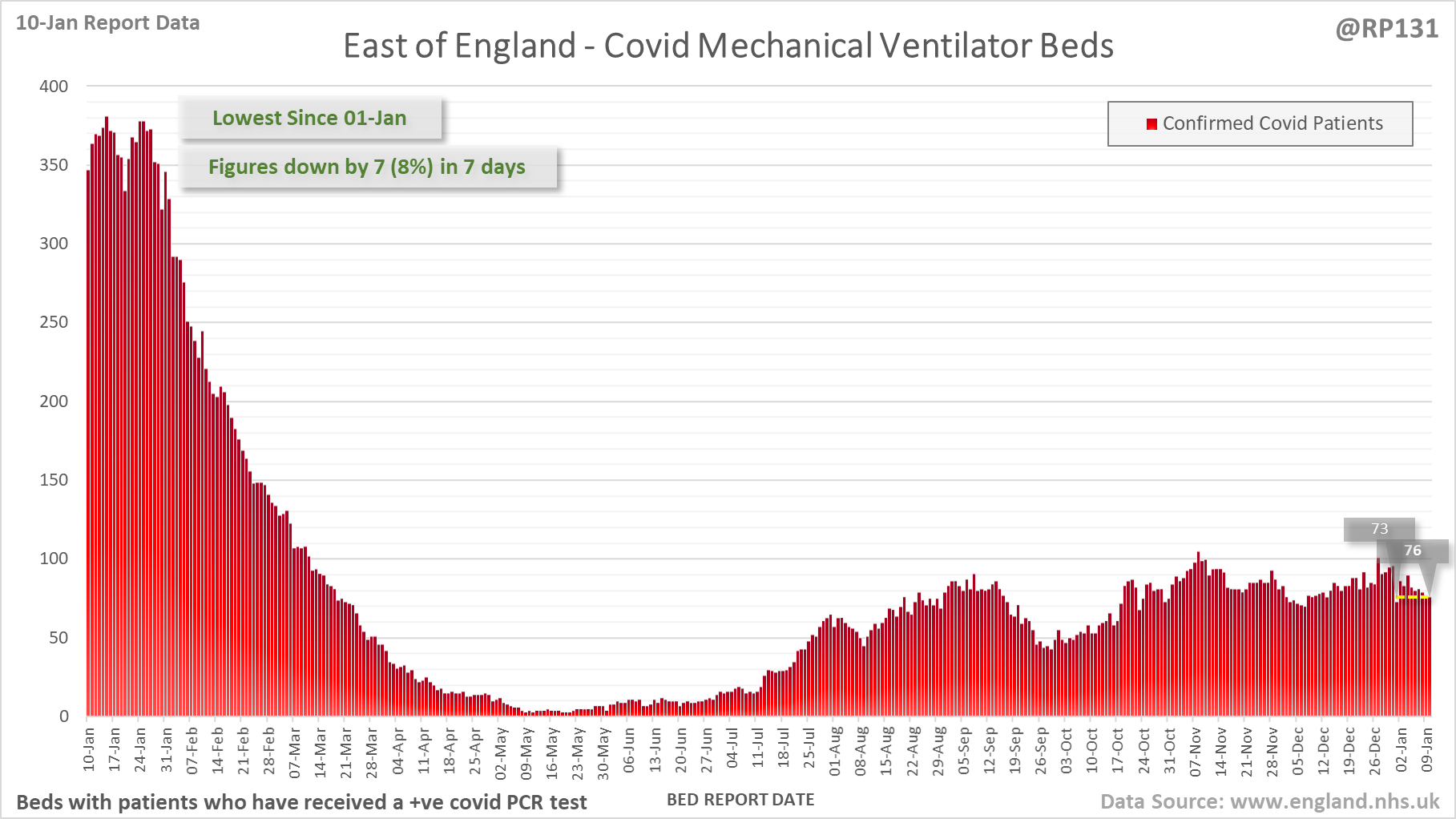 [1/28] Latest view on England mechanical ventilator beds (with a positive covid test), as of 8am on 10-Jan.
