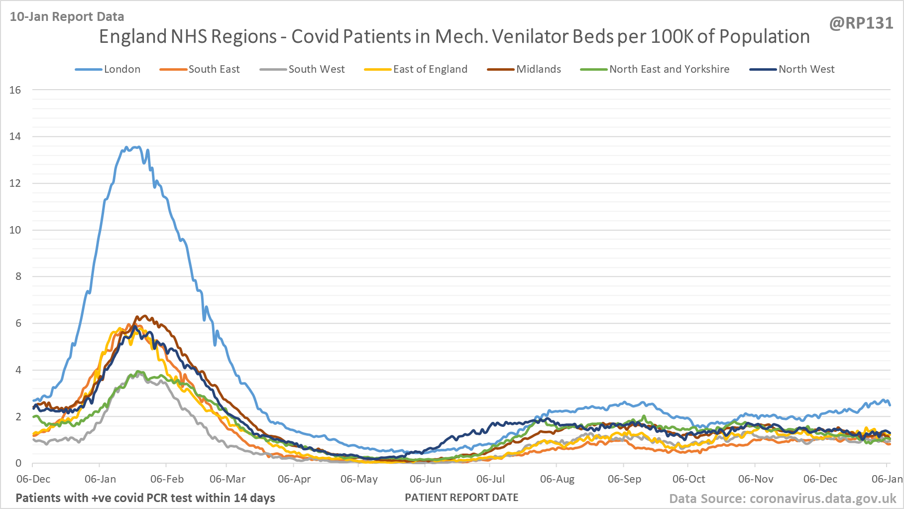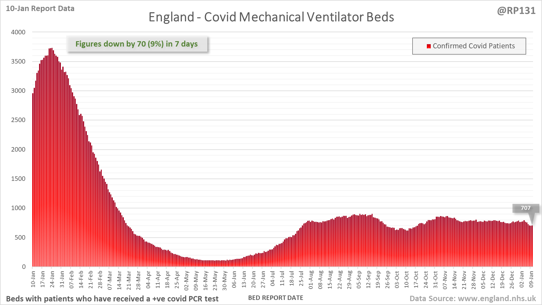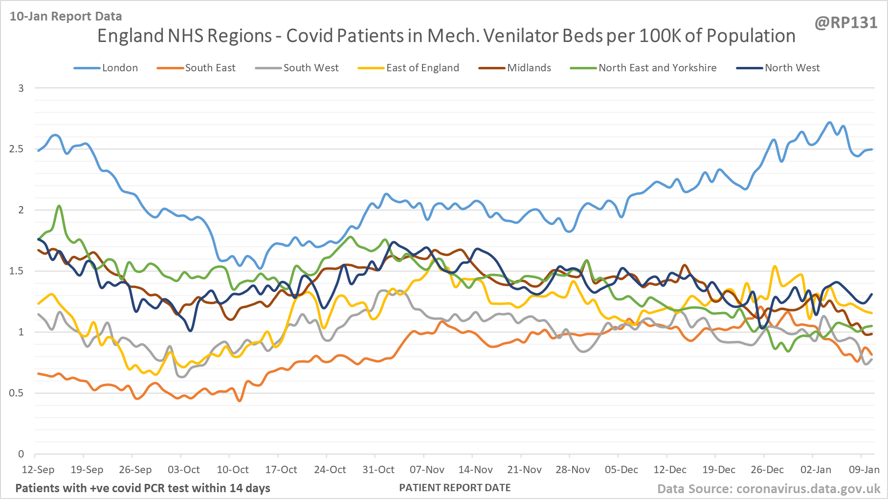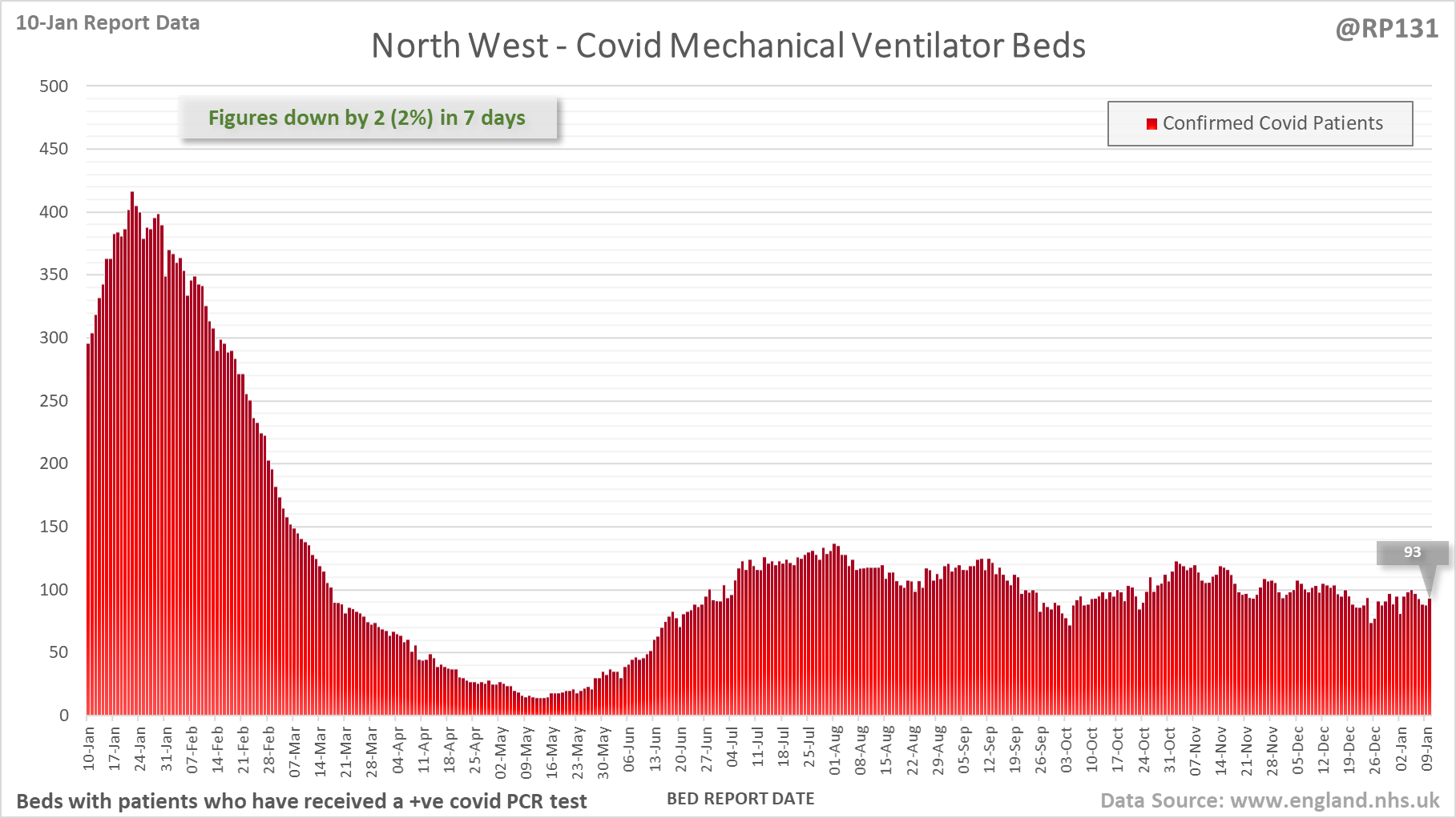[1/28] Latest view on England mechanical ventilator beds (with a positive covid test), as of 8am on 10-Jan.