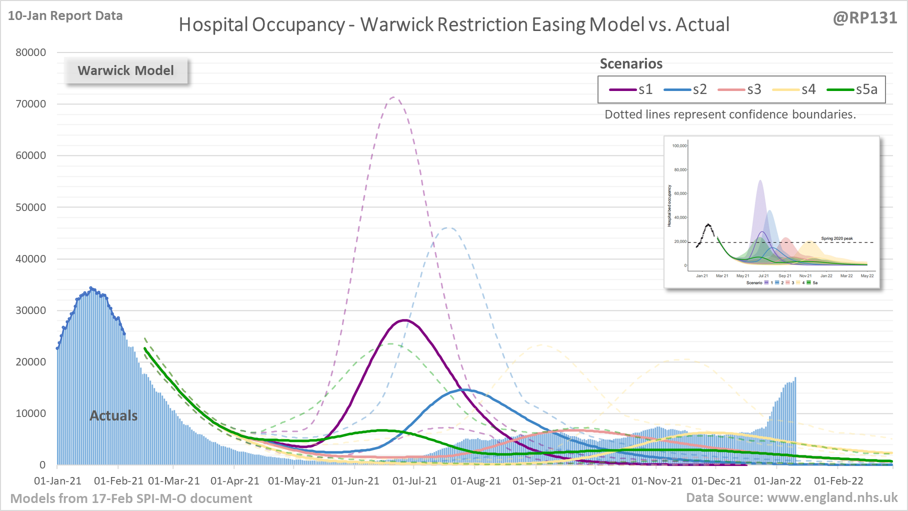 [20/28] Chart to compare current England hospital bed occupancy actuals against the various scenarios of the Warwick model from the 17-Feb SPI-M-O document on easing of restrictions.