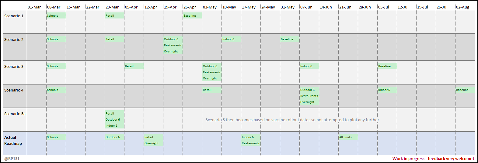 [22/28] Timeline illustration of the various scenarios used for the modelling that supported unlock roadmap planning. Work in progress - feedback welcome!