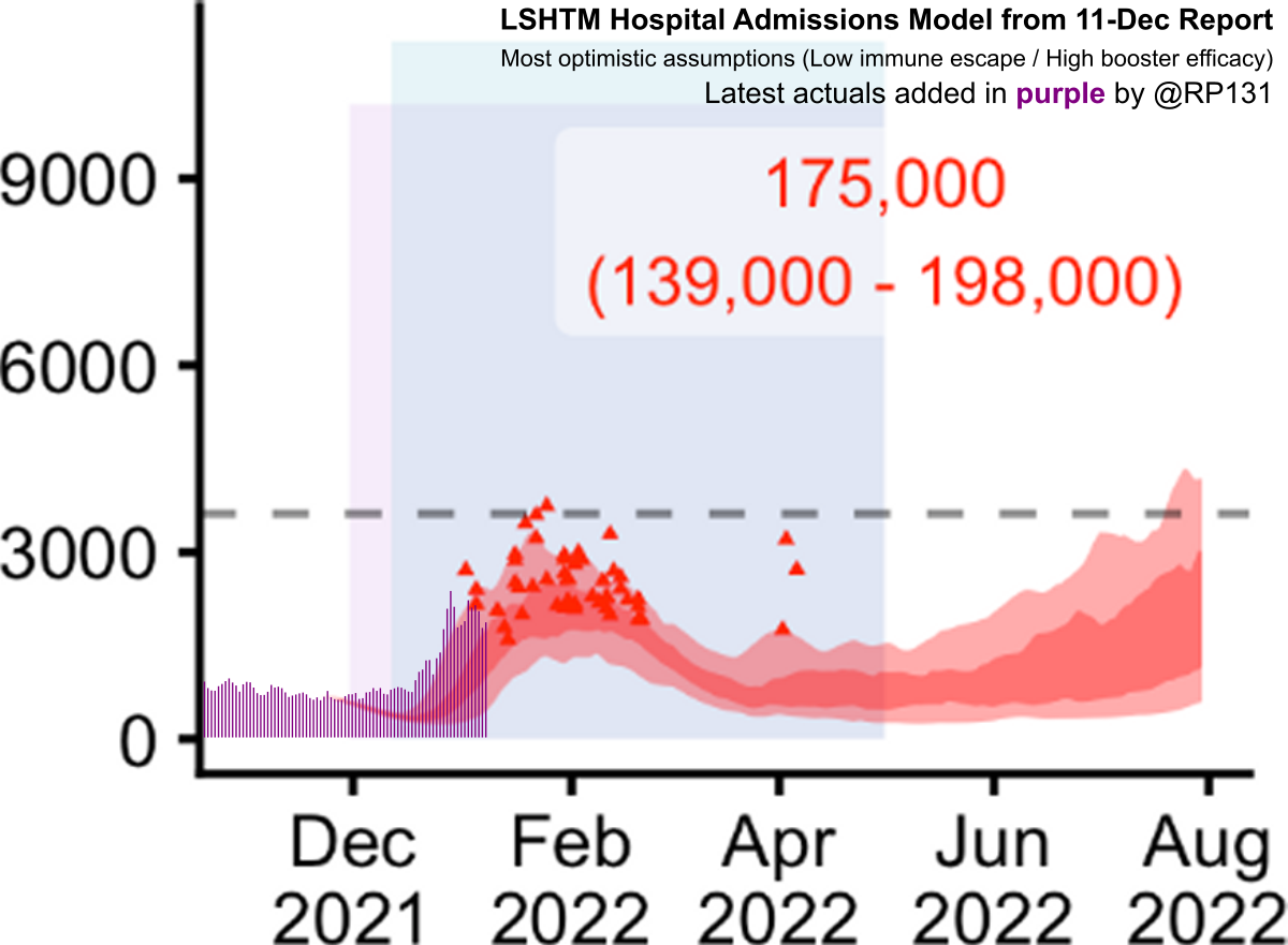 [25/28] The most optimistic models for Admissions / Deaths from the 11-Dec LSHTM report on potential consequences of Omicron, with latest actuals applied.