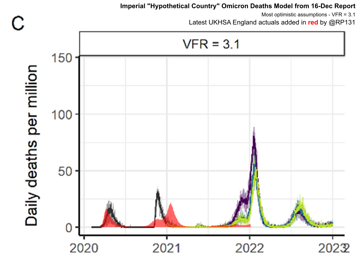 [26/28] Imperial "Hypothetical Country" Omicron Deaths Model from 16-Dec Report with latest England actuals applied in red. A bit rough due to low resolution input image but good enough to illustrate how the model doesn't match England reality.