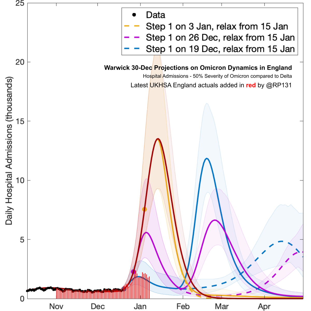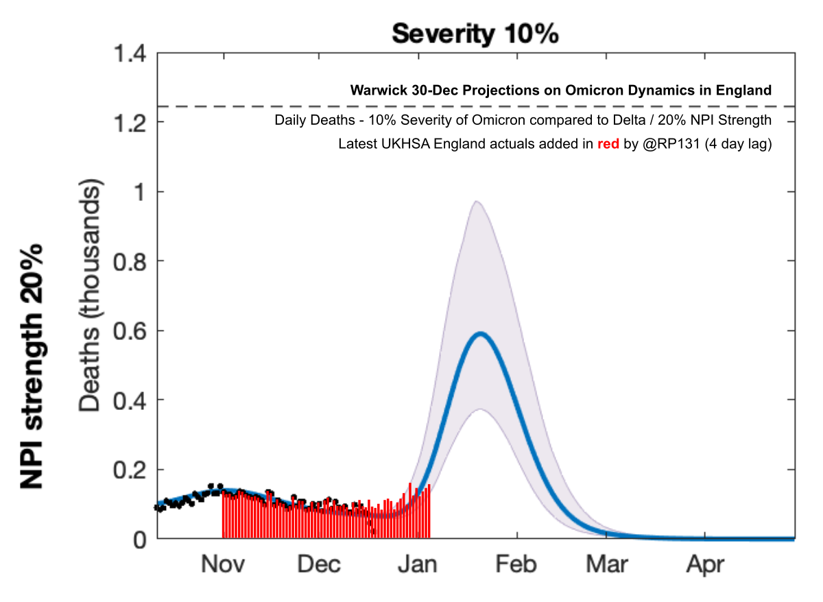 [27/28] Warwick 30-Dec Projections based on Early Omicron Variant Dynamics in England with latest UKHSA actuals applied in red. I think it says that if Omicron is half as bad as Delta then with no further restrictions (dark red line) we'll have 1000 deaths per day by 7th January.