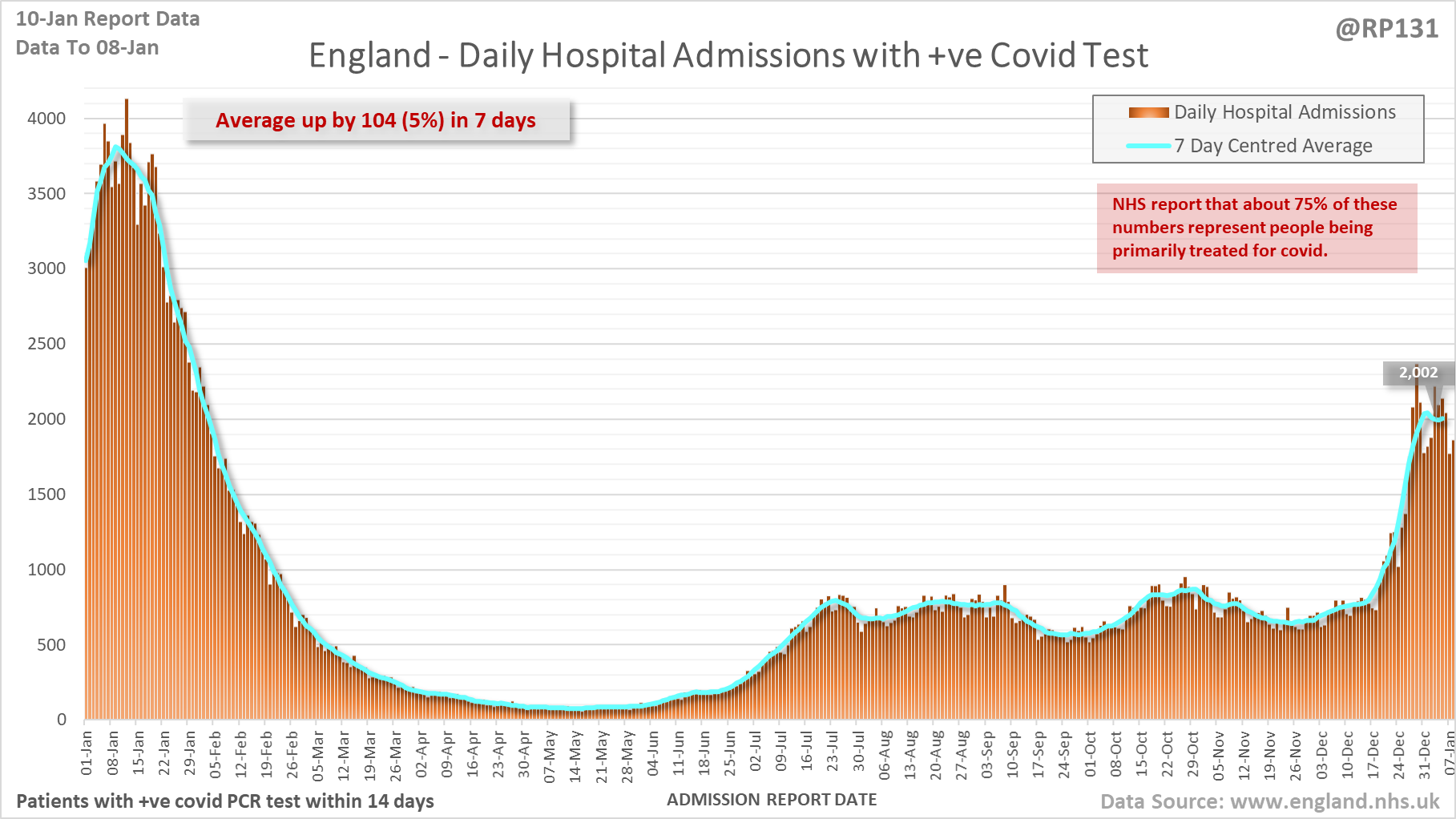 The 7 day average is now 2002, an increase of 104 (5%) in the last week.
