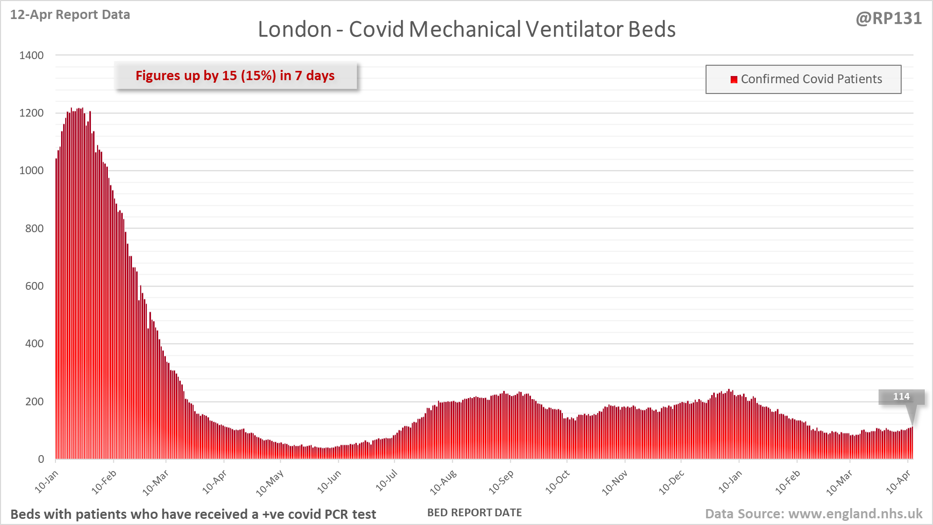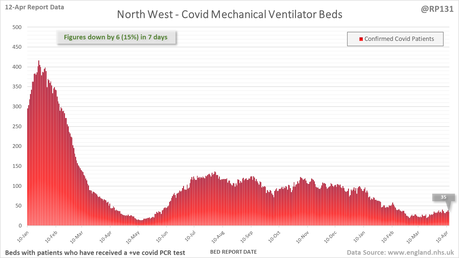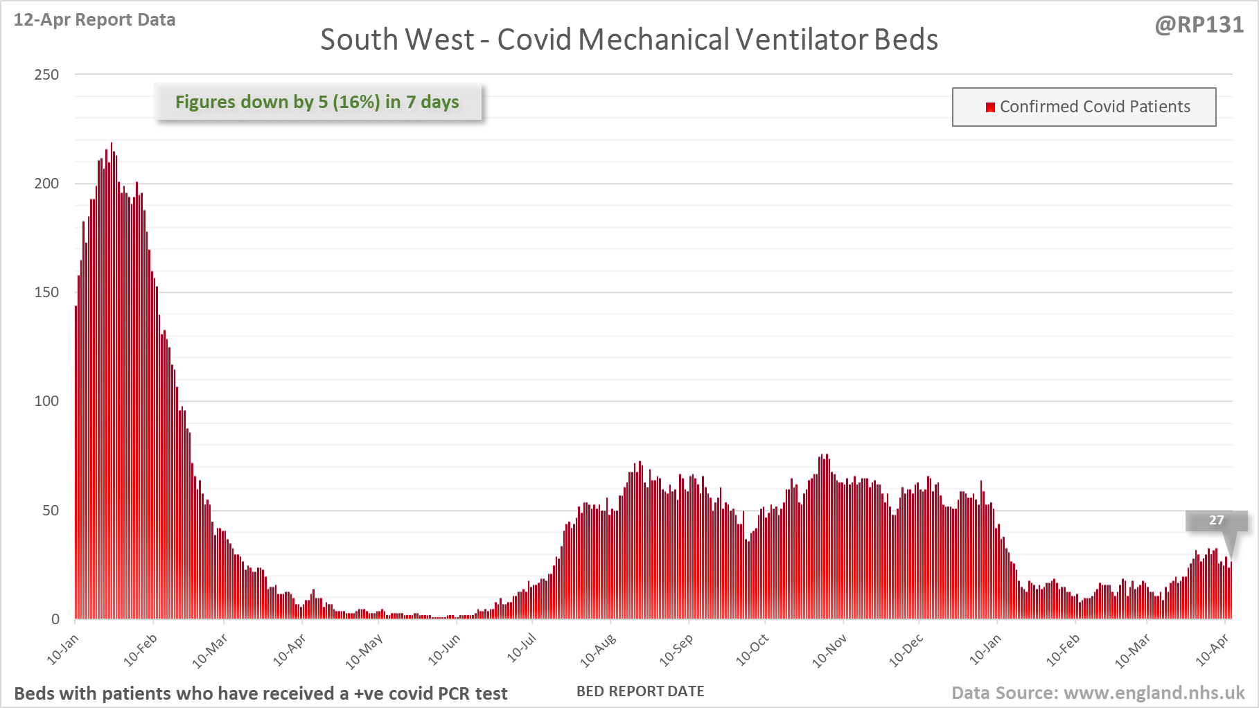 [7/27] Latest view on England mechanical ventilator beds (with a positive covid test), as of 8am on 12-Apr.
